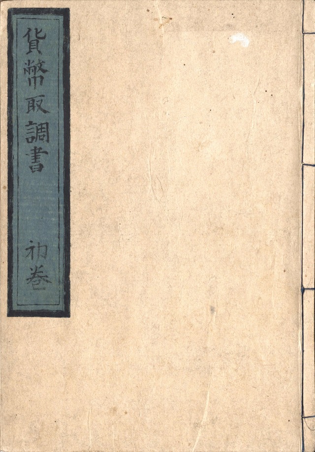 ★貨幣取調書 【判型】半紙本1冊。縦229粍。 【作者】久世治作・村田理右衛門(会計局貨幣調方)編。 【年代等】慶応4年4月刊。官板。[京都]井上治兵衛ほか売出。 【備考】分類「貨幣」。慶長金・武蔵判・乾字金以下、当時流通していた種々の金貨について、量目と成分の内訳を示し、「此通貨」との交換額を示した一覧書。寛永濤銭・寛永銅銭・文久銅銭についても、改訂した通用額を示す。巻末に「内国金貨幣表」「内国銀貨幣表」「外国金銀貨幣表・外国銅銭表」「洋銀(メキシコドル)一枚ト銅銭量ノ比較表・我一分銀三枚ト通用銅銭ノ比較表・我銅銭類百枚之量試数表・百文銭一枚ノ量ト小銅銭通用ノ比較表」を付す。巻頭に悪金吟味法の解説あり。巻頭に太政官の触書あり、全文「大政御一新ニ付宇内貨幣之定価御吟味之上古今通用金銀銅銭等別紙之通リ被仰出候間支配末々迄不漏様可相触者也/慶応四年辰閏四月 太政官」。各貨幣表の左下版外「慶応四年辰四月 会計局 貨幣調方 久世治作/村田理右衛門」。後表紙見返に刊記「官版 不許翻刻/御用御書物所/〈東洞院三条上ル〉村上勘兵衛/〈堀川二条下ル〉井上治兵衛」(西尾市岩瀬文庫・古典籍書誌DB)。SE02388