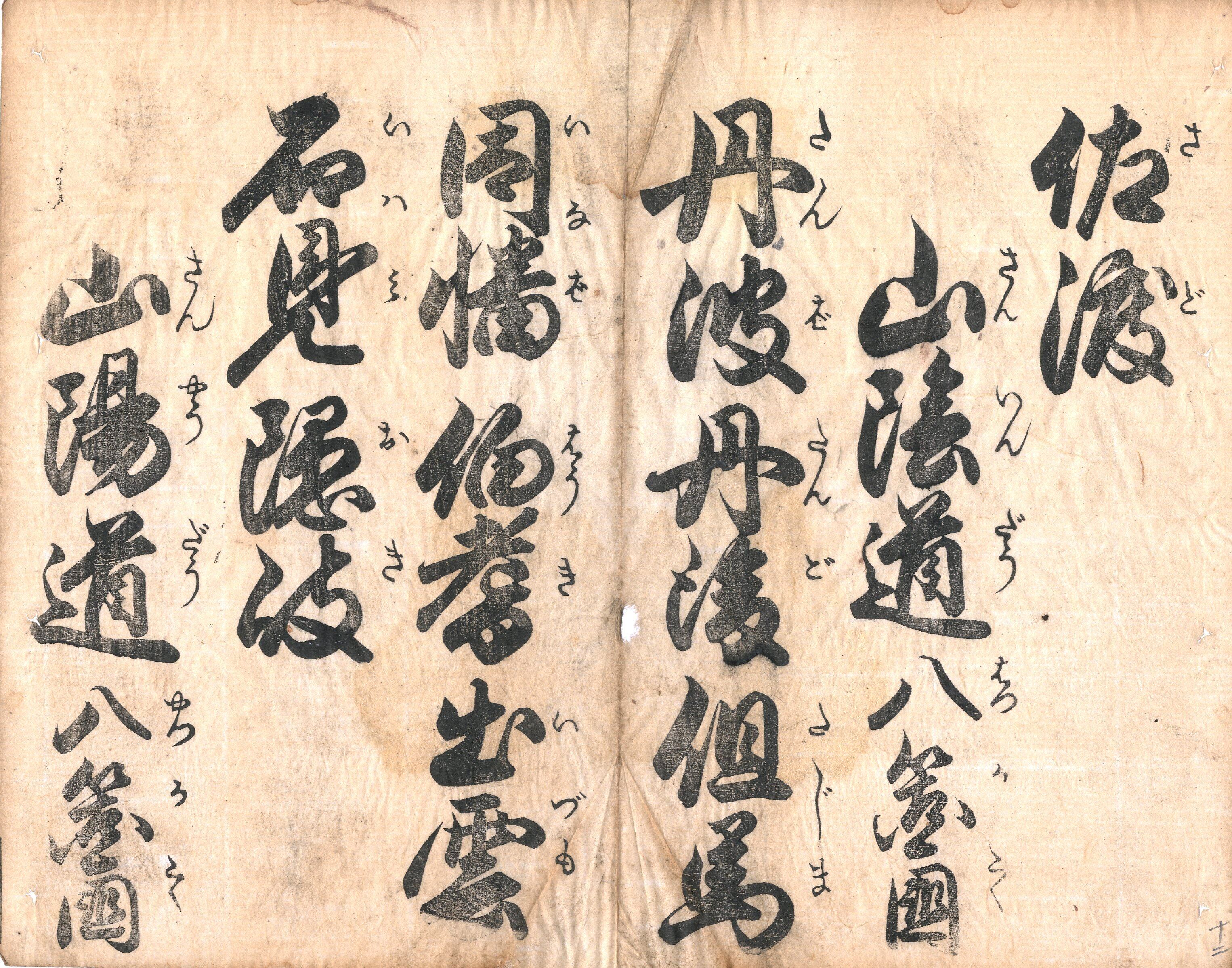【備考】分類「往来物」。袋綴じ展開収録。「名頭字尽」と「大日本国尽」から成る往来物。それぞれ大字・3行・付訓で記す。