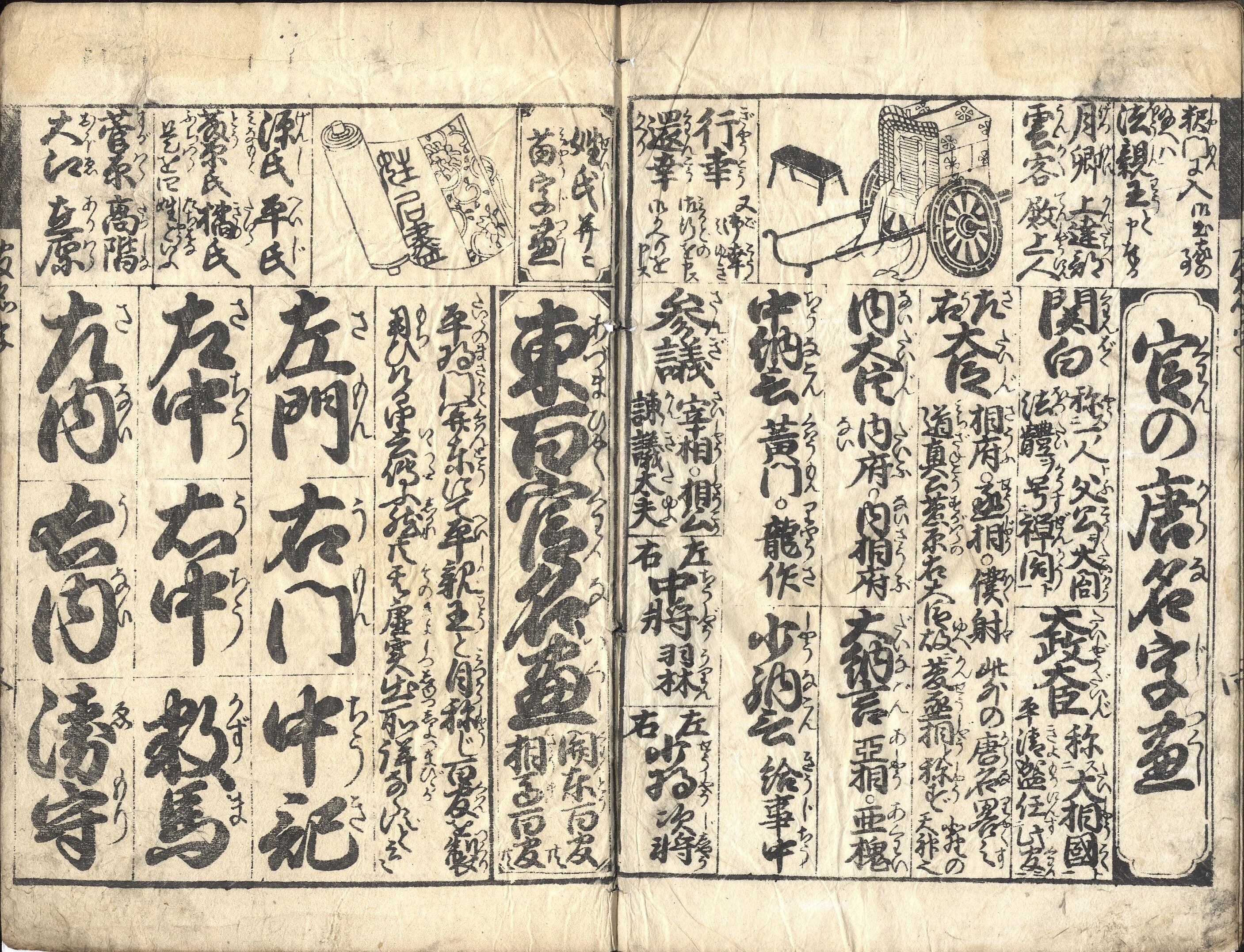 【備考】分類「往来物」。底本の裏表紙見返に文政13年閏3月の記載あり。江戸中期刊『官名字尽・東百官名』の改題本。「百官名字尽(ナジヅクシ)」「官の唐名(カラナ)字尽」「東百官名字尽」「官名下用字(カンミョウノシタニモチユルジ)」から成る。本文を大字・5行・付訓で記す。頭書に「職原字尽」等の記事を載せる。