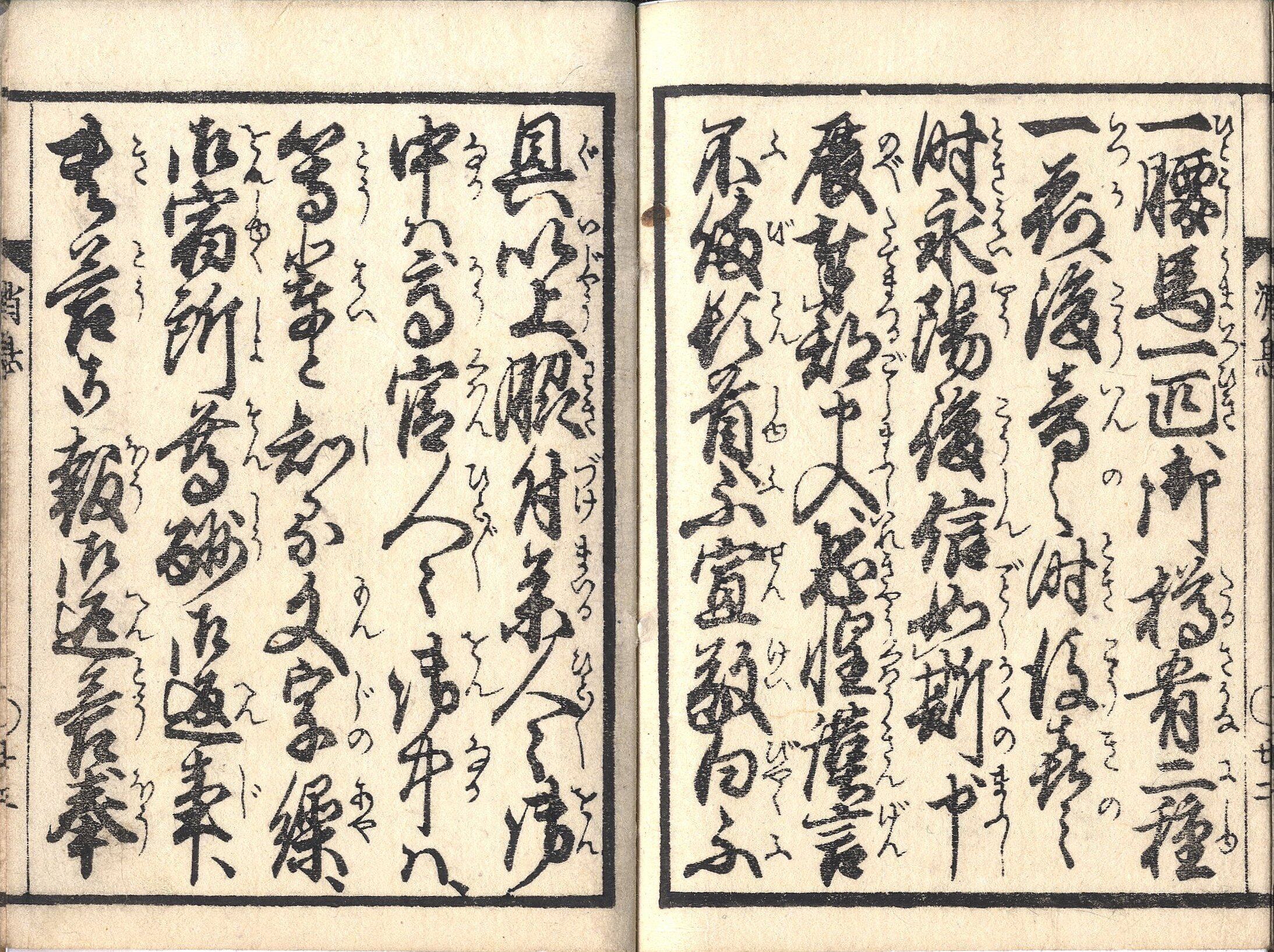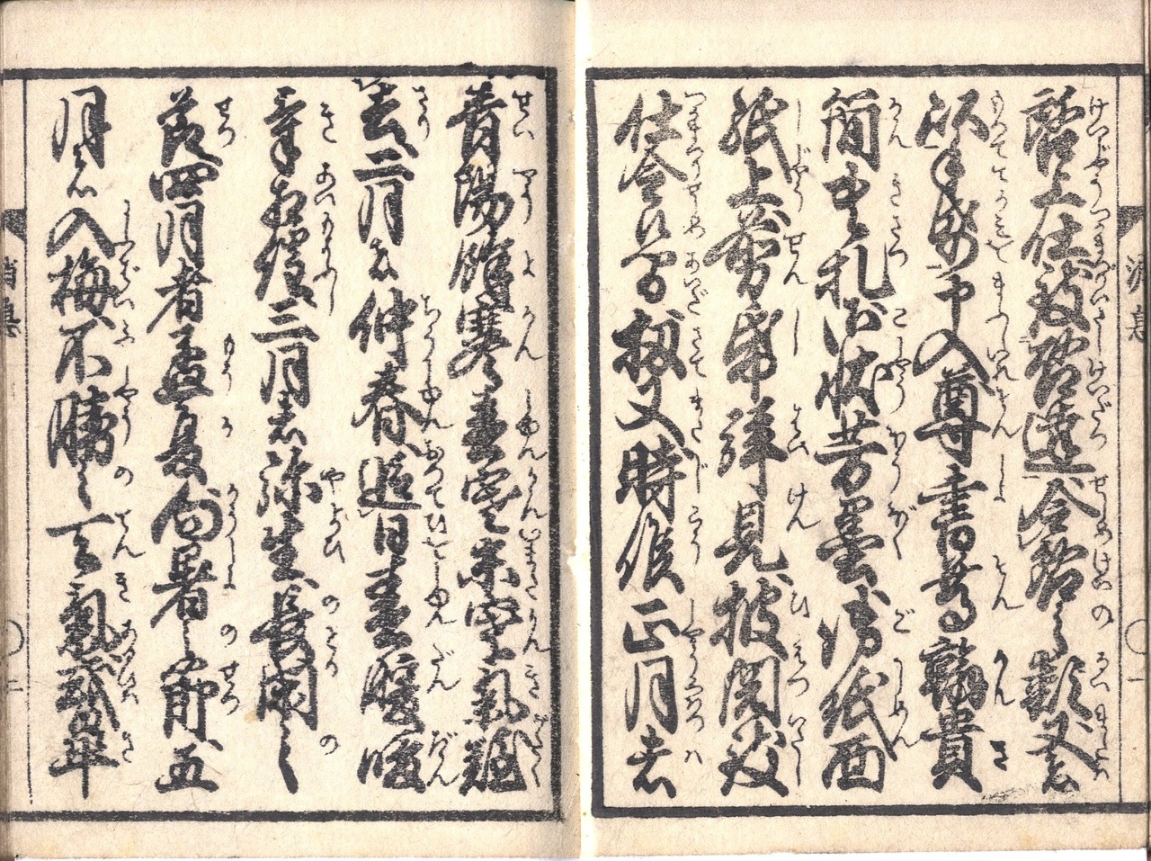 【備考】分類「往来物」、流布本『消息往来』を小本仕立てにした往来。見返しと口絵は色刷りで、「児童手習い図」「天満宮」「日本能書三筆」と、単色刷りの「永字八法」を掲げるほか、巻末に「十二月異名」「はな息にて時をしる歌・猫の目にて時をしるうた」を載せる。