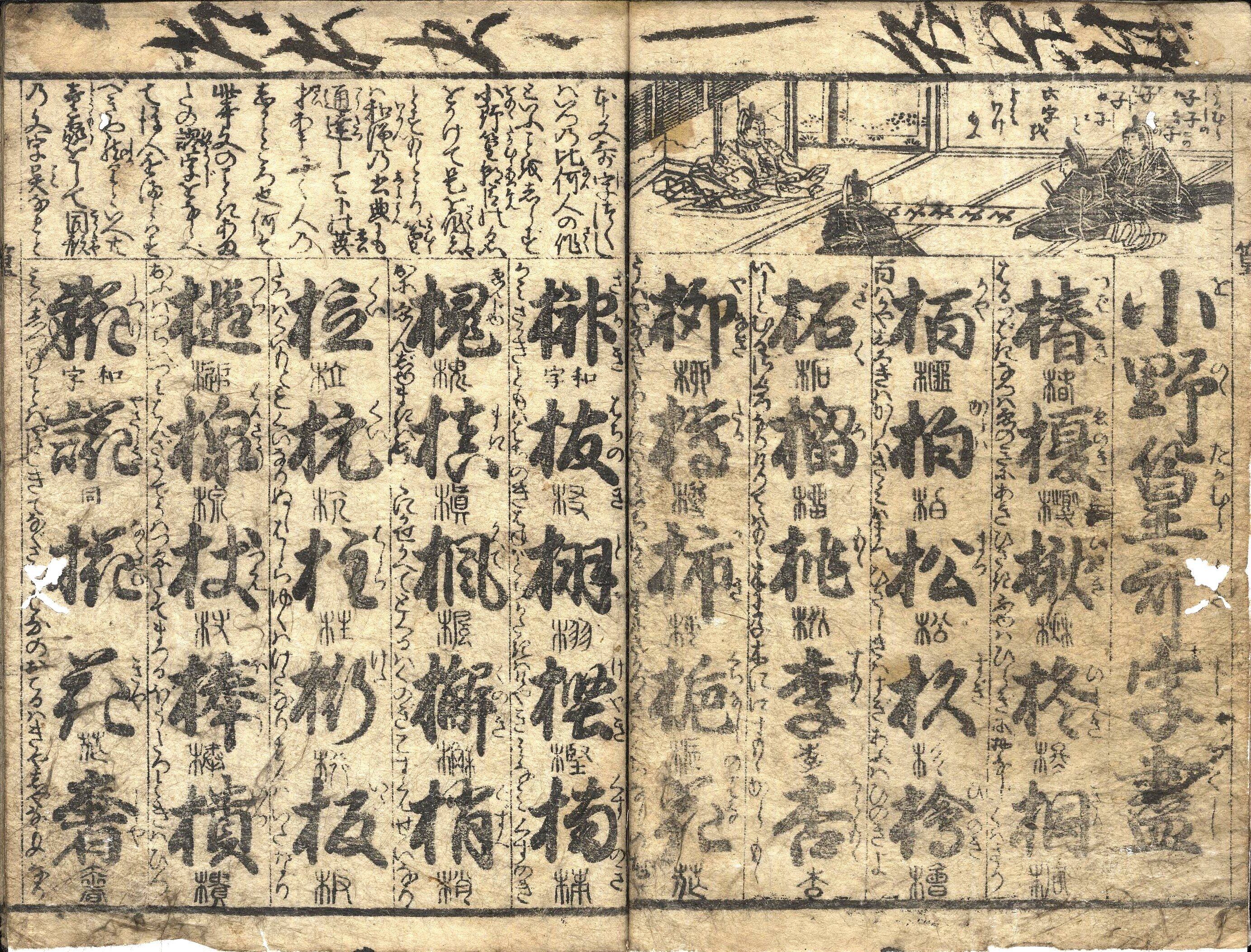 【備考】分類「往来物」。後半に同板別本も全冊収録した。本書は寛文2年板系統の『小野篁歌字尽』で、何らかの意味で類似している漢字を1行に並べ(これを仮に1単元と呼ぶ)、これに和歌を添えて記憶の便を図った往来。1単元の文字数は2-8字と様々で、全体の83%が、(1)偏・冠・構・旁など漢字の字形の共通点を基準にした単元である。このほかは、(2)「(たばかる)・姦(かしまし)・轟(とどろく)」などの俗字や、(3)「東来(ひらり)・西来(しゃらり)・左右袖(ともかふも)」などの世話字、また、(4)字形が似通った「末・未・賣・買」等の類字、さらに、(5)一つの物名を表す熟語のうち、その文字の一つが共通するものを選んで構成した同字を含む異語、(6)「美人草(びじんさう)・女郎花(をみなへし)」「鶏冠木(かへで)・鴨脚(いちやう)」のように奔放な連想によって連ねた2つの宛字などである。このような構成で、寛文2年本系統では「椿・榎・楸・柊・桐」以下全126単元・625字(重複分を除くと586字)を載せる。本往来は、江戸中期より明治初年にかけて著しい普及の足跡を遺した。