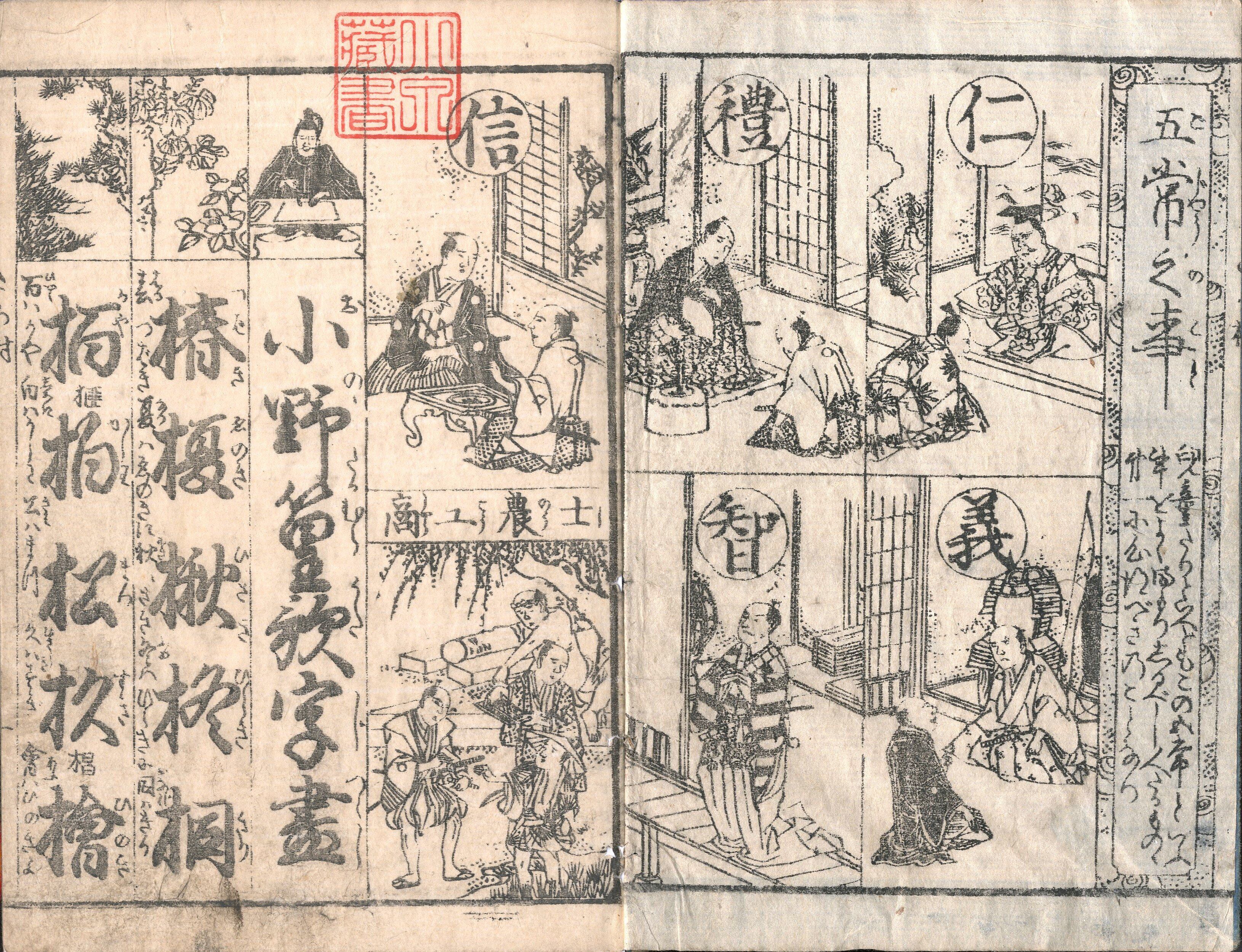 【備考】分類「往来物」。筆耕の異なる異板2種を全冊収録。「小野篁歌字尽」は、何らかの意味で類似している漢字を1行に並べ(仮に1単元と呼ぶ)、これに和歌を添えて記憶の便を図った往来。1単元の文字数は2-8字と様々で、全体の83%が、(1)偏・冠・構・旁など漢字の字形の共通点を基準にした単元である。このほかは、(2)「(たばかる)・姦(かしまし)・轟(とどろく)」などの俗字や、(3)「東来(ひらり)・西来(しゃらり)・左右袖(ともかふも)」などの世話字、また、(4)字形が似通った「末・未・賣・買」等の類字、さらに、(5)一つの物名を表す熟語のうち、その文字の一つが共通するものを選んで構成した同字を含む異語、(6)「美人草(びじんさう)・女郎花(をみなへし)」「鶏冠木(かへで)・鴨脚(いちやう)」のように奔放な連想によって連ねた二つの宛字などである。このような構成で、寛文2年本系統では「椿・榎・楸・柊・桐」以下全126単元・625字(重複分を除くと586字)を載せる。底本は、この本文に頭書絵抄を添えたもので、見返に「五常之事」を掲げる。
