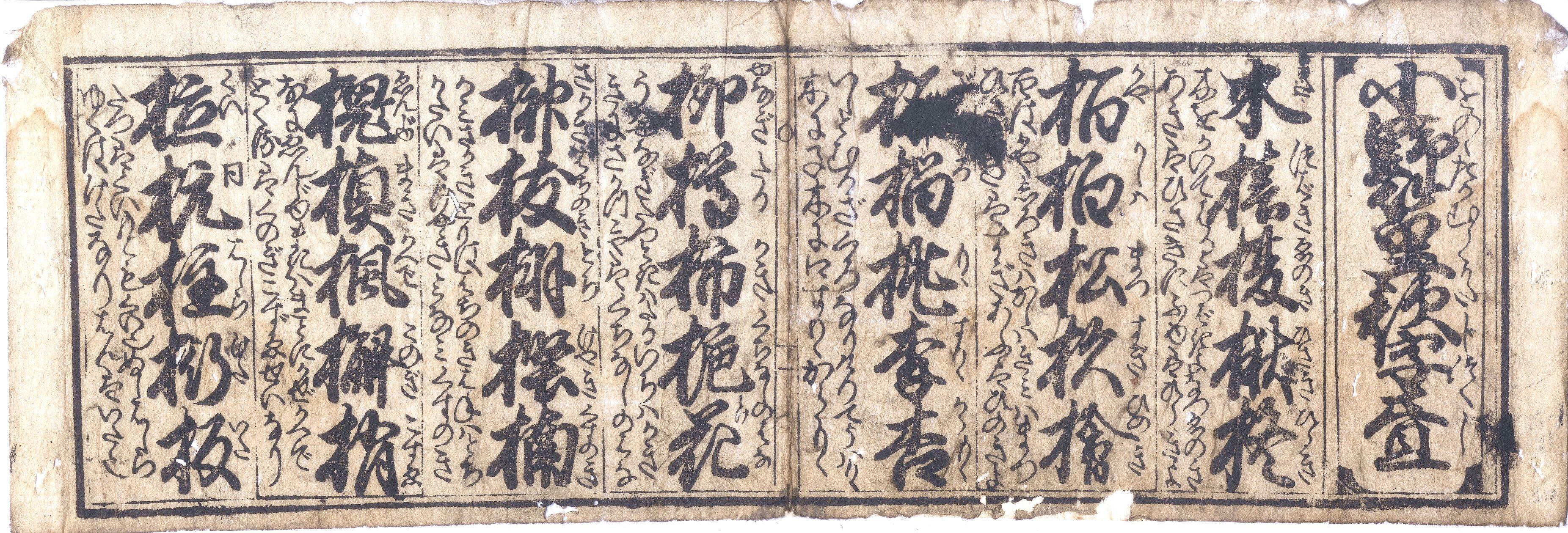 【備考】分類「往来物」。袋綴じ展開収録。寛文11年板系統の『小野篁歌字尽』(本文冒頭が「木」で始まる) に語彙を増補した往来で、同題の嘉永三年板とは別内容。まず、「木・椿・榎・楸・柊」以下127行622字から 成る寛文11年系統の増補『歌字尽』で、本文を大字・4行・付訓で記し、各行左端に暗誦用の和歌を小字・2 行書きにする。なお、明治初年後印の旧謙堂文庫本には、後半に(1)家財・諸道具・日用品・衣類を主とす る「万字つくし」、(2)漢字の部首集である「片造冠沓構」、(3)「名頭字」に五性の区別を付記した「人の名を 付頭字・五性相生にて付る」、(4)「摂政」以下諸官の名称を列記した「百官類」、(5)「十宗」および僧侶官位 の名称である「諸宗名目」、(6)「細川・水野・三浦」以下の名字集である「名字類」、(7)「七ッいろは」等を増 補してある。