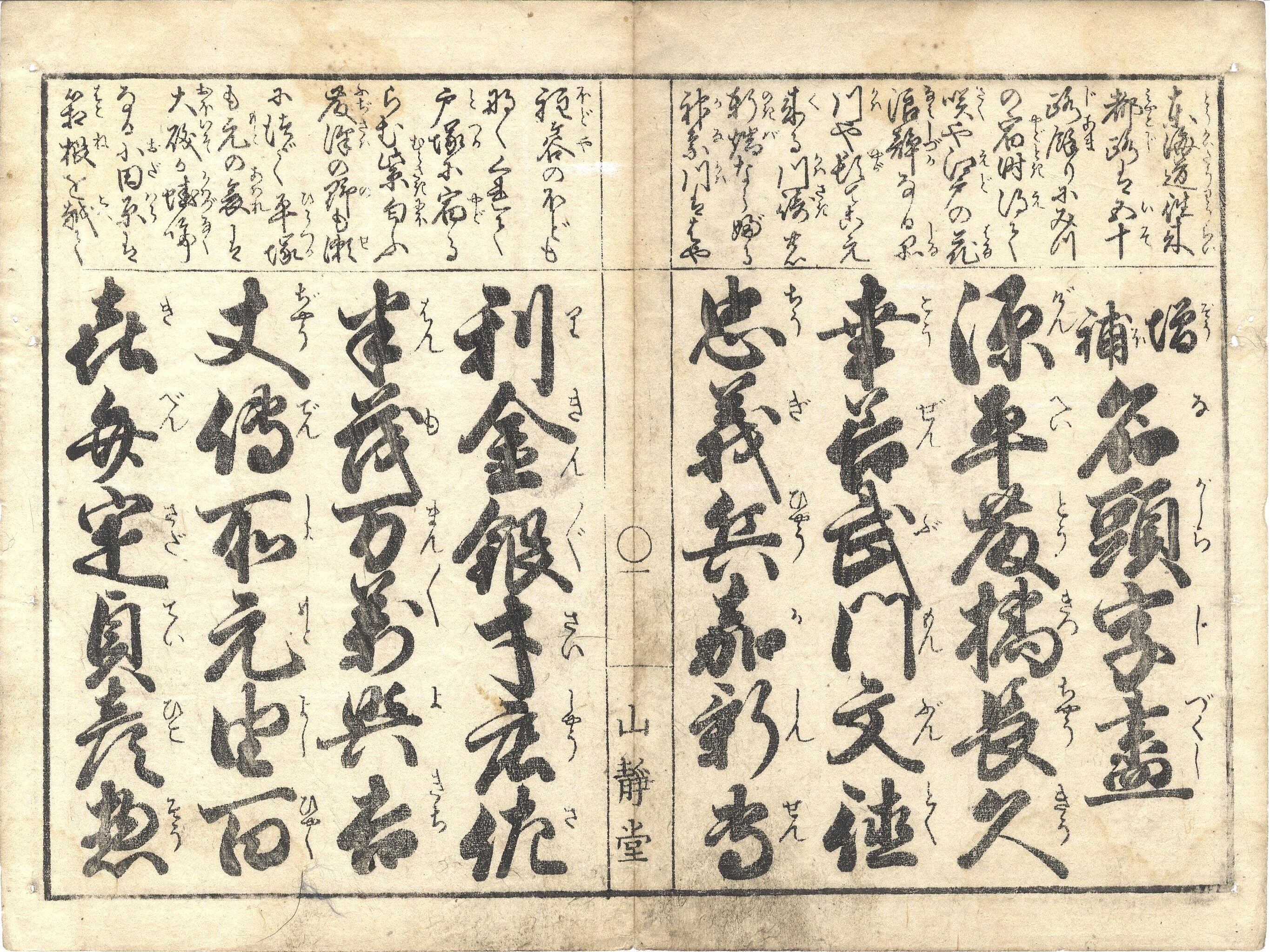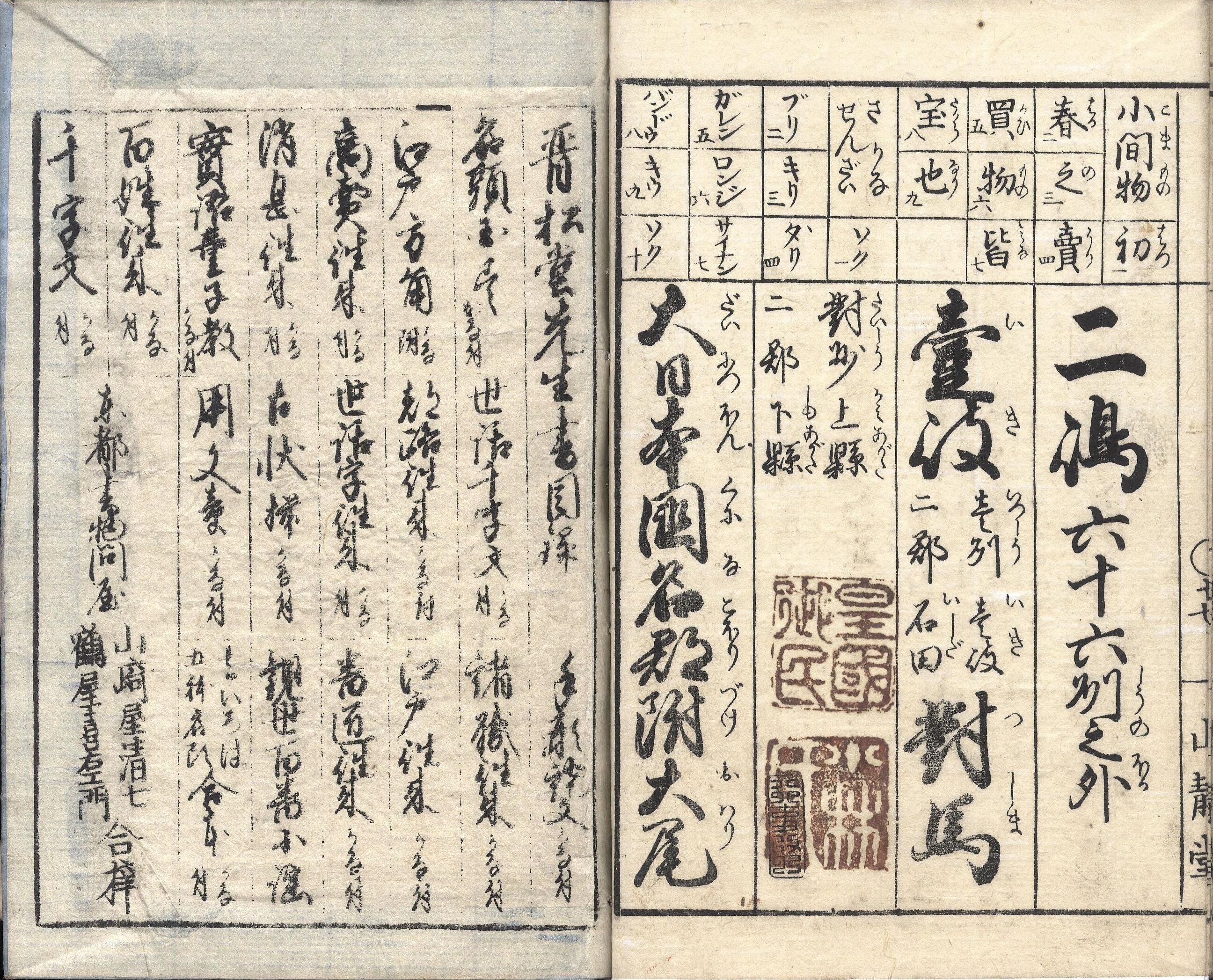 【判型】中本1冊。縦174・178粍。【作者】野口晋松堂書。【年代等】江戸後期刊。[江戸]鶴屋喜右衛門ほか板。【備考】分類「往来物」。袋綴じを展開した画像と通常の画像の両方を別々の底本で収録した。「名頭」は、俗称の頭字に用いる漢字を列挙した往来。中国・宋代に編まれた『百家姓』の影響も考えられるが、本書よりも『名字尽』や『苗字尽』の方が『百家姓』に近い。近世刊本では、万治2年刊『童訓集』所収の「名頭」が最初で、「勘・甚・喜・平・勝・久・茂・伝…」以下30字を列挙する。しかし、近世後期の流布本(単行刊本)はほとんど例外なく「源・平・藤・橘…」で始まり「…殿・様」等で終わるもので、収録漢字・字数ともに諸本によってかなりの異同がある(100~300字程度)。また「国尽」は、各国名や郡数を五畿七道毎に掲げたもの。