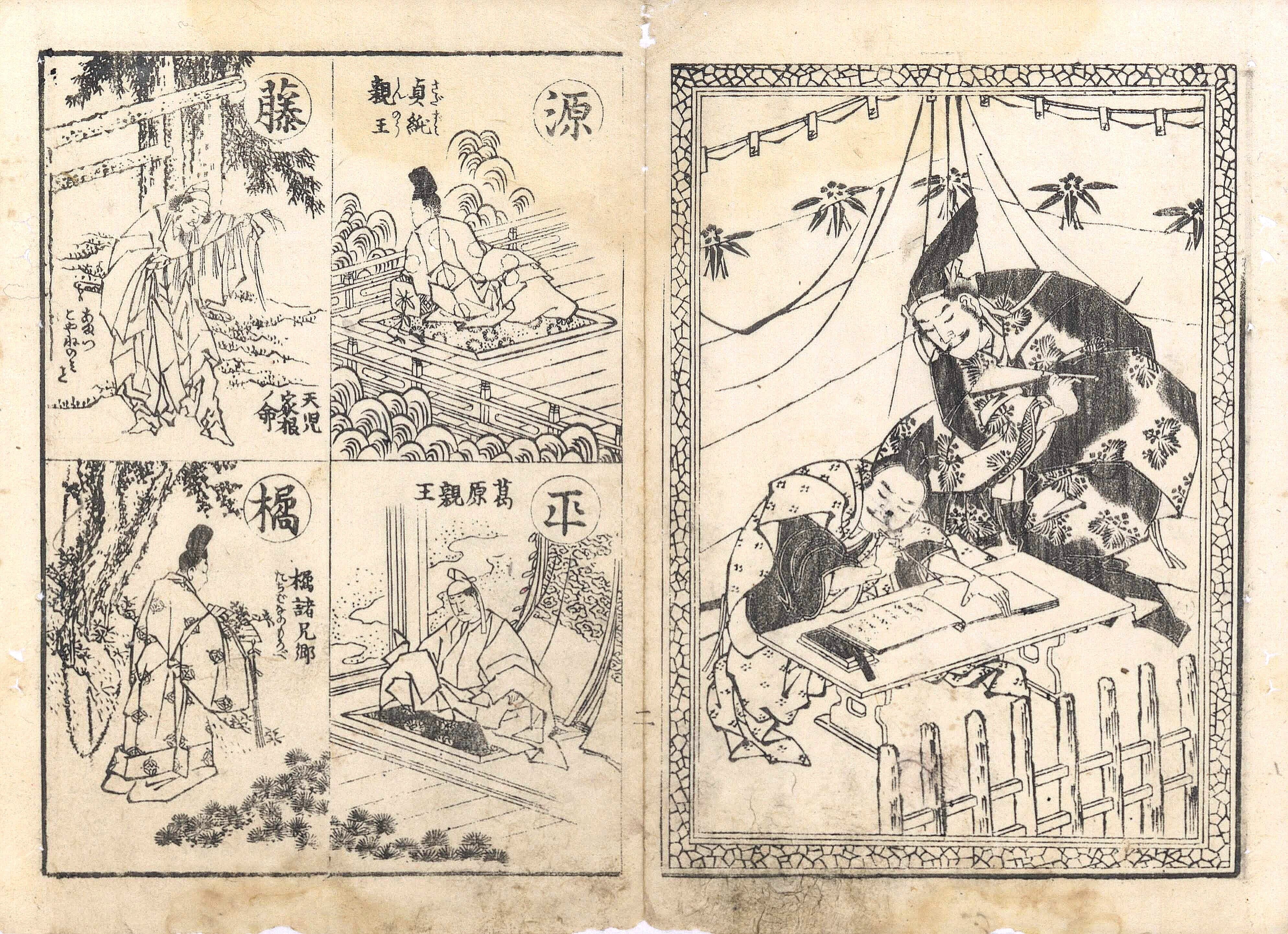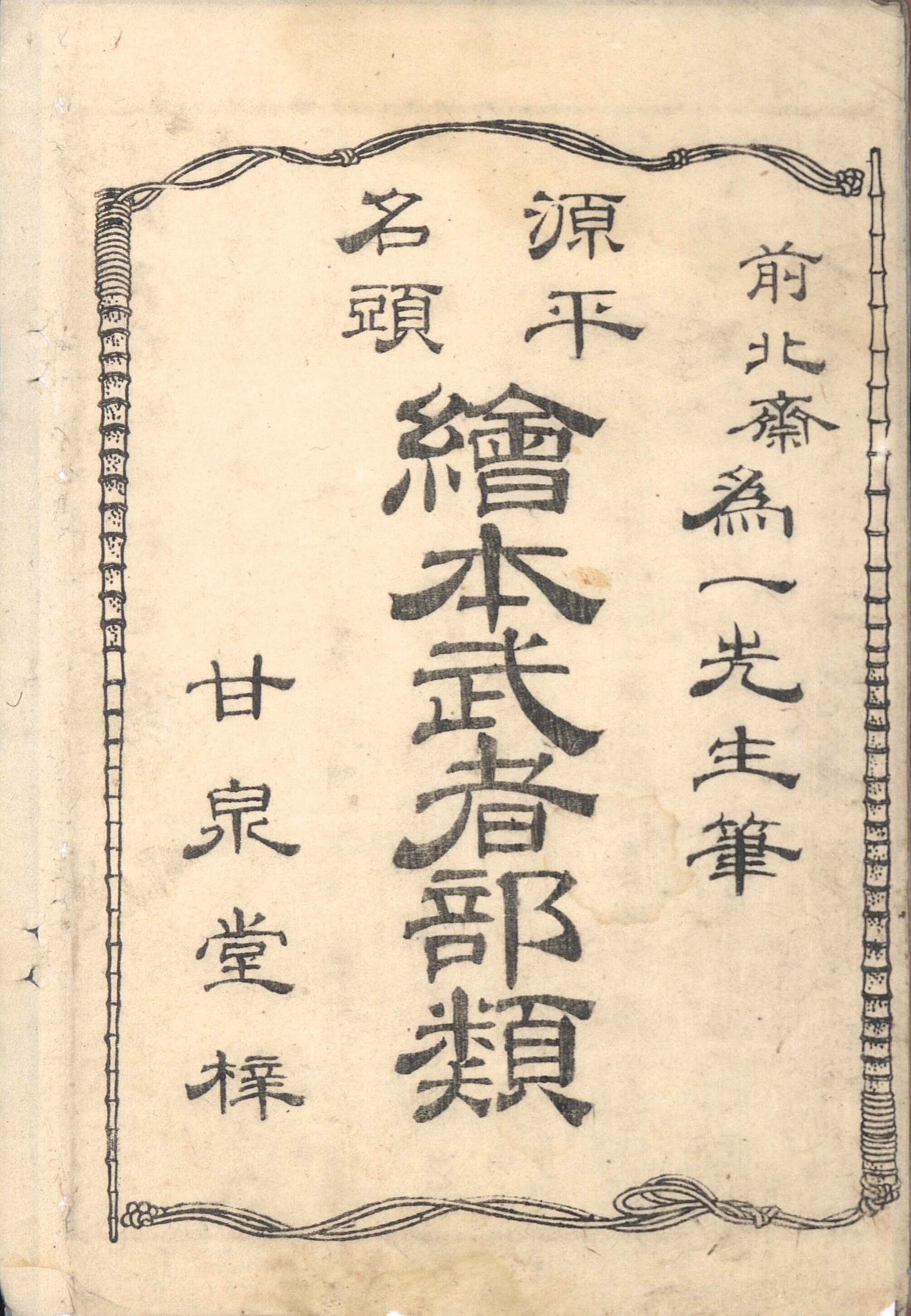 【備考】分類「往来物」。同板3種を全冊収録(単色刷1本は袋綴じ展開収録)。枡形に近い折本(多色刷)と中本和綴本(単色刷)の2種がある。『〈絵本早引〉名頭武者部類[源平名頭武者部類]』は、いわゆる『名頭字尽』本文を構成する単漢字毎に関連の武者絵を描いた絵本。その漢字を含む人名、あるいは単漢字に象徴される人物などを各漢字につき1名ないし数名ずつ描く。例えば冒頭の「源・平・藤・橘」の場合、「源」は清和源氏の祖である貞純(さだすみ)親王、「平」は桓武平氏の祖である葛原(かつらはら)親王、「藤」は藤原氏の祖である祖神天児家根ノ命(あまつこやねのみこと・天児屋命(あめのこやねのみこと))、「橘」は橘諸兄(たちばなのもろえ)を描くが、このような場合のほかに、「斧」は怪童丸、「力」は朝日奈、「雪」は北条時頼、「浪」は那須与市といった伝説からの連想によって描いた箇所もある。人物画は大半が和漢の武人であるが、一部、公家や僧侶、女性なども含む。