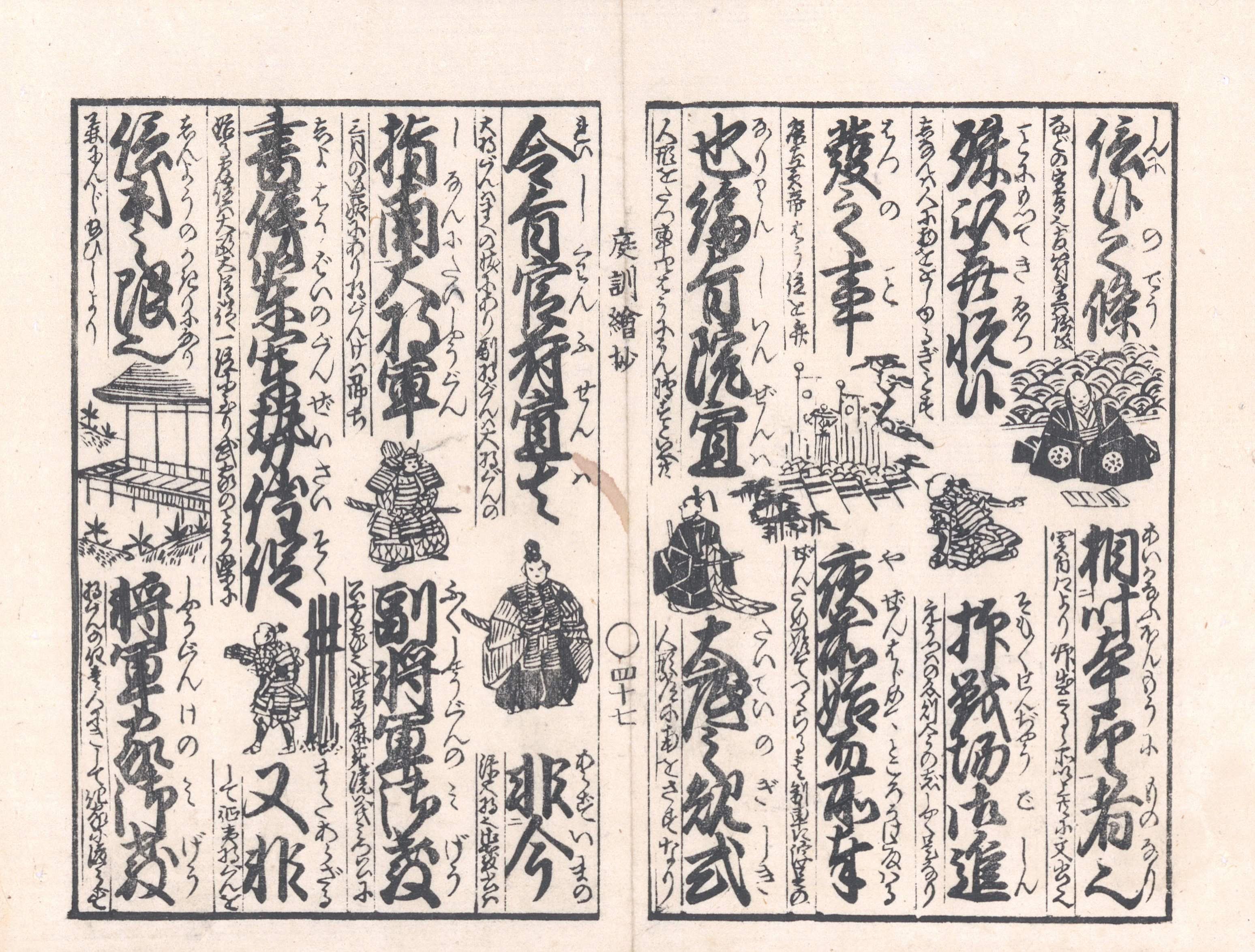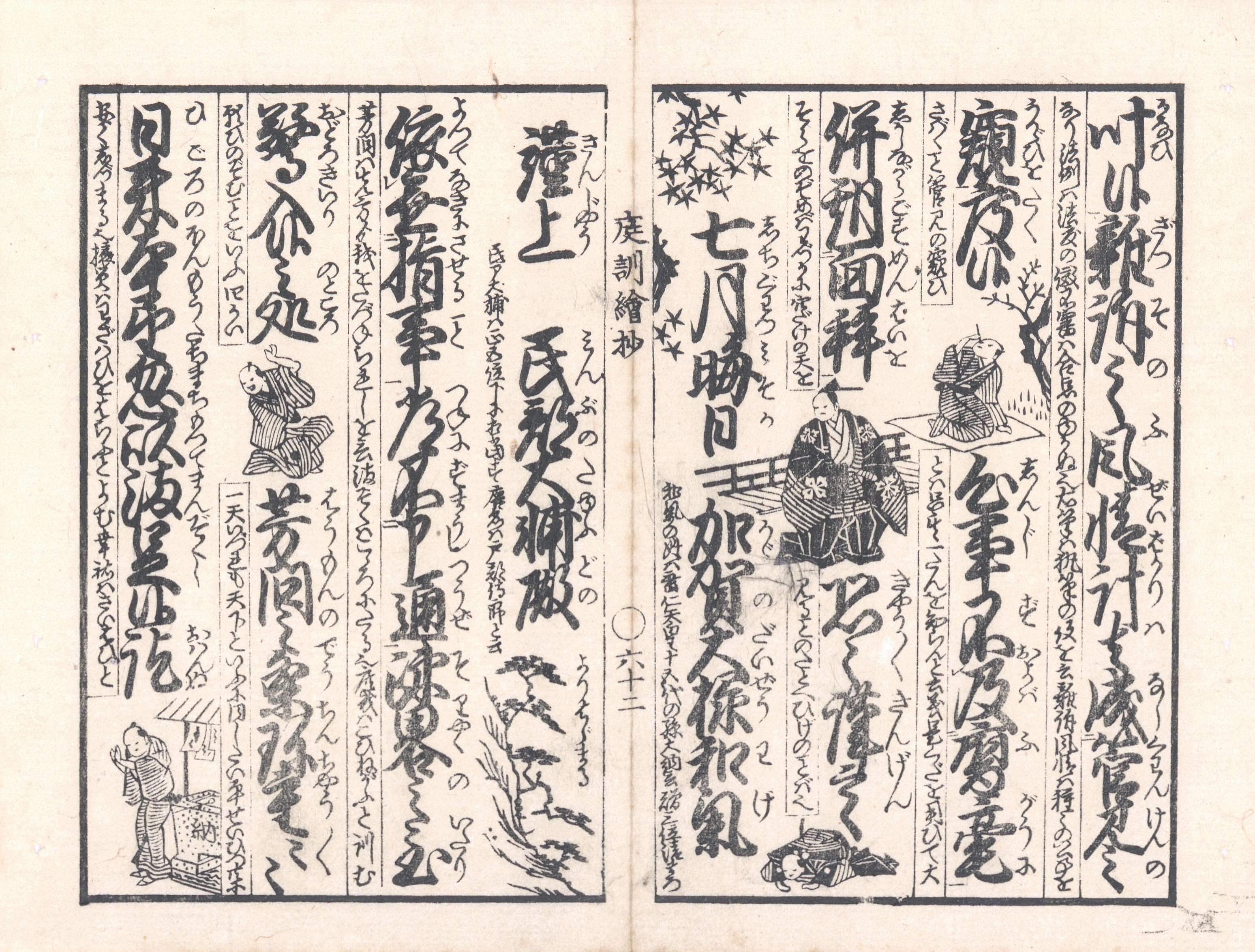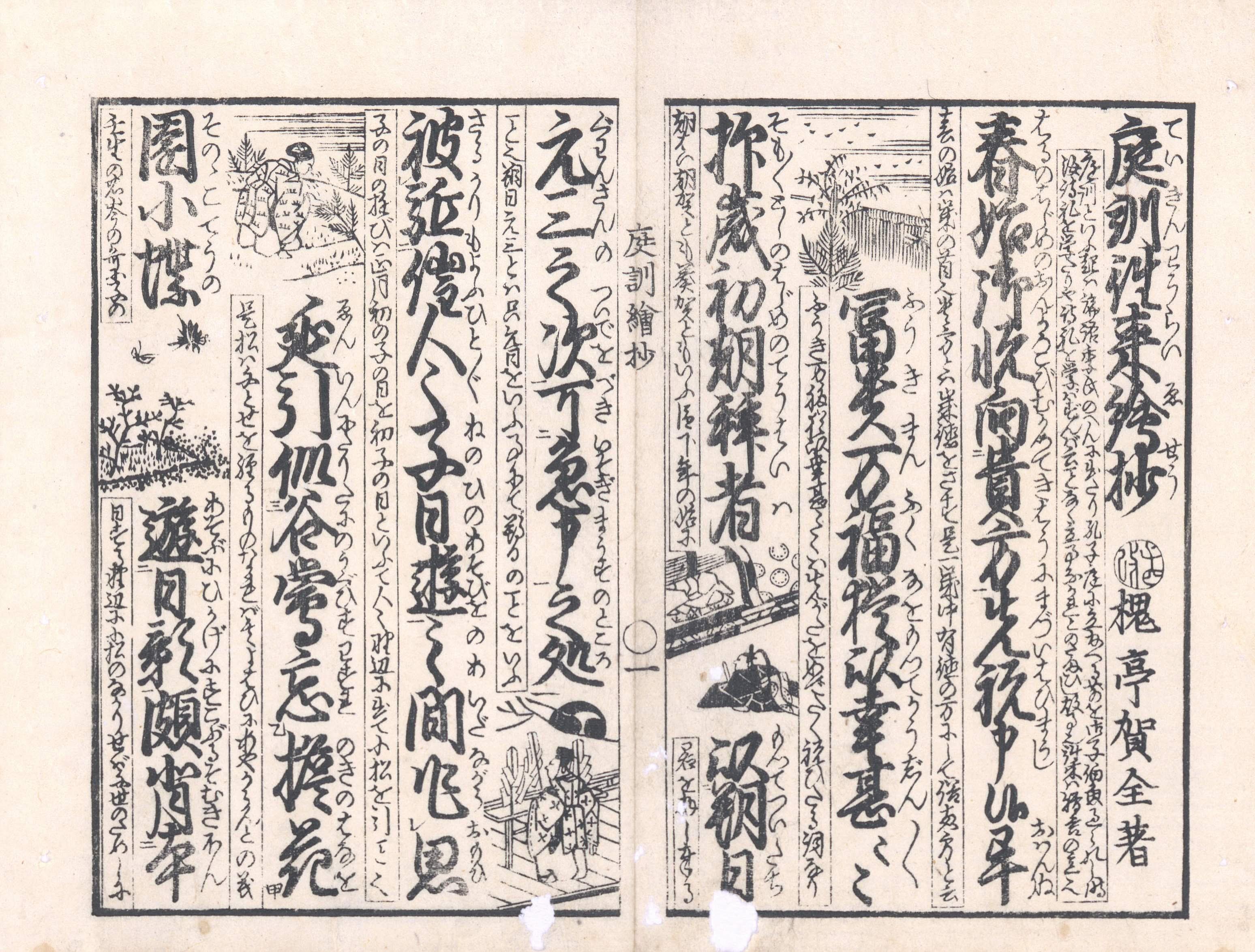 【備考】分類「往来物」。江戸末期~明治初年後印本など3種を袋綴じ展開収録。『庭訓往来絵抄』は、幕末に吉田屋文三郎がシリーズで刊行した絵抄物の一つ。『庭訓往来』の本文を大字・4行・付訓で綴り、文中に小さな挿絵を数多く挿入し、さらに本文の左側に「春の始は歳の首也…」といった簡単な注を添える。
