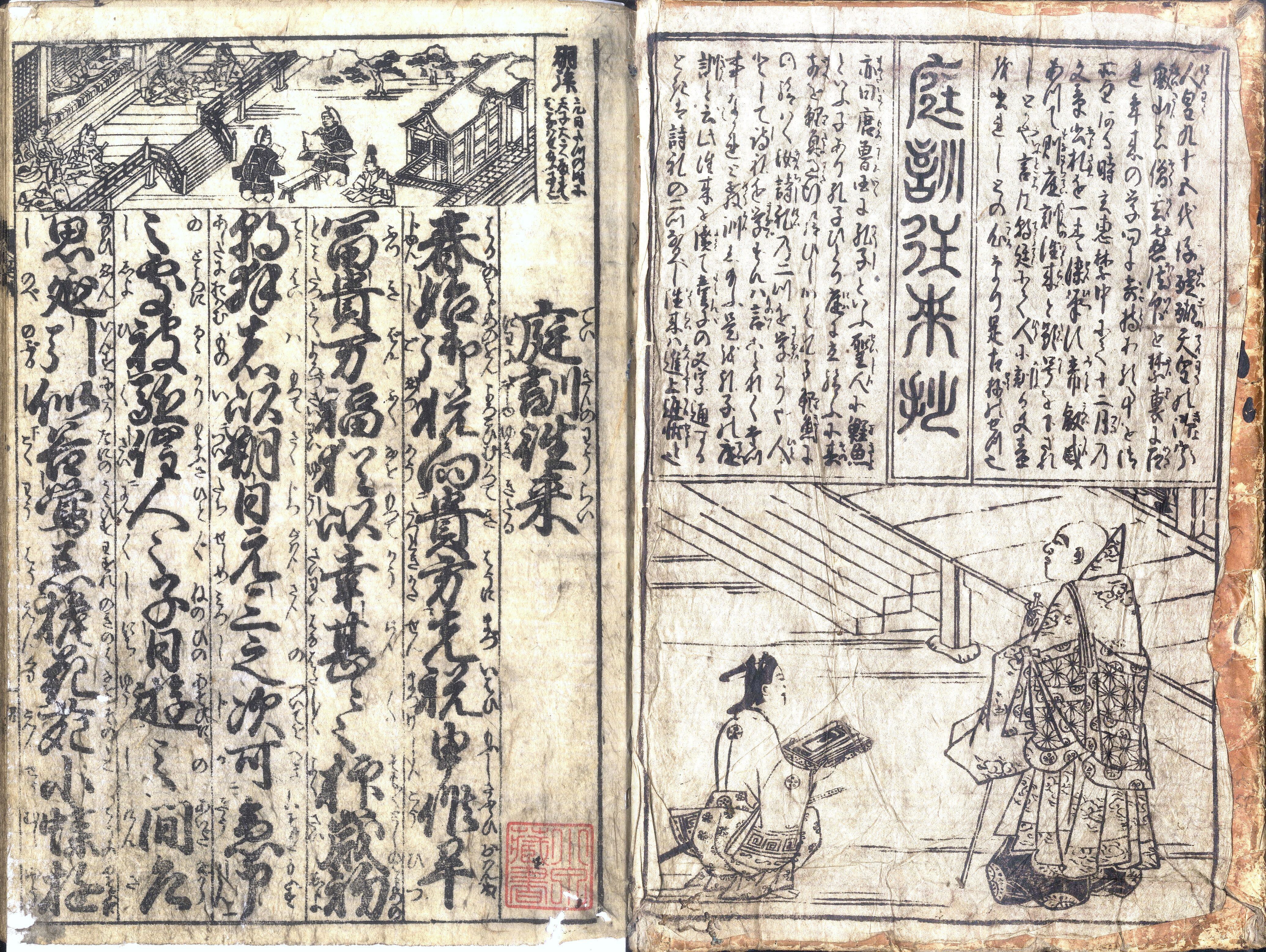 【備考】分類「往来物」。袋綴じ展開収録。原装の別本も抄録。書名は同板別本の原題簽による。『庭訓往来』本文に両点(音訓)を付け、頭書に本文要語の絵解きである絵抄を施したもの。『庭訓往来』は、古写本のみで約70種、近世より近代初頭にかけての板本は約300種に上り、中世から明治初年に至るまで最も普及した往来物の一つ。1カ月往返2通ずつ1年24通、これに単簡1通(7月状または8月状)を加えた計25通の手紙文より構成される。内容は、武家および上層・庶民の社会生活を中核として新年の会、詩歌の会、地方大名の館造り、領国の繁栄、大名・高家の饗応、司法制度・訴訟手続、将軍家の威容、寺院における大法会、大斎の行事、病気の治療法、地方行政の制度等を主題とする手紙で、各手紙とも類別単語集団を収める(衣食住370語、職分職業217語、仏教179語、武具75語、教養46語、文学16語、雑61語、計964語)。