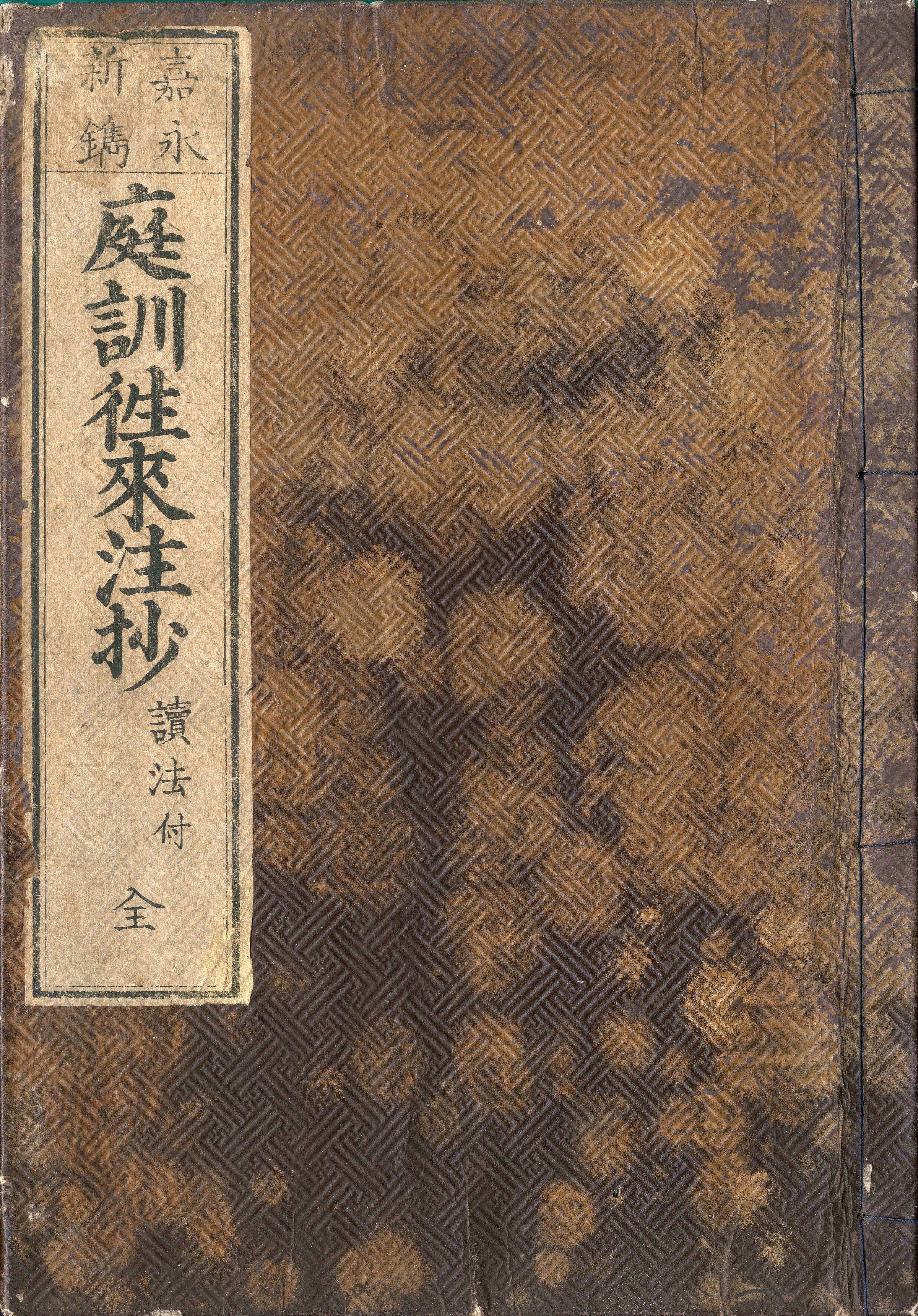 【備考】分類「往来物」。同板3種を収録(冒頭は袋綴じ展開収録)。本書は、天保6年刊『庭訓往来註抄』、あるいはその模刻版・天保9年刊『庭訓往来抄』に頭書読方を施した注釈書。『庭訓往来』の各状を数段に分けて行書・大字・8行・無訓で記し、段毎に漢字・平仮名交じりの2行割注を施す。施注は天保6年板に同じ。頭書に楷書・小字・15行・付訓の書き下し本文を掲げた点がほぼ唯一の変更点である。なお、刊記に「嘉永四年辛亥仲冬新板」と記すが、見返には「嘉永五壬子春新鐫」と記載する。