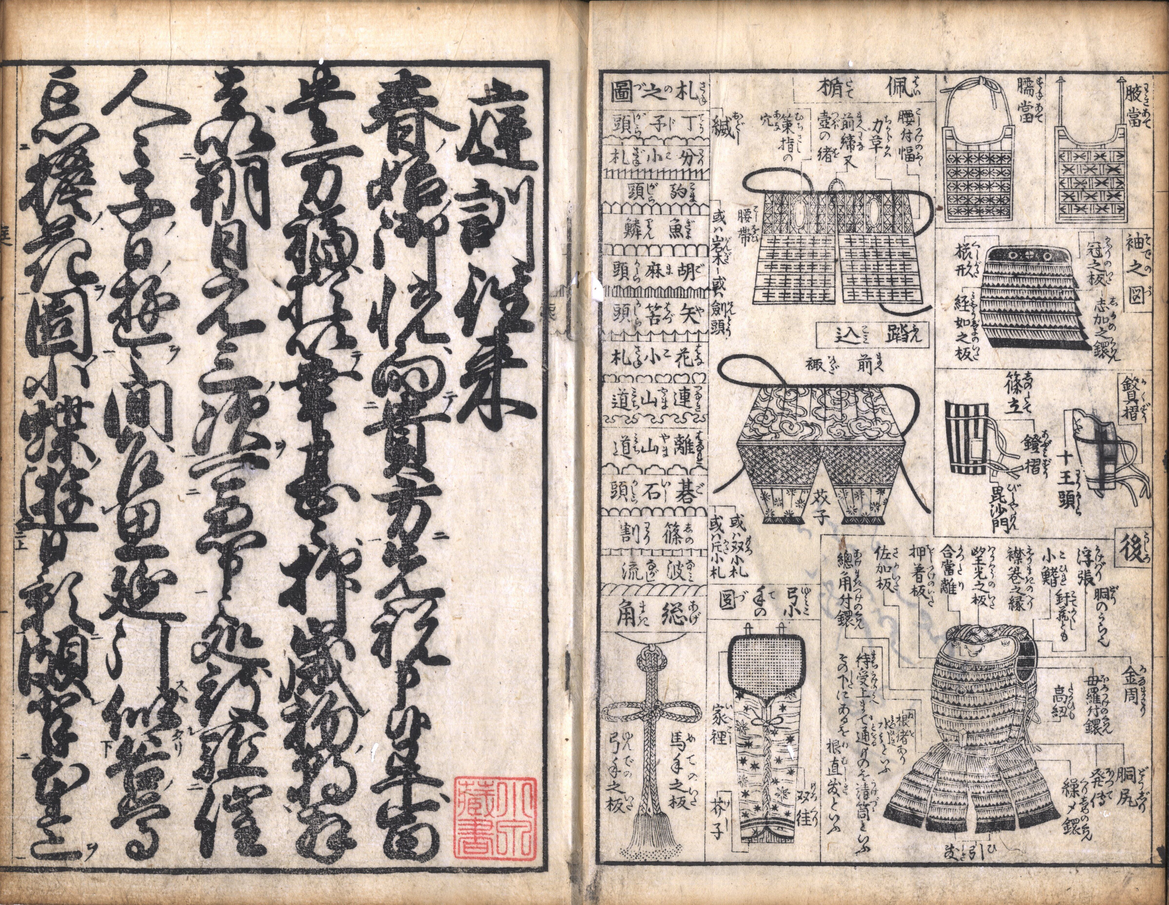 【備考】分類「往来物」。同板別本も抄録した。『庭訓往来万宝蔵』は、『庭訓往来』本文を大字・6行・無訓で記したもの。巻頭に甲冑図1丁を付す。『庭訓往来』は、古写本のみで約70種、近世より近代初頭にかけての板本は約300種に上り、中世から明治初年に至るまで最も普及した往来物の一つ。1カ月往返2通ずつ1年24通、これに単簡1通(7月状または8月状)を加えた計25通の手紙文より構成される。内容は、武家および上層・庶民の社会生活を中核として新年の会、詩歌の会、地方大名の館造り、領国の繁栄、大名・高家の饗応、司法制度・訴訟手続、将軍家の威容、寺院における大法会、大斎の行事、病気の治療法、地方行政の制度等を主題とする手紙で、各手紙とも類別単語集団を収める(衣食住370語、職分職業217語、仏教179語、武具75語、教養46語、文学16語、雑61語、計964語)。