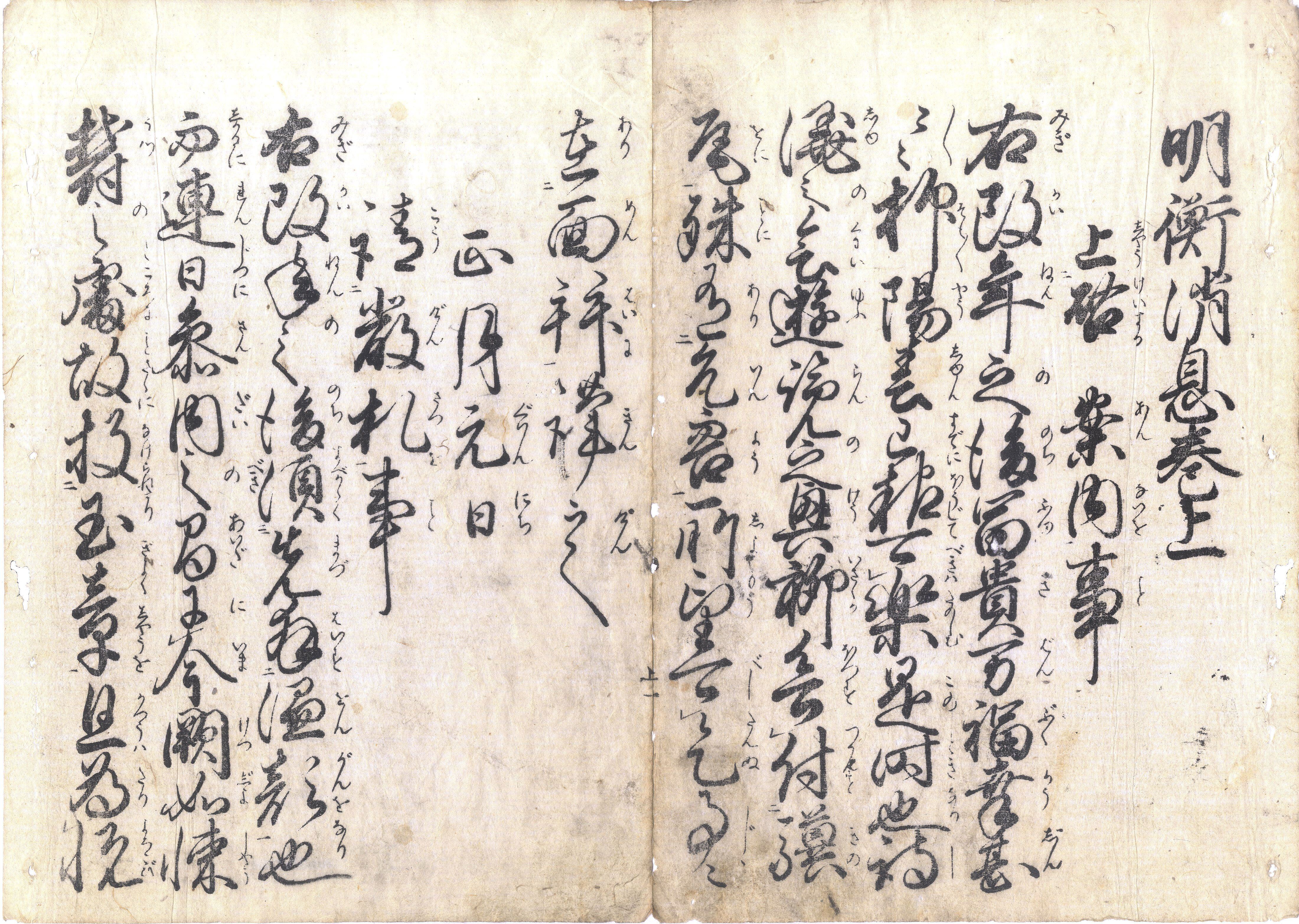【備考】分類「往来物」。江戸中期再刊本ほか3種で、冒頭の1本を全冊袋綴じ展開収録した。『明衡往来』(近世刊本)は、伝藤原明衡作、平安後期作の古往来で、本書は寛永19年刊本の後印本。『明衡往来』は、消息文例89条131通(または88条130通)を収めた古往来で、古写本とはやや異なる。第1条第1通より第23条第46通までは『群書類従』本(前項)と一致するが、これ以後に多くの相違があり、『群書類従』本とは別系統と見なすべきもので、その先蹤としては室町時代中期書『明衡消息抄』(謙堂文庫蔵)等や、寛永19年の刊記を持つ『明衡往来富貴大成』(2巻合1冊)等がある。近世刊本の嚆矢となった寛永19年板(西村又左衛門板)は有郭で、本文(89条131)を楷書に近い行書・大字・6行・稀に付訓で記し、所々割注を施す。その後、流布した江戸初期刊本(無刊年本・中川茂兵衛板)は、『寛文10年書目』に「振仮名付、三冊」と記された無郭の付訓本で、習字手本としての色彩が強く、本文(88状130通)を行書・大字・6行・付訓(総振り仮名)で記す(割注なし)。また、この両者は、ともに文政9年に北村曹七によって再刊されるなど江戸後期にも流布した。