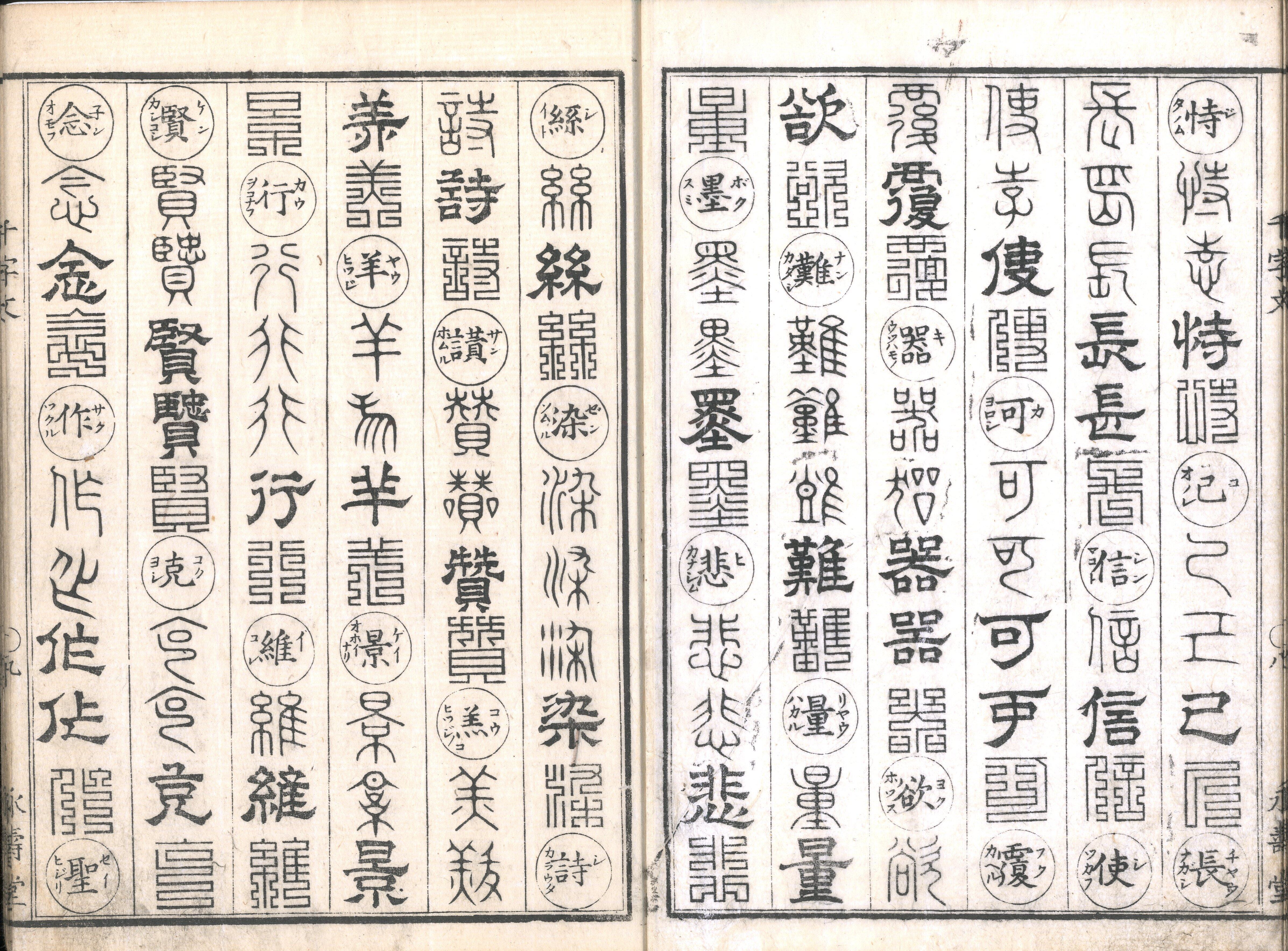 【備考】分類「往来物」。文化板2種と明治板1種の3種を収録。本書は、梁・周興嗣作『千字文』本文の漢字を一字ずつ楷書・両点付きで見出し語とし、続いて篆書・隷書など10体前後(10種以上もあれば、わずか数語の場合もあり、一定していない)の書体で示したもの。表紙見返に周興嗣の『千字文』の由来等を略述し、巻末に永寿堂の跋文を付すが、この跋文によれば、寛永・天和頃の『十体千字文』を校訂して文化13年に刊行したものという。