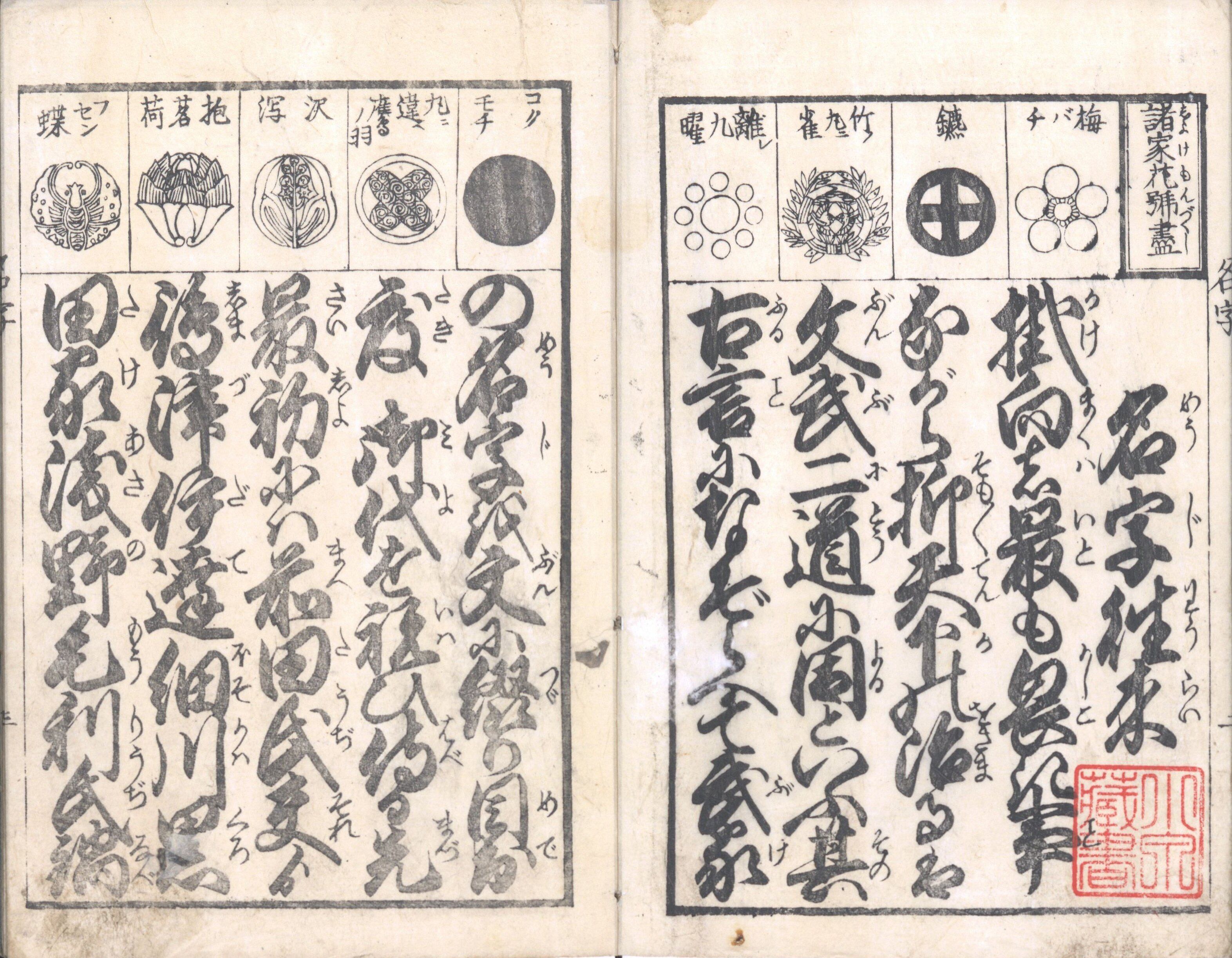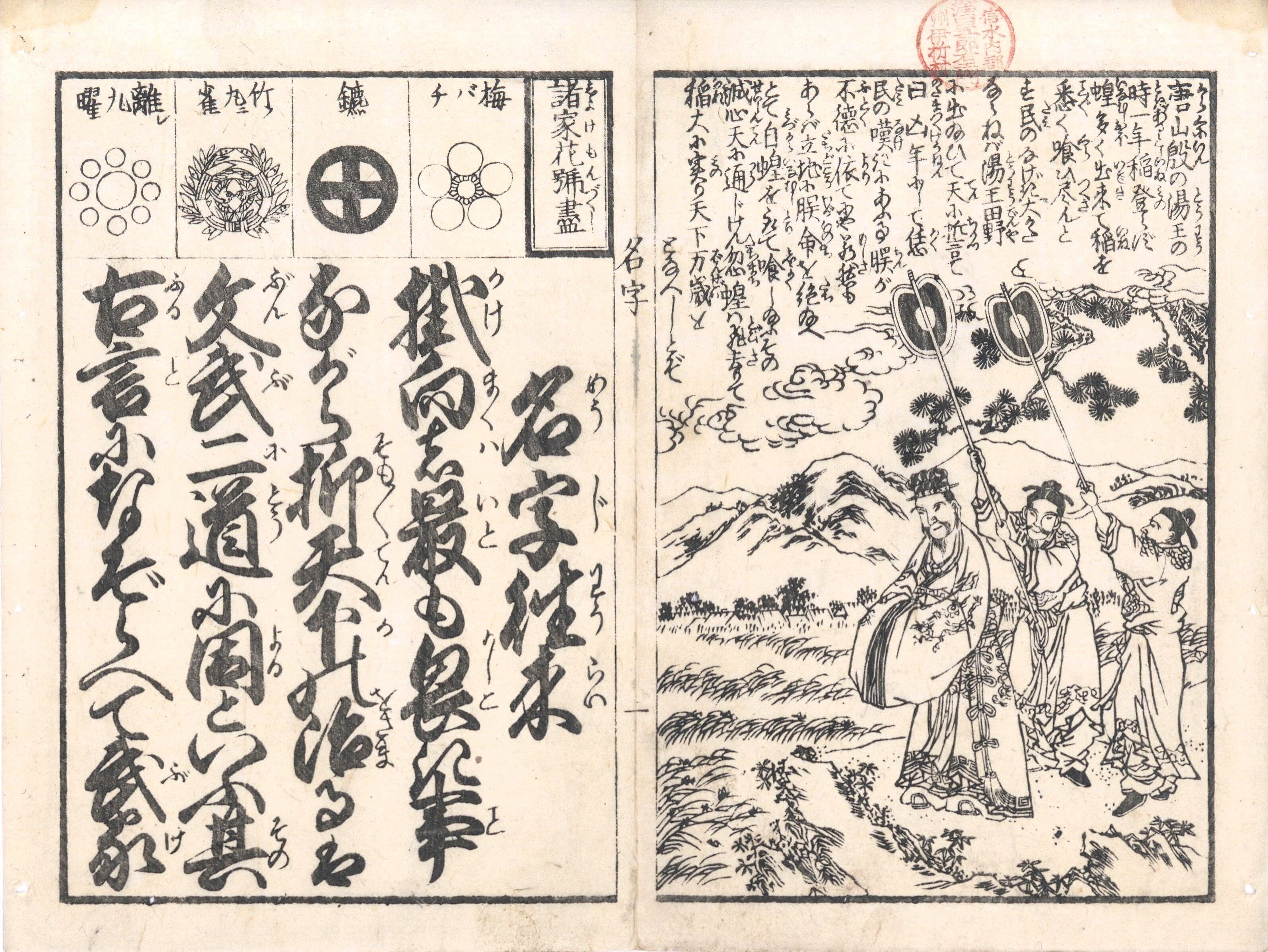 【備考】分類「往来物」。同板3種を収録(うち1点は袋綴じ展開収録)。『〈諸家〉名字往来[新撰名字往来]』は、前田氏以下114大名家の名字と、菅沼氏など130旗本家の名字を七五調の韻文体で綴った往来。「掛向(かけまく)は最(いと)も畏き事ながら、抑天下の治るは、文武二道に因といふ。其古言になぞらへて、武家の名字を文に綴り、目出度御代を祝ひ侍る…」と書き始め、武家諸大名・旗本家の名字を列挙し、最後に武家政治による今日の泰平の恩を強調して結ぶ。頭書に「諸家花号尽(もんづくし)」、巻頭に「諌鼓鳥」「殷の湯王」の故事と挿絵を掲げる。