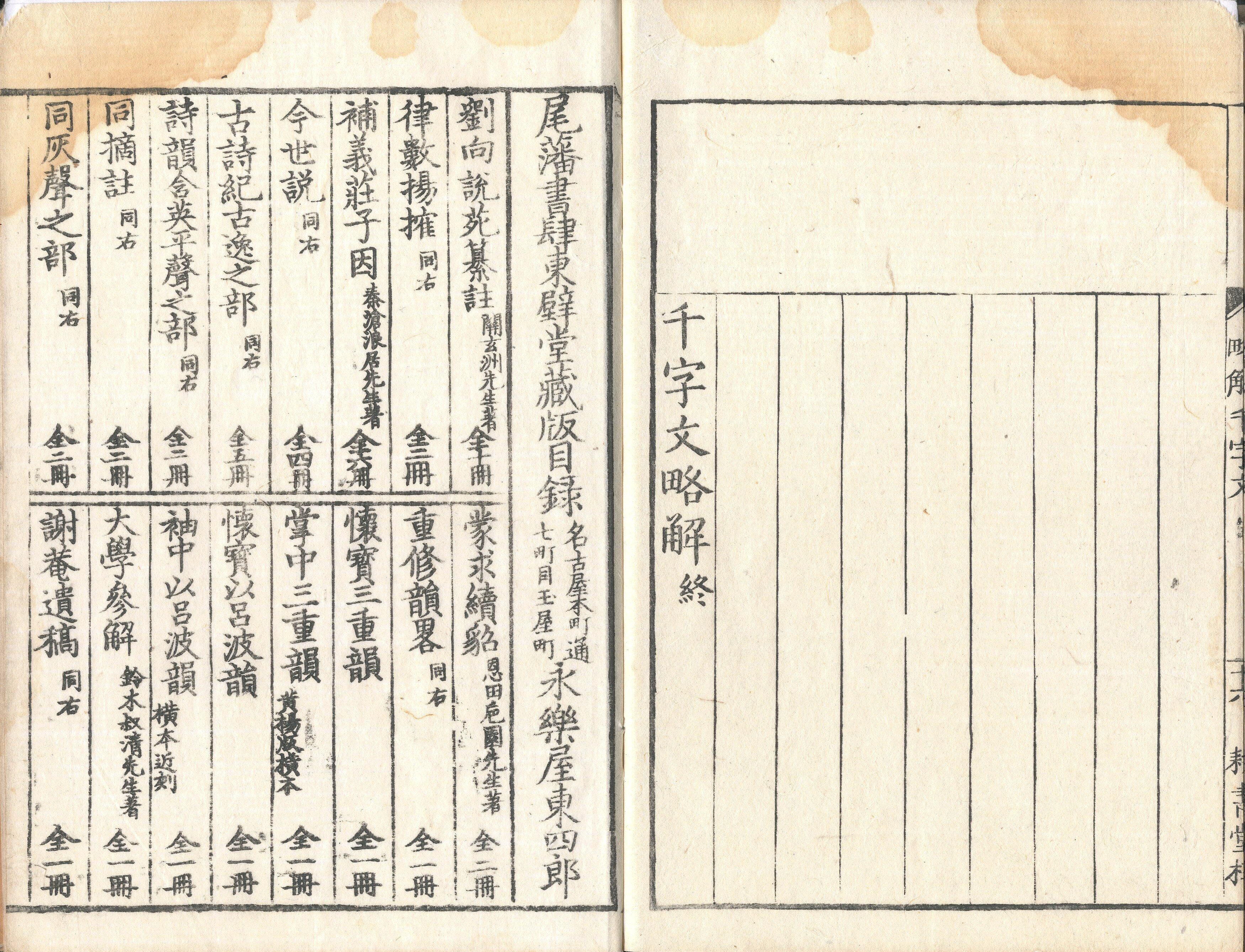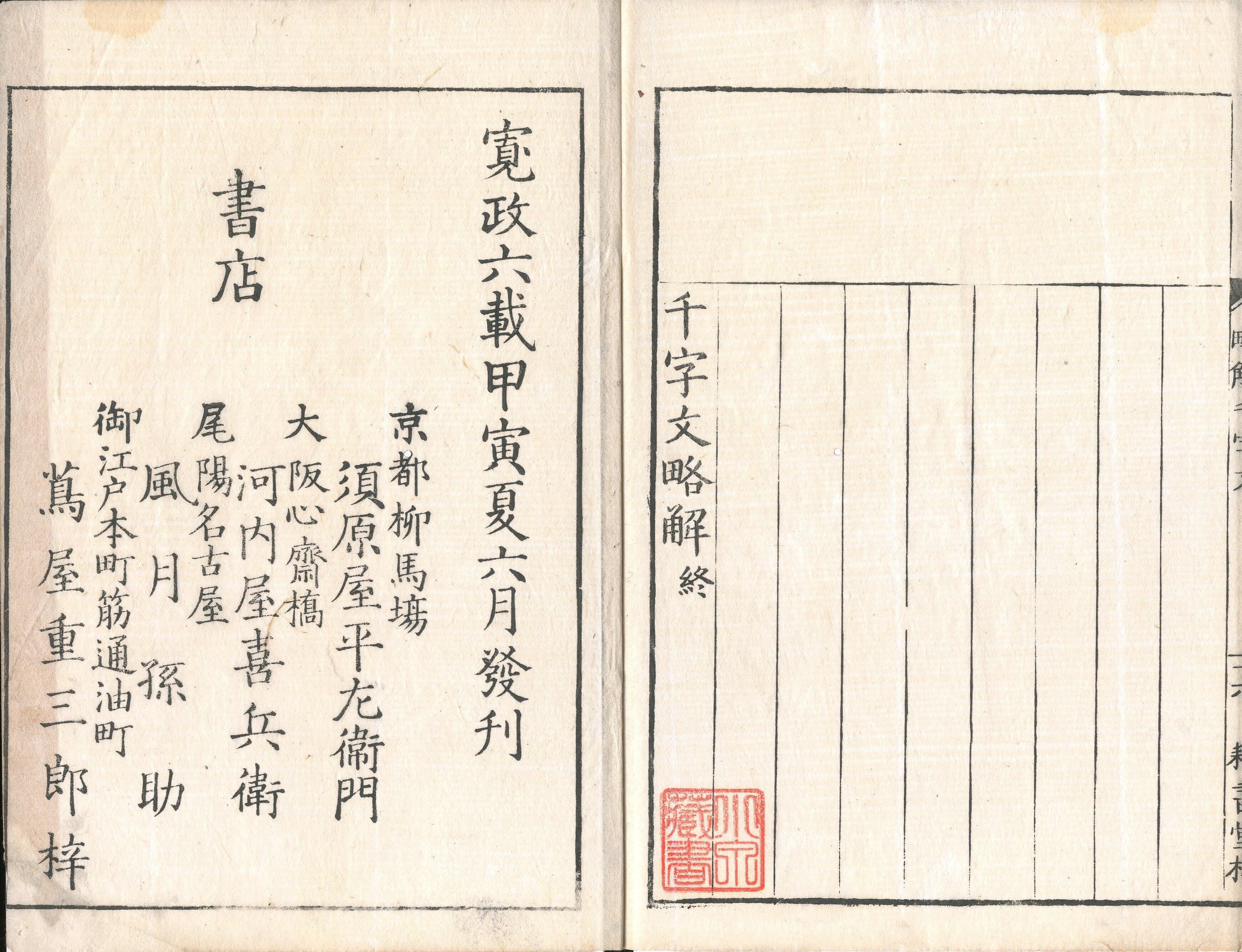 【備考】分類「往来物」。蔦屋板も抄録した。汪嘯尹(おうしょういん)の『集注』を基本に他の注釈書も参酌しながら編んだ『千字文』の童蒙向け注釈書。『千字文』本文を4字1句ずつ楷書・大字・9行で掲げ、それぞれ行書・細字の割注を施し、頭書に楷書の書き下し文を置く。巻首に『千字文』の起源や『千字文』の異本についての諸説、また、作者・周興嗣略伝等を載せる。