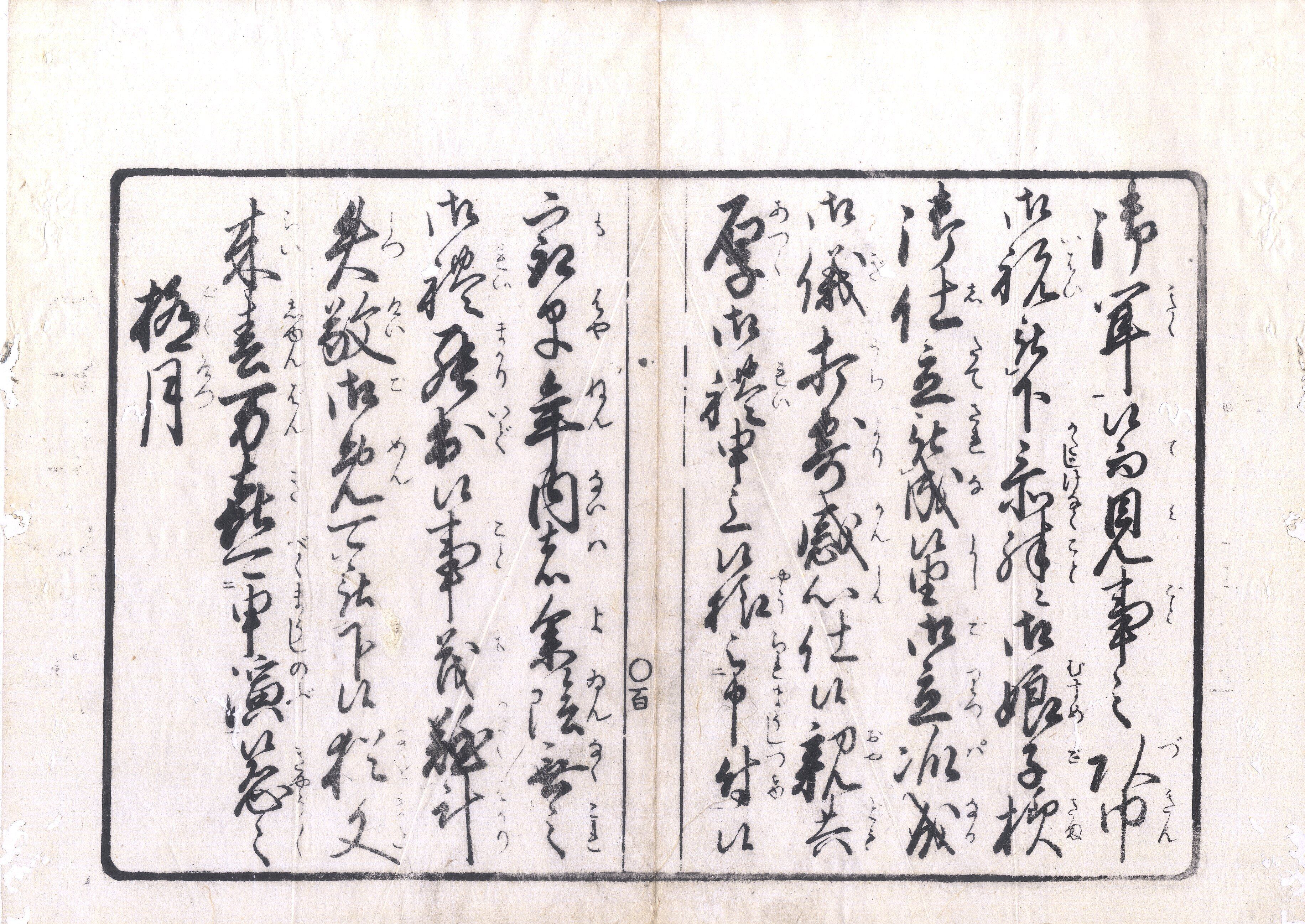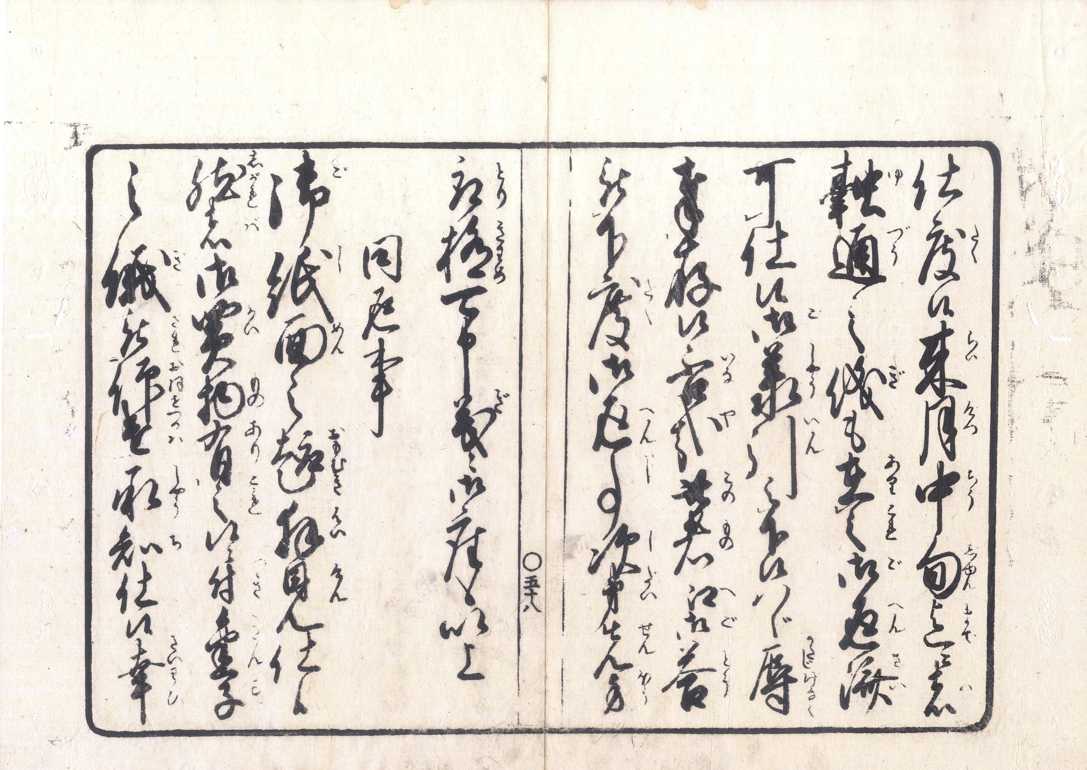 【備考】分類「往来物」。袋綴じ展開収録(見開き図は再掲)。文政板など合計3種を収録。刊記は同板別本による。五節句・四季、また種々慶弔事に関する書状に各種商用文を盛り込んだ用文章。「年頭状」から「歳暮祝儀状、付剃髪歓・同返事」までの28題往復56通を収録する。季節・月次順に配列された四季用文の間に、「店開注文状」「縁談歓状」「婚礼祝儀状」「船積案内状」「嫁入道具誂物状」「新渡物入札案内状」などの商用文や日用文を適宜盛り込む。本文を大字・5行・付訓で記す。なお、同名の文化13年板(浅野鷹三書)と似通うが、全くの異本。