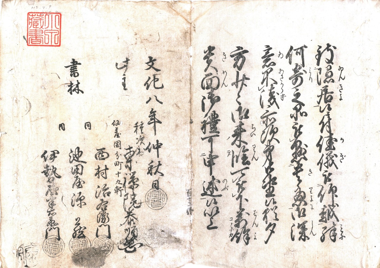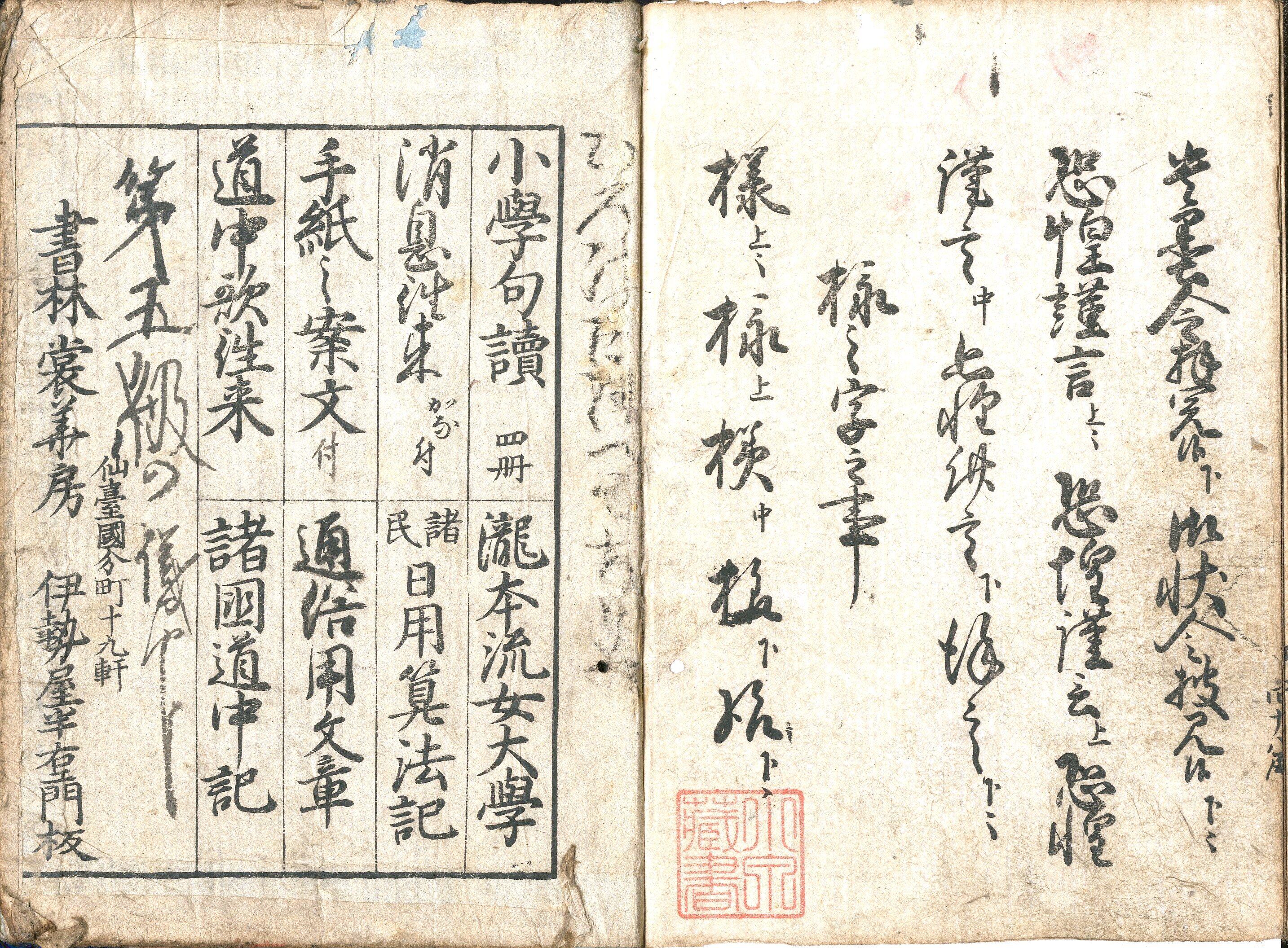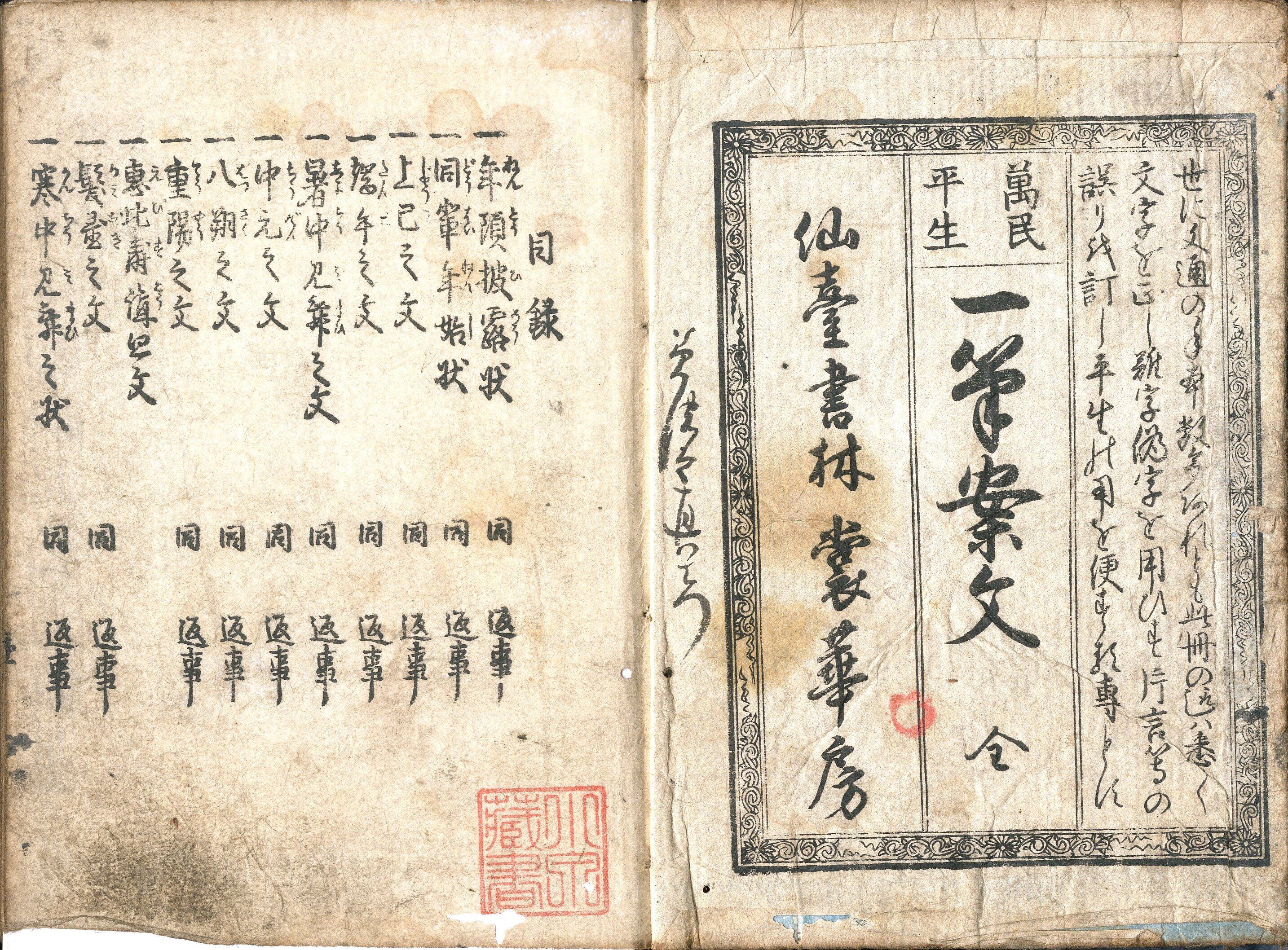 【年代等】天保6年改題・再刊。江戸後期再刊。[仙台]伊勢屋半右衛門板。*「〈万民平生〉手紙之案文」は文化8年刊([仙台]伊勢屋半右衛門(裳華房)板)。