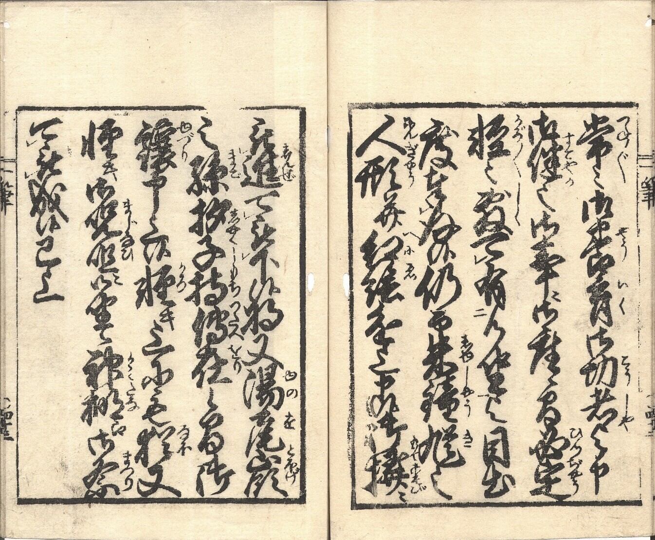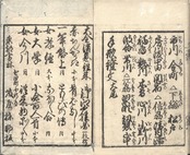 【備考】分類「往来物」。『一筆啓上(小本・藤屋板)』は、式亭三馬作『一筆啓上』とは別内容。前半部「諸状案文」と後半部「手形証文」を合綴した用文章。「年始之文」から「帰国之上土産配る文」までの消息例文38通と、「店請状」から「御関所通手形」までの証文文例14通を収録。本文を大字・5行・所々付訓で記す。見返に「二十四孝」のうちの車胤・孫康の図を掲げ、巻末に「諸国御関所附」を載せる。