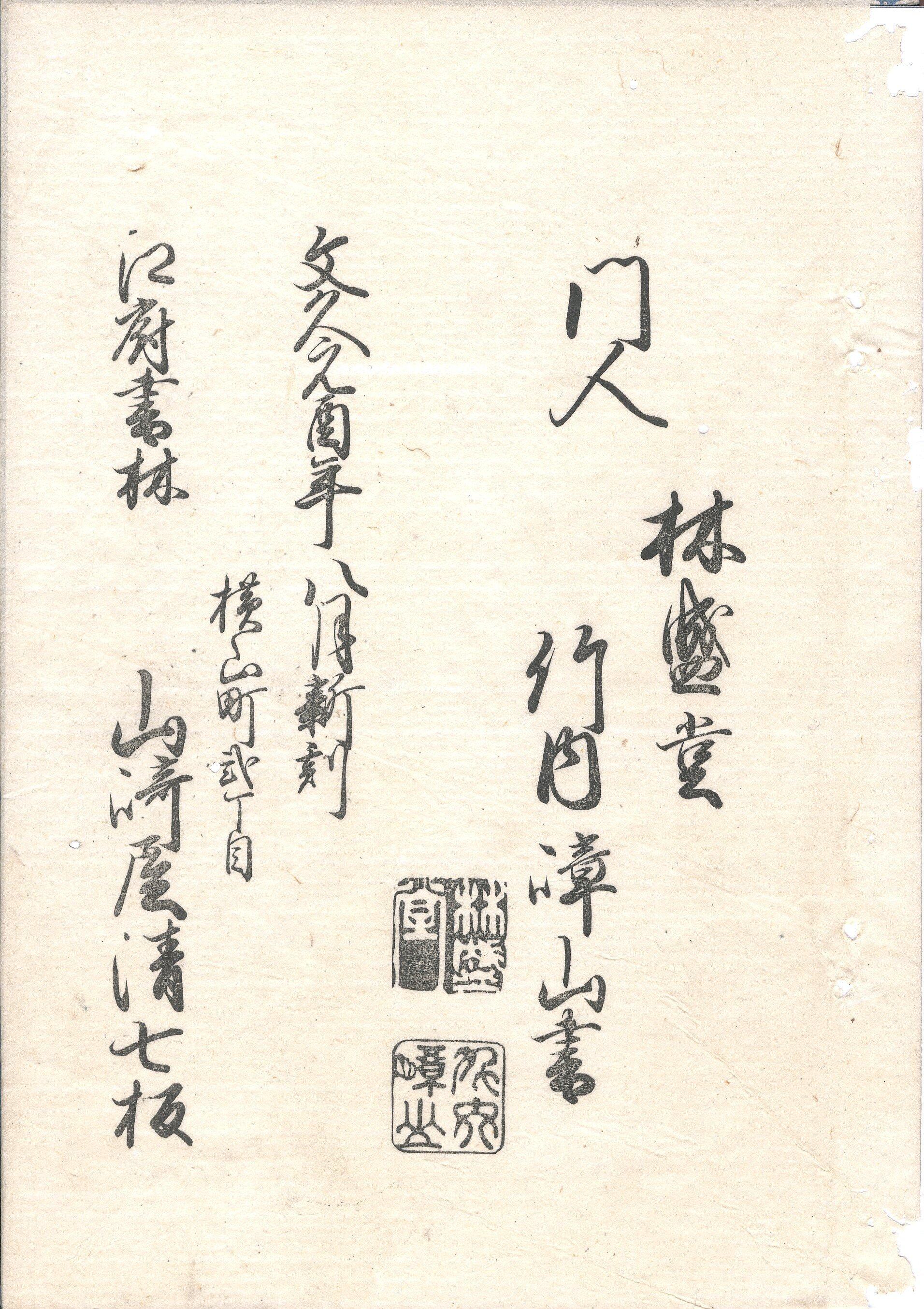 【作者】藤村秀賀(鶴亭・春霞楼)作。竹内嶂山(林盛堂)・中村暘嶂(林泉堂)書。