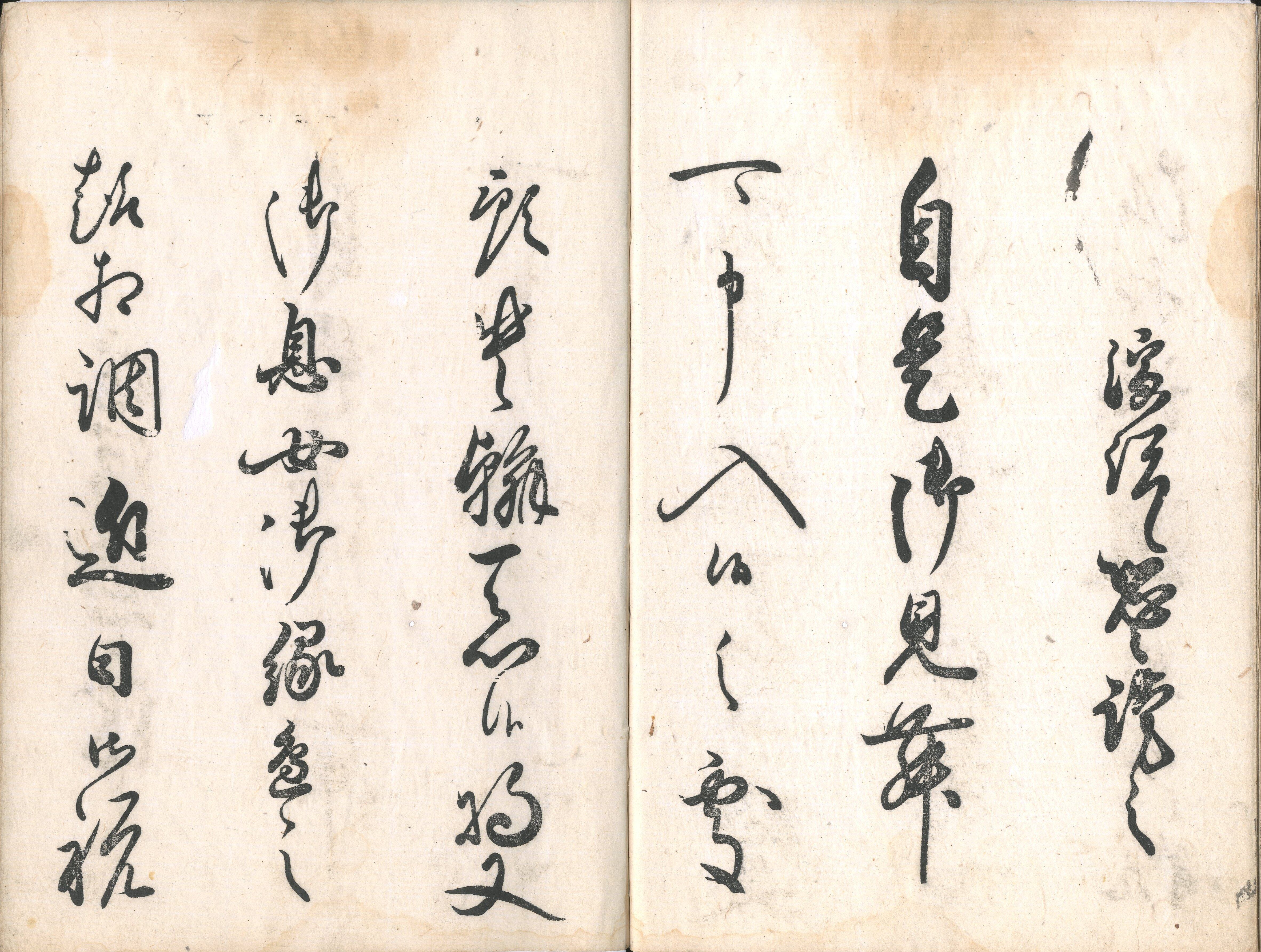 【備考】分類「往来物・書道」。外題書名(破損部)は別本の原題簽による。題簽書名下に「滝本松花堂筆」と記すように松花堂の遺墨を集めた法帖。全6通の書簡を載せるが、本文と同筆で「寛文三歳十月日」と記すから、これは松花堂(1584-1639)の直筆ではなく模写であろう。収録書状は、『十二月往来(菅家文章)』1月状を模した「新年状」を始め、種々用件の手紙、四季折々の祝儀・贈答の手紙、安否を問う手紙、婚礼祝儀状などから成る。本文を大字・3行・無訓で記す。