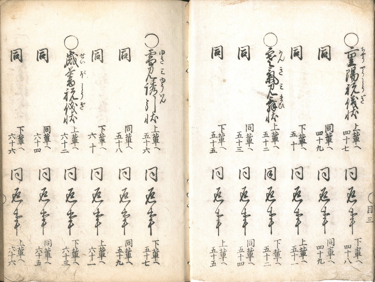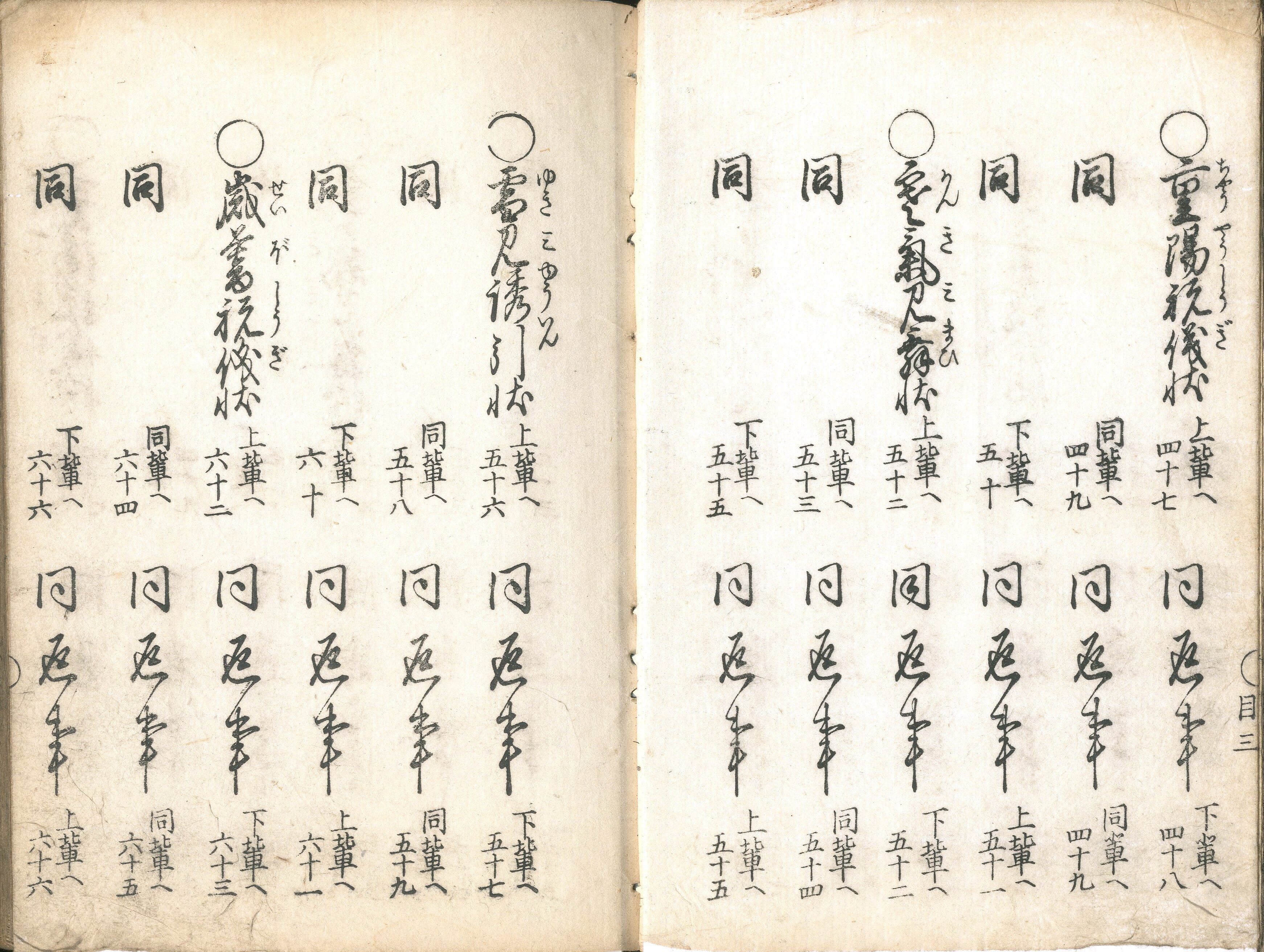 【備考】分類「往来物」。天保10年板(全冊を袋綴じ展開収録)および天保9年板(抄録)・刊年不明板(同)の3種を収録。書名の「三体」は上輩・中輩・下輩を意味し、各消息文について相手の貴賤上下に応じた文例を掲げた用文章。「年始状」「上巳祝儀状」「花見誘状」「端午祝儀状」「暑気見舞状」「納涼誘引状」「神事招請状」「中元祝儀状」「月見催状」「重陽祝儀状」「寒気見舞状」「雪見誘引状」「歳暮祝儀状」「安産見舞状」「元服祝儀状」「養子歓状」「婚礼祝儀状」「留守見舞状」「火事見舞状」「病気見舞状」「悔状」「忌明状」「家督相続祝儀状」の23題についてそれぞれ三体ずつの往復文を掲げ(悔状・忌明状は返状なし)、合計132通の文例を収録する。本文を大字・5行・付訓で記す。序文には商人子弟向けに編んだことを述べるが、直接商取引に関する例文は皆無である。巻末に、時候の言葉を記した「年中時候案文」を掲げる。