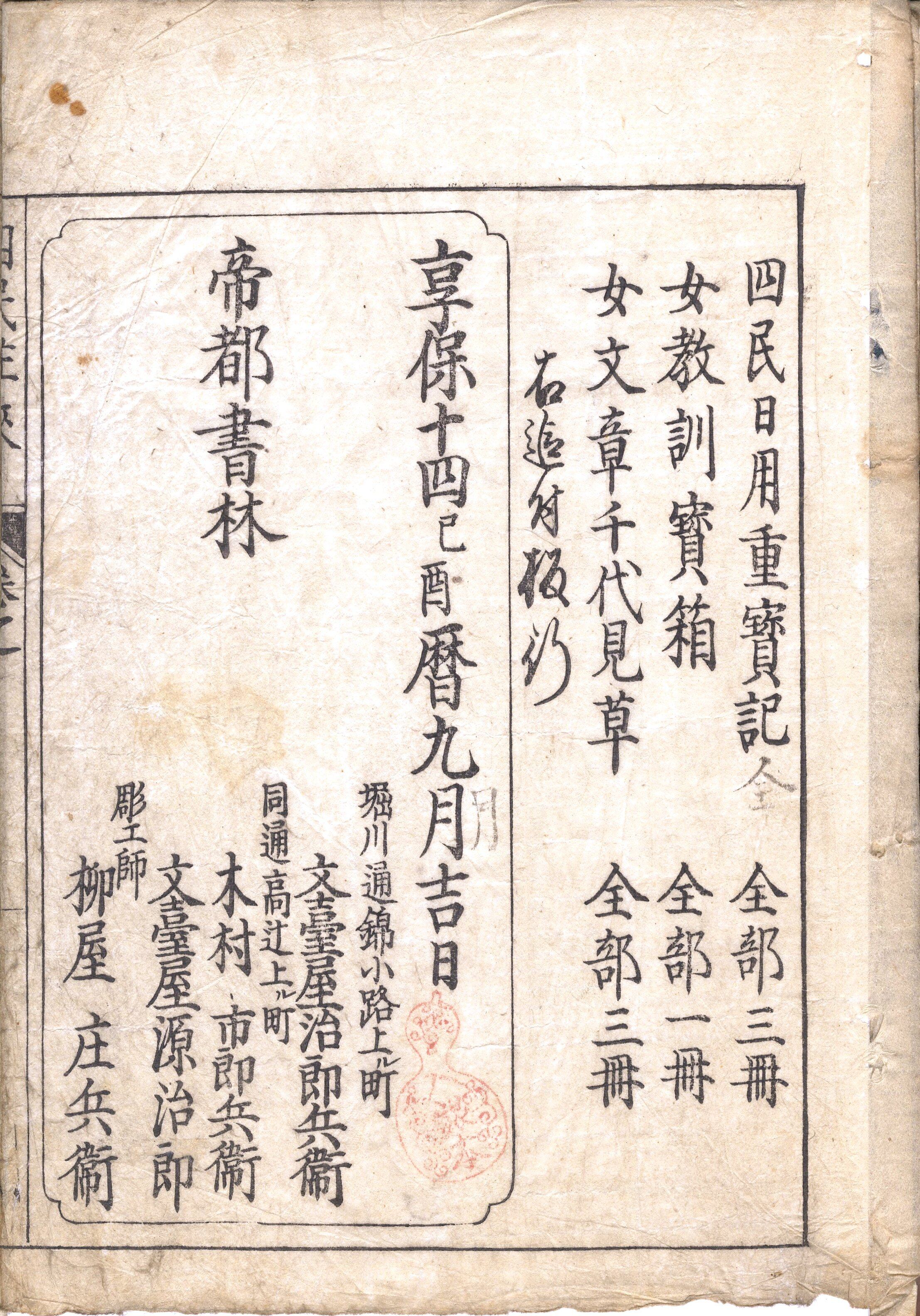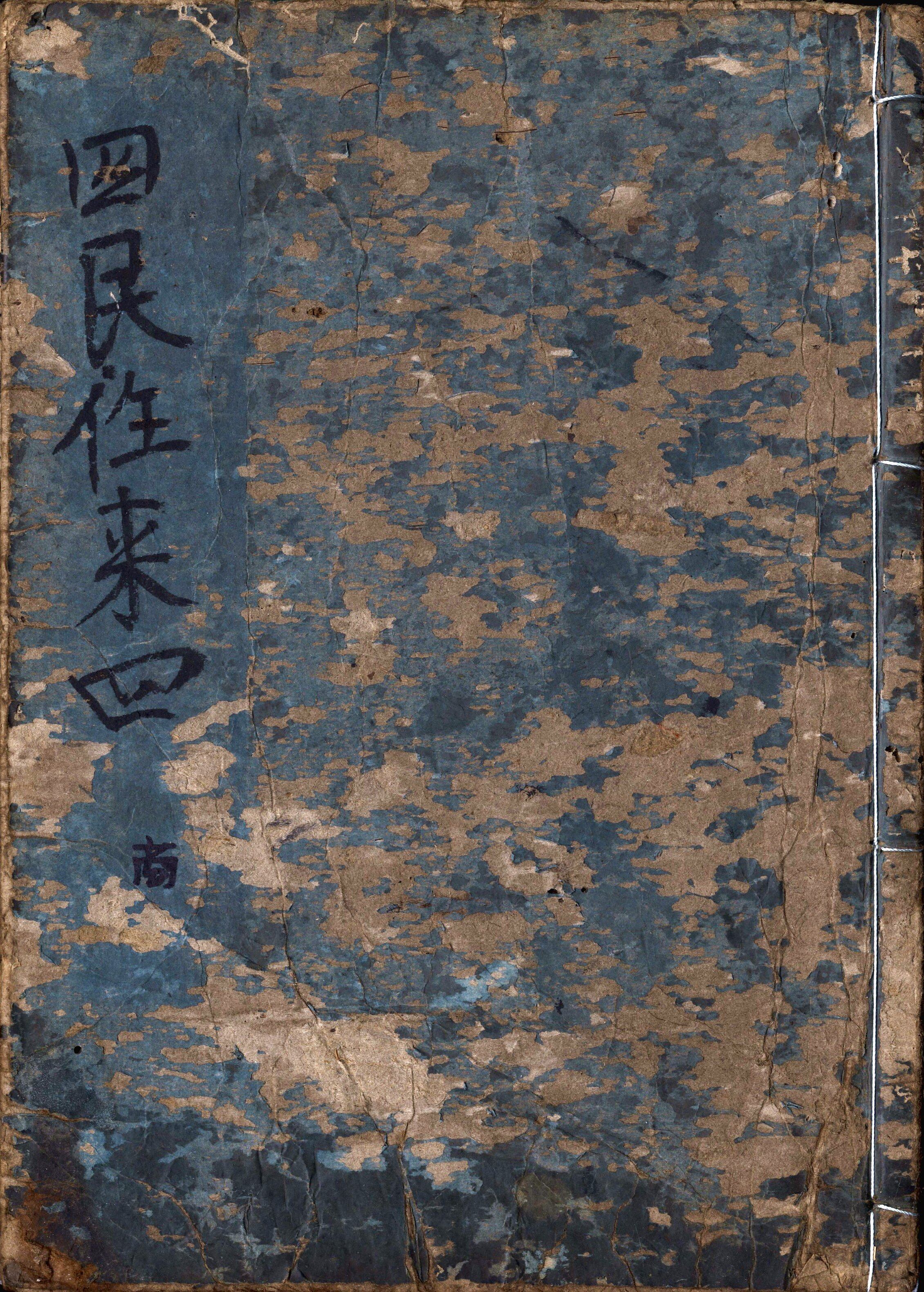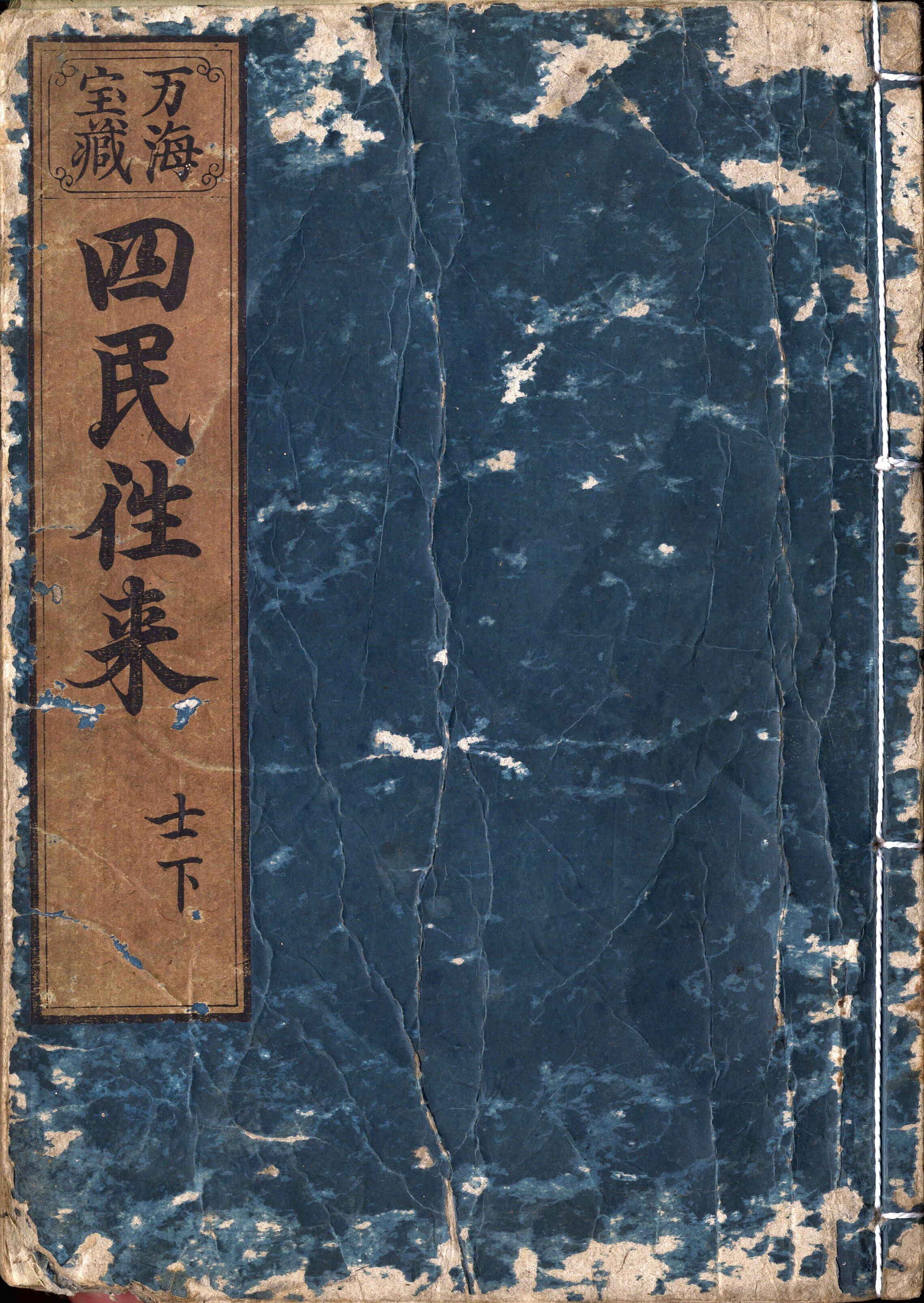 【備考】分類「往来物」。彫工:柳屋庄兵衛。享保14年板2種(うち1種を袋綴じ展開・全冊収録)と享保20年板1種を収録。『〈万海宝蔵〉四民往来』は、職業別の消息例文と類語集(類字縁字)を集録した独特な用文章。本書からの抄録本『文通書用字便蔵』と共通する丁には2種類の丁付が施されており、当初より両者の出版が計画されていたことを物語る。事実、享保15年刊『一代書用筆林宝鑑』頭書中(第40丁ウ)に「予、『一代書用』と『四民往来』の文書同時に筆作し…」とあるため、両者ともに享保14年成稿とみて間違いない。まず享保14年に『四民往来』の初板本が刊行され、まもなく『字便蔵』用に丁付等を改刻(その際に序題・目録題等を『倭国通用書翰箱』と改刻)するとともに増補を行い、享保20年に『四民往来』(再刊)と『字便蔵』の双方を同時に刊行したものであろう。収録書状および内容は、「士之部上」が「御書御請文章」以下13通と「正月之部」「禁裏その他」「武具」の類字縁字、「士之部下」が「寒気伺御機嫌状」以下26通と月・日の異名、「御庁」「郷村」「神社仏閣」「馬駅」「盗賊」その他の類字縁字、「農之部」は「農業為楽文章」以下20通(うち二通は「税帳」と「宗旨帳面」の書式)と種々の類字縁字、また、「工之部」は「烏帽子折之文」以下23通と「有職」「禁裏年中行事」その他職種毎の類字縁字および「諸職名寄」、さらに「商之部」は「呉服所文章」以下19通と「呉服」「魚鳥」「道具類」等の類字縁字をそれぞれ収録する。本文の所々に任意の語句の割注や説明文を補足する。また、各巻巻頭に三近子自画の四民の図と教訓文を載せる。