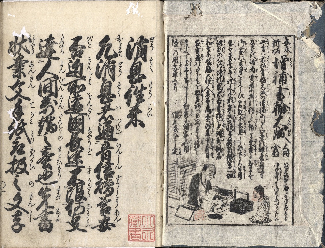 【備考】分類「往来物」。同板別本も抄録した。安永7年刊『累語文章往来』の改編版の一つ。「凡、消息者、通音信近所・遠国、不限何事、人間万用達之元也。先、書状・手紙取扱文字、一筆啓上、仕、致啓達、令啓、以手紙、申入、尊書・尊翰・貴書・貴札・御状・芳墨・芳翰・御紙面…」と筆を起こして、端作や手紙の尊称、四季時候の言葉、安否問答、武家公務、祝意・拝命、日月、出御・訪問、異存・同意、三都・その他都市、安寧秩序、約諾、会合・饗応・逗留、家作・普請、通過儀礼・慶事、家職・売買・租税・通貨、運送・交通、人倫等にまつわる語句、さらに、返状の冒頭語や養生、交友、年中行事・佳節、祭礼、縁組、褒美拝領、書止・脇付等の語彙を列挙する。