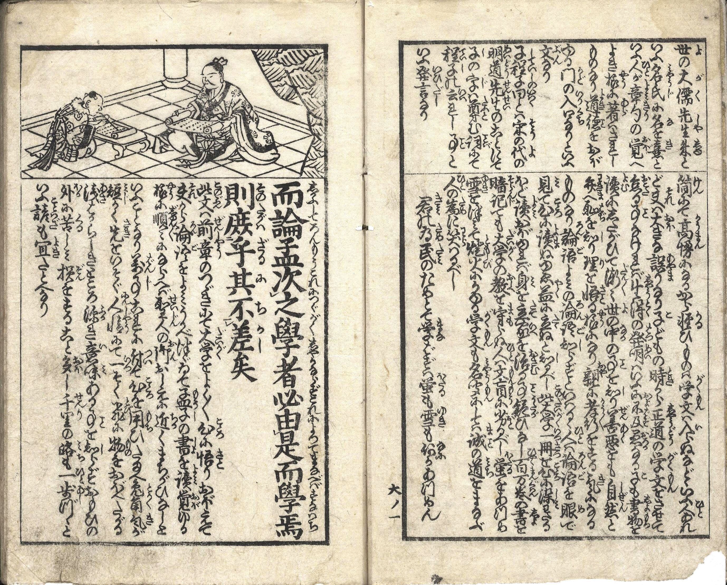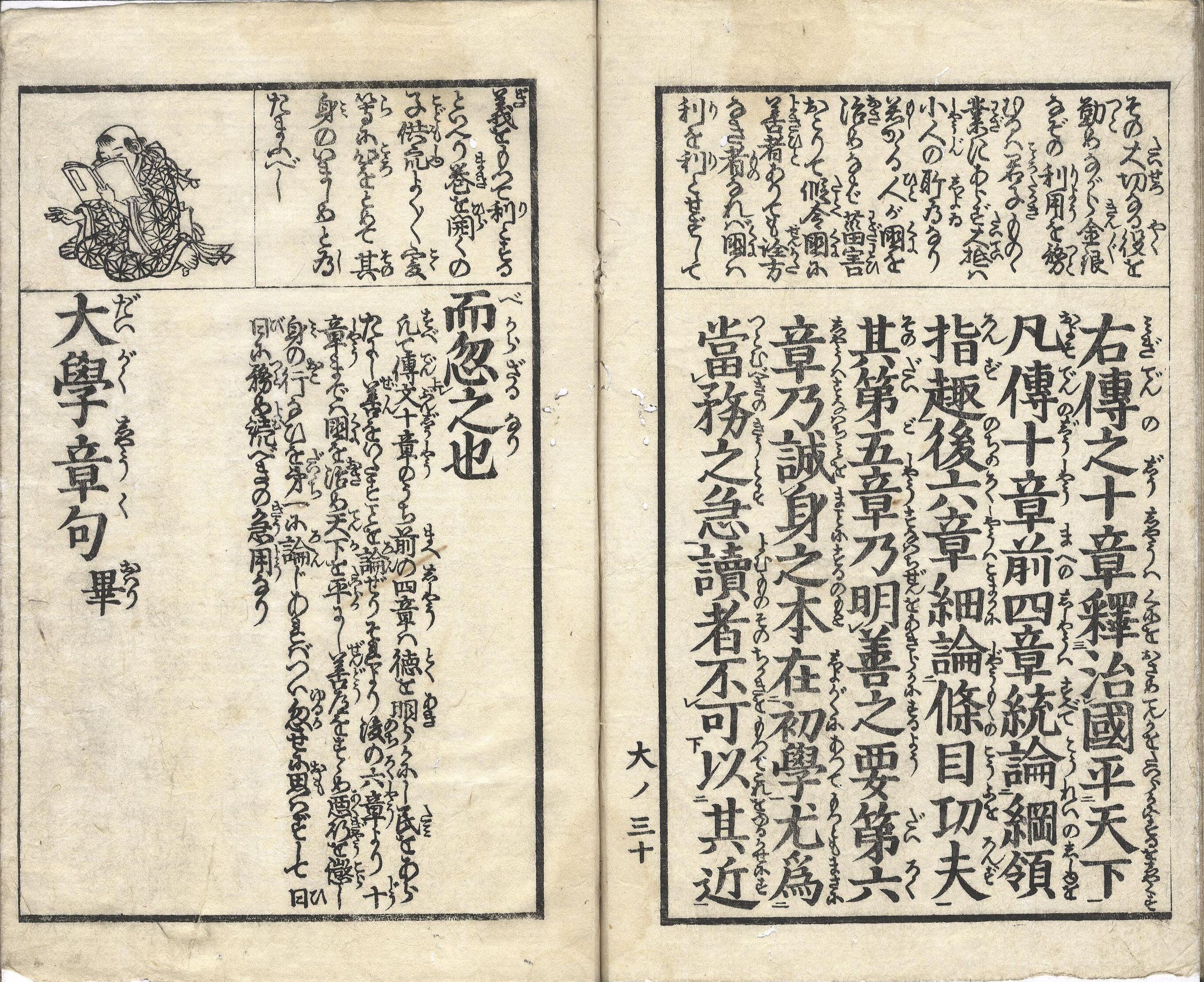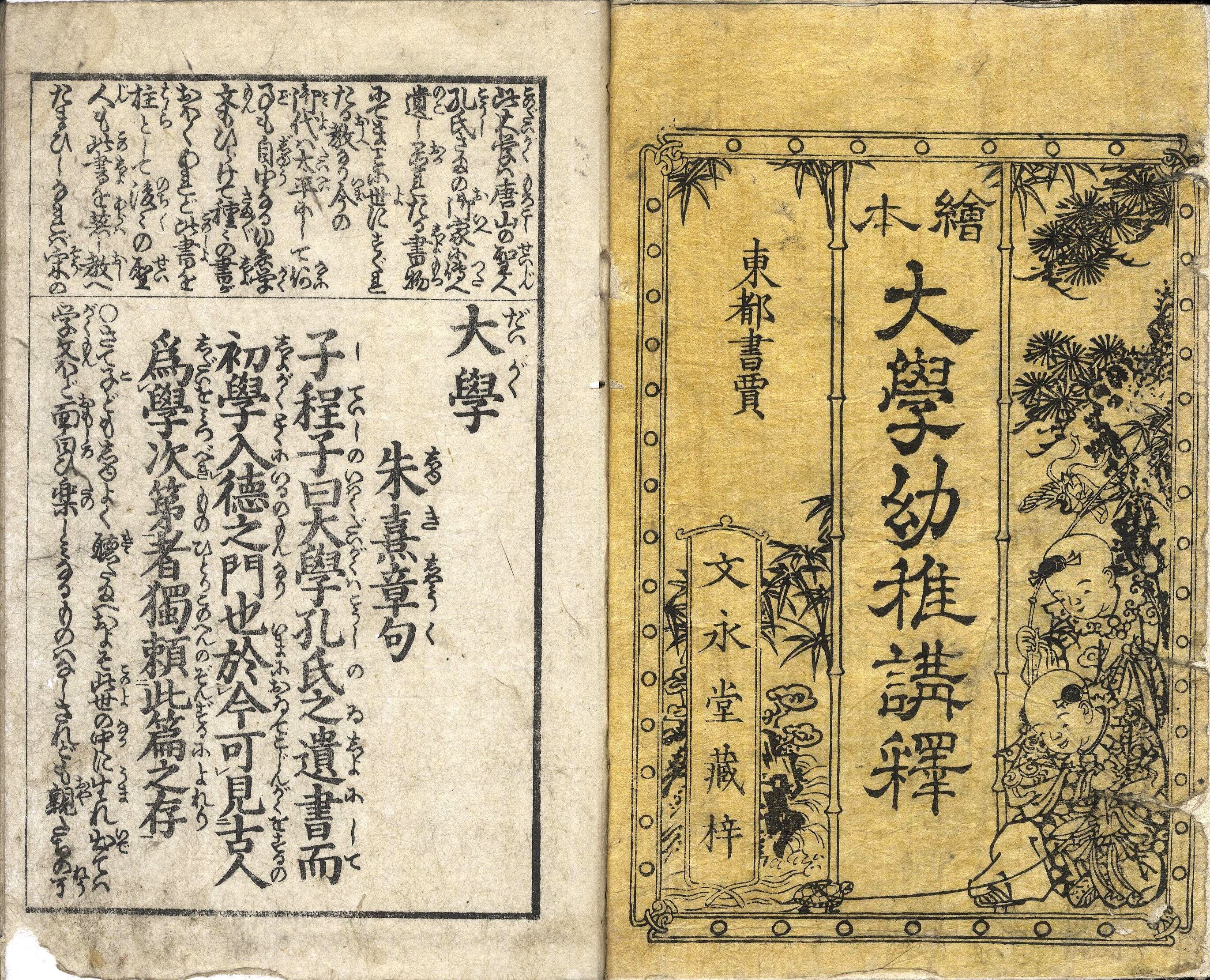 【備考】分類「往来物」。後半に『〈貝原先生著〉大学講釈』を全冊収録した。『大学(朱熹章句)』の本文を児童向けに平易に注釈した往来。『大学』本文をいくつかに区切って楷書・大字・六行大・付訓で記し、続けて割注形式で本文の大意を示す。さらに、頭書に語注を補足し、随所に挿絵や教訓歌を掲げて『大学』の趣旨を敷衍する。