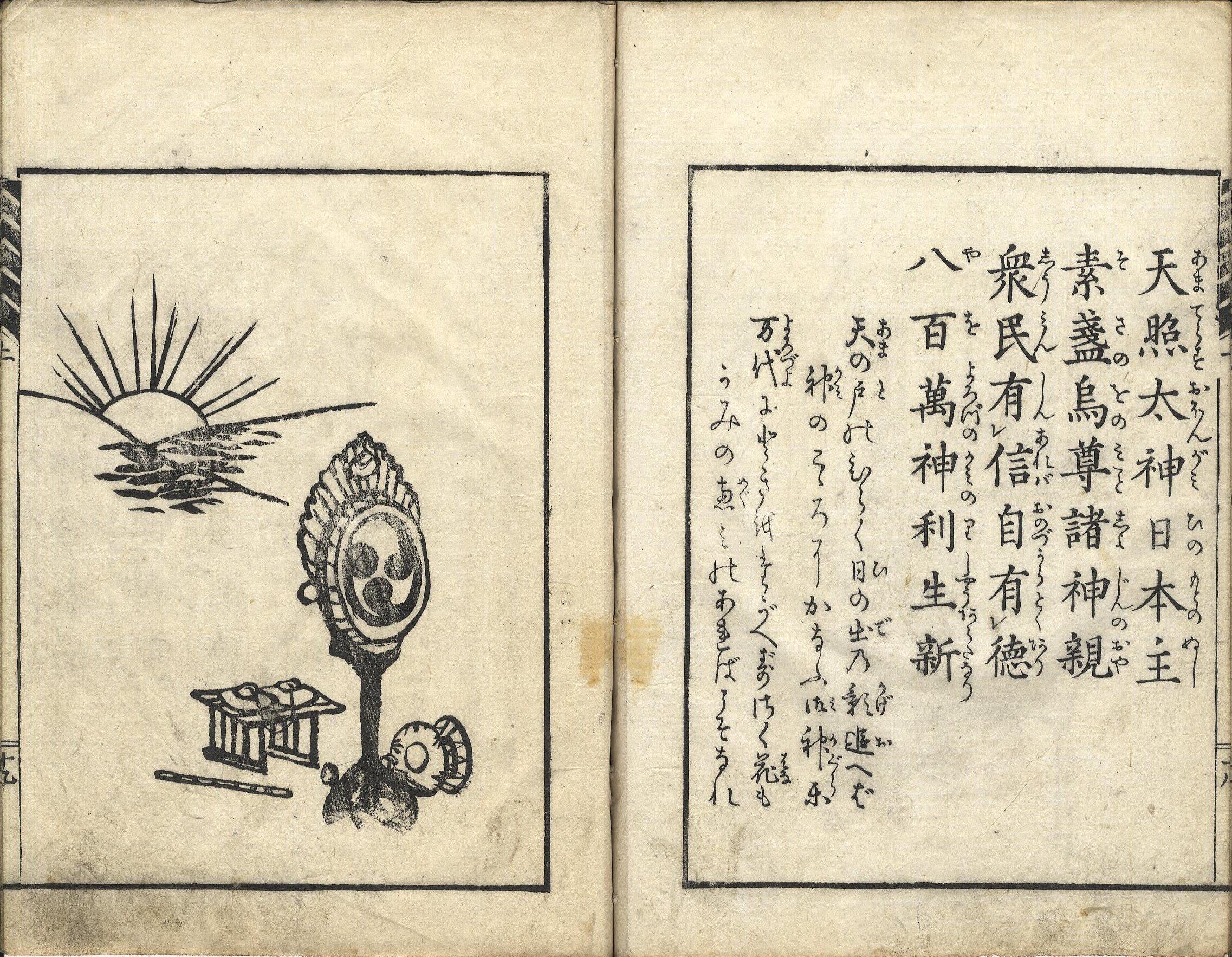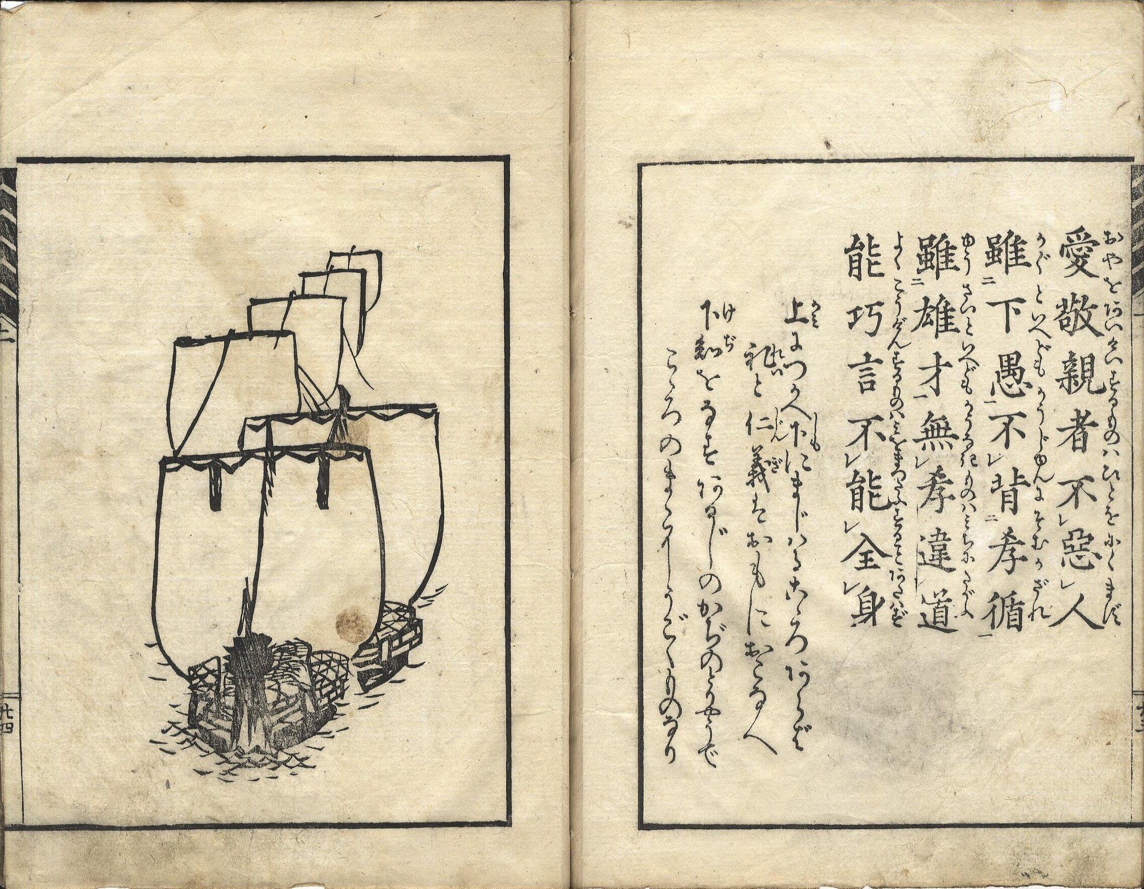 【判型】半紙本3巻3冊。縦223粍。【作者】有隣堂谷神作。芳田月長画。津羅文序。【年代等】文政2年11月、津羅文序・刊。[京都]吉田屋新兵衛ほか板。【備考】分類「往来物・教訓」。戯れ歌と戯画の絵解きを交えて忠孝等を諭した平易な童蒙教訓書。まず漢詩文(多くは7言4句、稀に7言8句、6言等で、上巻に9首、中巻に28首、下巻に10首の合計47首)をやや大字で記し、次いで、それに対応する挿絵や教訓歌(狂歌)を掲げ、必要に応じて解説を施すのが基本的なスタイル。例えば上巻冒頭は「知恩不報等豺狼、報君恩不如守方、報祖恩不如相続、報君祖恩摂五常」の漢詩文に挿絵と「しづかなる御代の御おんをほうぜずば 鳥けだものにおとるわれ人」など2首の教訓歌を掲げ、さらに漢詩文各句の注解で、天地・国土・父母・衆生の「四恩」の高大さや報恩のあり方などを述べる。以下同様にして、四恩に対する報恩や忠孝・五常・正直・勤勉・堪忍・慈悲などの生活心得を平易に説く。また、下巻末に附録として「いろはうたいけんばかりとおもふなよ こゝろえおけば身のとくとなる」以下のイロハ教訓歌に「神祇」「釈教」と題した2首を加えた教訓歌50首を掲げる。