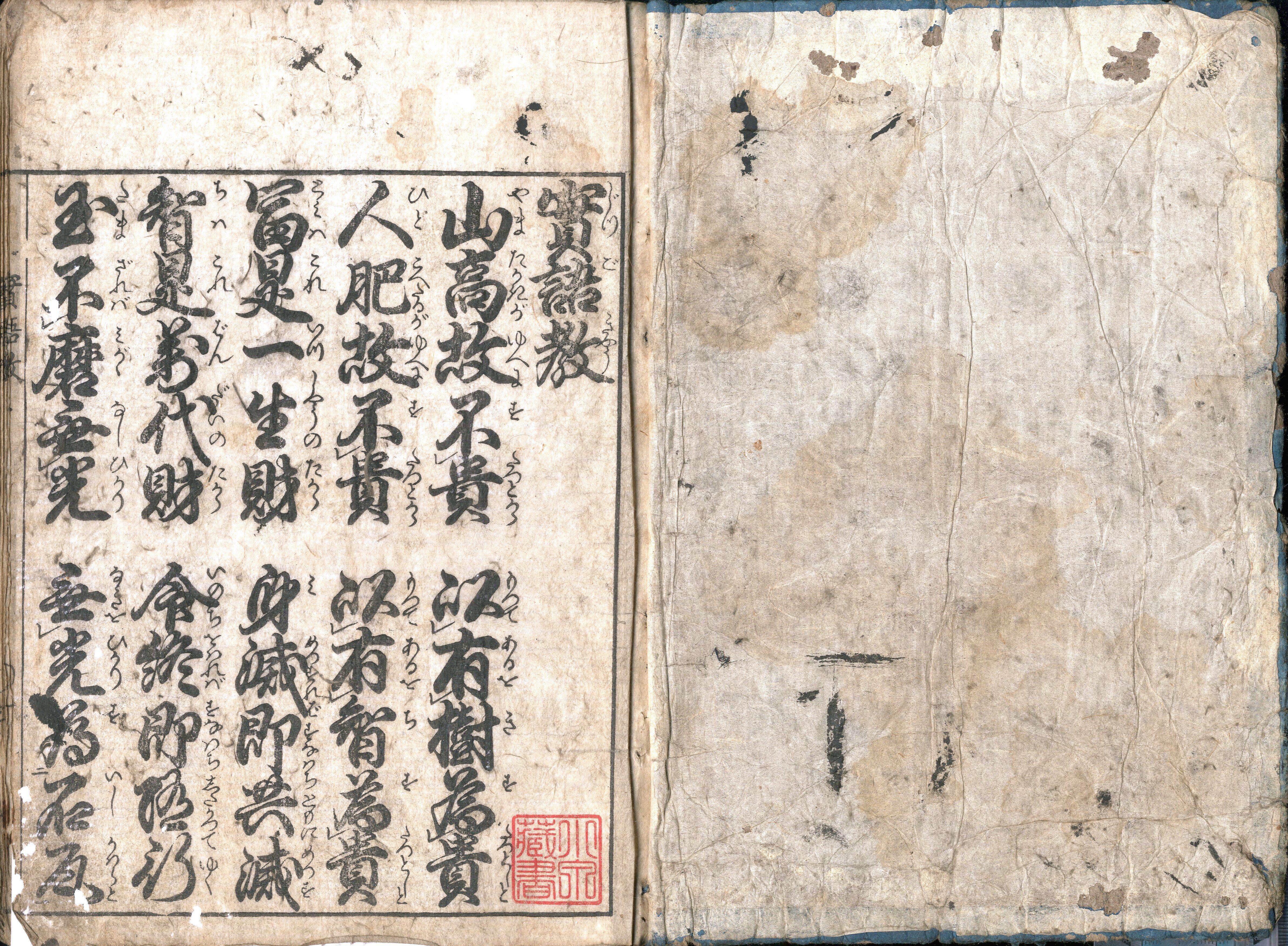 【備考】分類「往来物」。同板2種を収録。『実語教・童子教』は、「実語教」と「童子教」を収録した往来物。まず『実語教』が平安末期頃に編まれ、その後鎌倉前期に『童子教』が撰作されたものと考えられる。作者は前者が平安末期の貴族、後者が鎌倉前期の真言宗系の僧侶と見られるが、作者については中世から様々な俗説が生まれ、近世では概ね『実語教』は弘法大師作、『童子教』は安然和尚作とするものが多く、これらの権威付けによってさらに普及したものと思われる。二教は元来別々に流布したが、文安元年(1444)『下学集』序に「彼之実語・童子為教…」とあるように室町前期頃には二教合本のスタイルが生まれ、さらに近世ではほとんど例外なく合本されるようになった(例外的に『実語教』のみの注釈本や『童子教』のみの単行本もある)。二教ともに5字1句、2句一対を基本とし、『実語教』が「山高故不貴、以有樹為貴…」で始まる96句、『童子教』が「夫貴人前居、顕露不得立…」で始まる330句からなる。内容は、『実語教』が主に「智」を礼讃し学問のあらましを初学者に諭す勧学教訓であるのに対し、『童子教』はこの世の因果の道理や儒仏の教えを諭した幼童訓・処世訓となっている点で異なる。両教とも暗誦に便利であったために寺子屋教育でも広く教授されるとともに、二教中の多くの語句が俚諺・格言として庶民に深く浸透した。