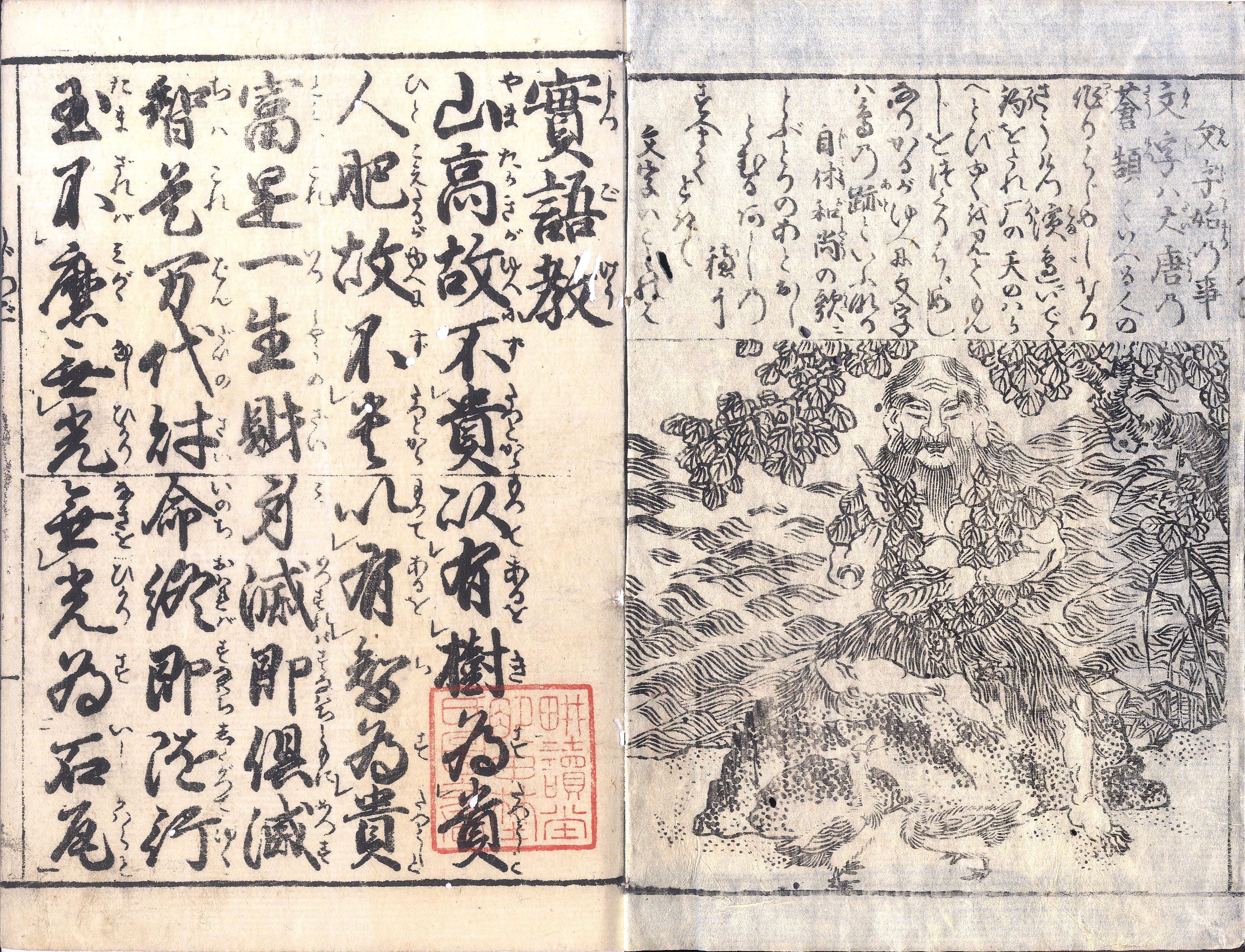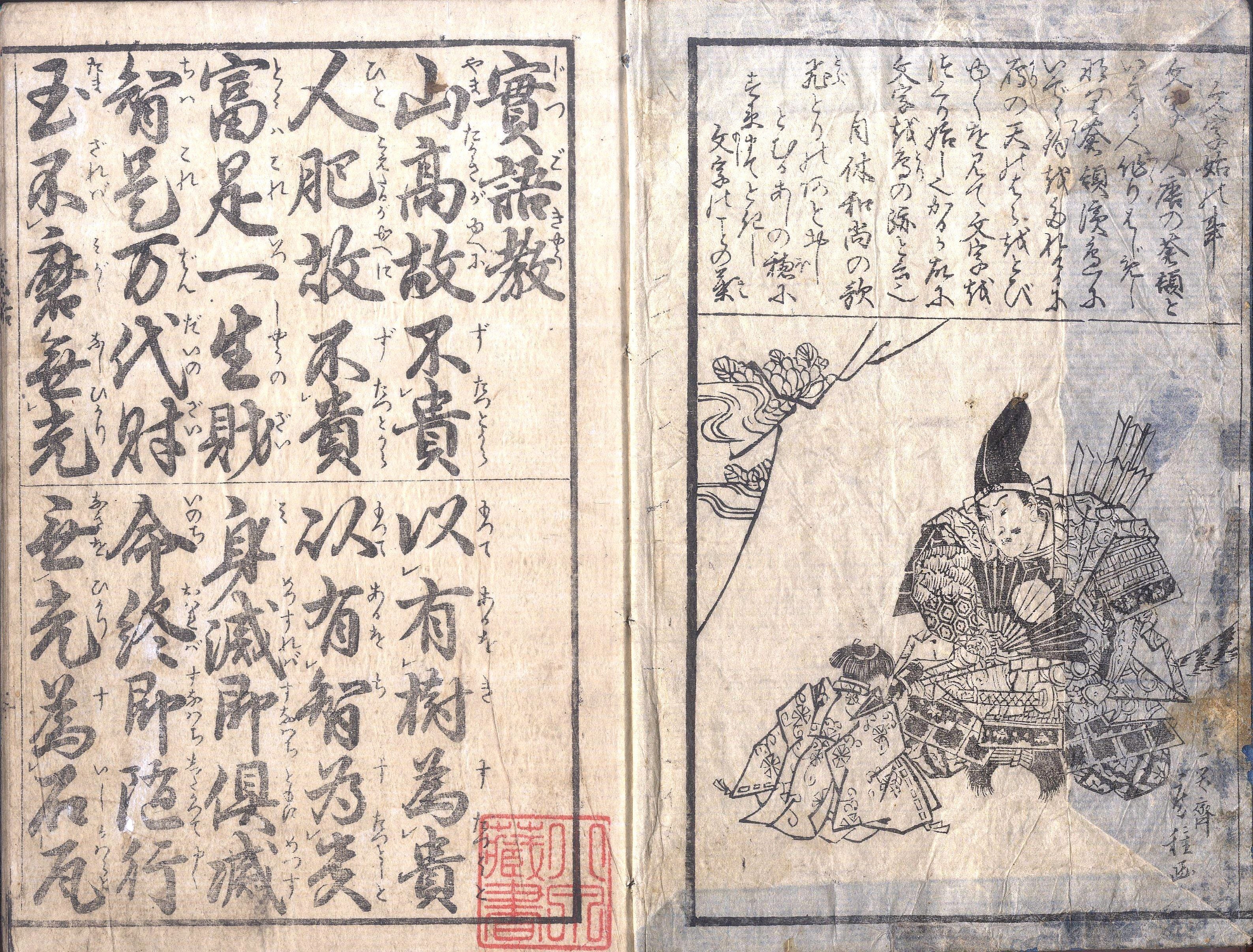 【備考】分類「往来物」。異板・題簽違い本など7種を収録。「実語教」と「童子 教」を収録した往来物。まず『実語教』が平安末期頃に編まれ、その後鎌倉前期に 『童子教』が撰作されたものと考えられる。作者は前者が平安末期の貴族、後者が 鎌倉前期の真言宗系の僧侶と見られるが、作者については中世から様々な俗説 が生まれ、近世では概ね『実語教』は弘法大師作、『童子教』は安然和尚作とする ものが多く、これらの権威付けによってさらに普及したものと思われる。二教は元 来別々に流布したが、文安元年(1444)『下学集』序に「彼之実語・童子為教…」と あるように室町前期頃には二教合本のスタイルが生まれ、さらに近世ではほとんど 例外なく合本されるようになった(例外的に『実語教』のみの注釈本や『童子教』の みの単行本もある)。二教ともに5字1句、2句一対を基本とし、『実語教』が「山高故 不貴、以有樹為貴…」で始まる96句、『童子教』が「夫貴人前居、顕露不得立…」で 始まる330句からなる。内容は、『実語教』が主に「智」を礼讃し学問のあらましを初 学者に諭す勧学教訓であるのに対し、『童子教』はこの世の因果の道理や儒仏の 教えを諭した幼童訓・処世訓となっている点で異なる。両教とも暗誦に便利であっ たために寺子屋教育でも広く教授されるとともに、二教中の多くの語句が俚諺・格 言として庶民に深く浸透した。