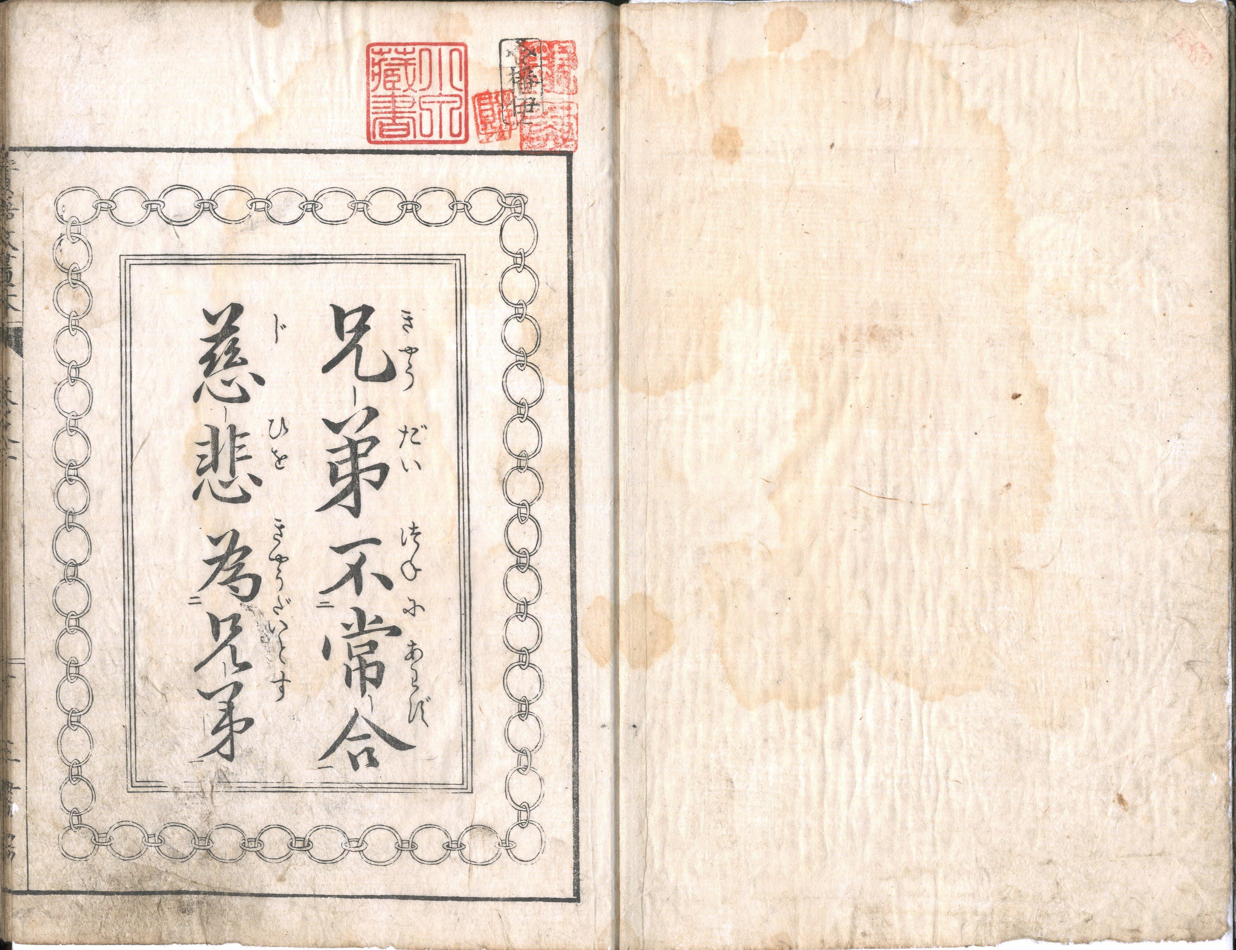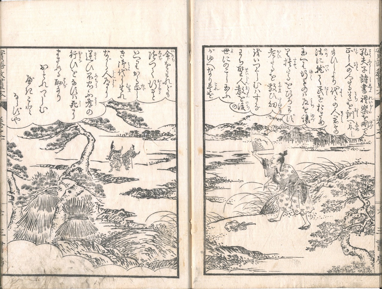 【備考】分類「往来物」。早印本・後印本など3種を収録(早印本を全冊収録、他は抄録)。『実語教画本』は、『実語教』を俗解した絵本。『実語教』本文を数句毎に分けて扉あるいは注釈文の前に大字で掲げ、細字の注釈を施す。施注内容は至って平易で、簡潔な語注に対して本文を敷衍する和漢人物故事等の説明が詳しいのが特徴。道二の序文にも本書を「其説詳にして言外の義を拡(おしひろ)め、和漢の人物を評論し、燦然として義理細明也。加之(しかのみならず)、山水・人物・堂舎・牛馬等の絵画を加へて其大略を示せり」と記す。なお、本書は後続の嘉永5年刊『実語教稚絵解』(橋本貞秀注)、嘉永~安政頃刊『絵本実語教(実語教童子教絵本講釈)』(鷦鷯斎春水注)にも影響を与えた。また、本書と対をなす『童子教画本』(玉山作・画)が文化3年に刊行されている。