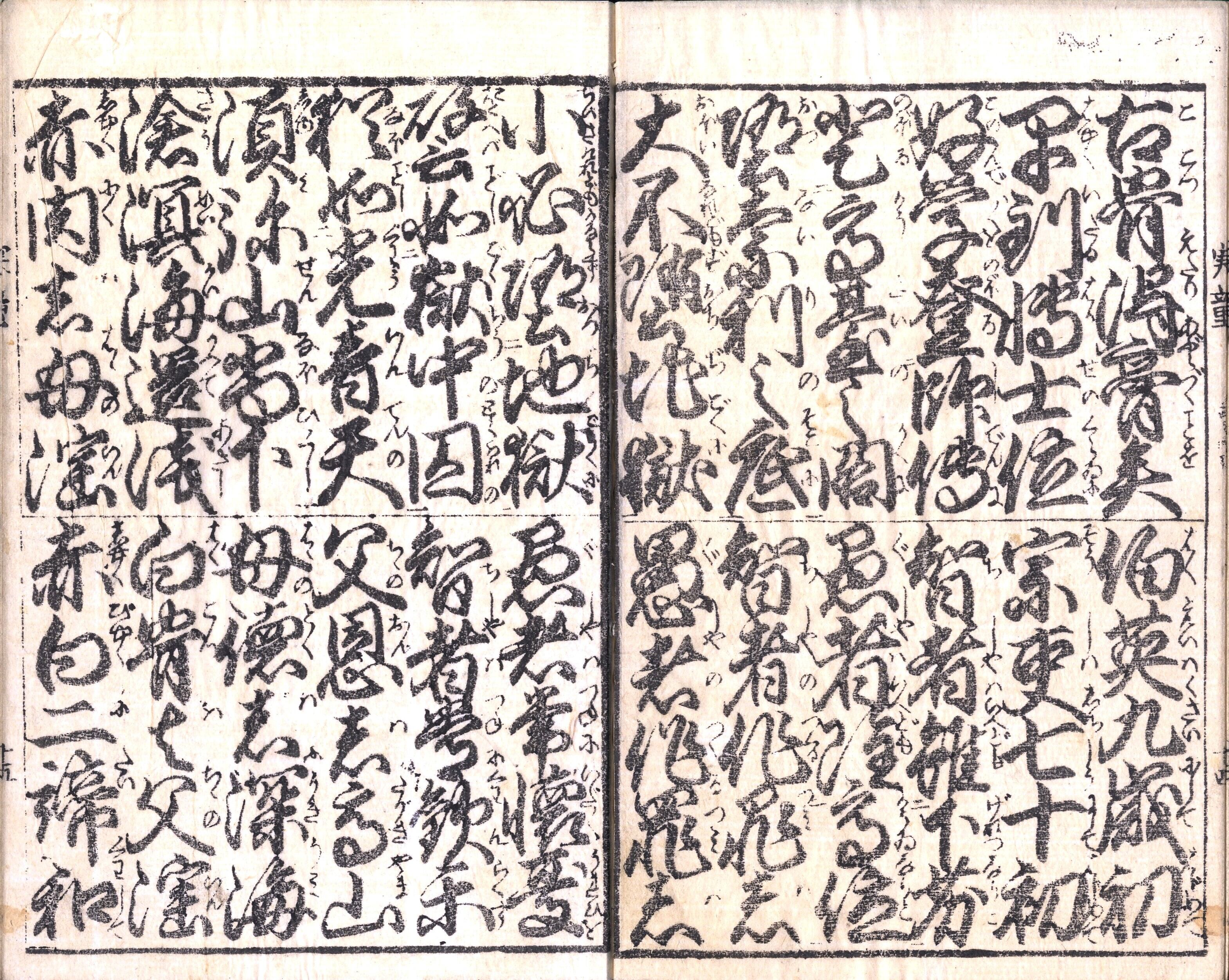 【備考】分類「往来物」。同板別本も抄録した。『実語教』は平安末期作、『童子教』は鎌倉前期作と推定される往来物で、いずれも漢字5字1句、2句一対を基本とする文章で綴った金言集。『実語教』が「山高故不貴、以有樹為貴…」で始まる96句、『童子教』が「夫貴人前居、顕露不得立…」で始まる330句からなる。内容は、『実語教』が主に「智」を礼讃し学問のあらましを初学者に諭す勧学教訓であるのに対し、『童子教』はこの世の因果の道理や儒仏の教えを諭した幼童訓・処世訓となっている。両教とも暗誦に便利であったために寺子屋教育でも広く教授されるとともに、二教中の多くの語句が俚諺・格言として庶民に深く浸透した。なお底本は『実語教童子教』の本文を6行・付訓で記し、表紙見返に「五常之事」を掲げる。