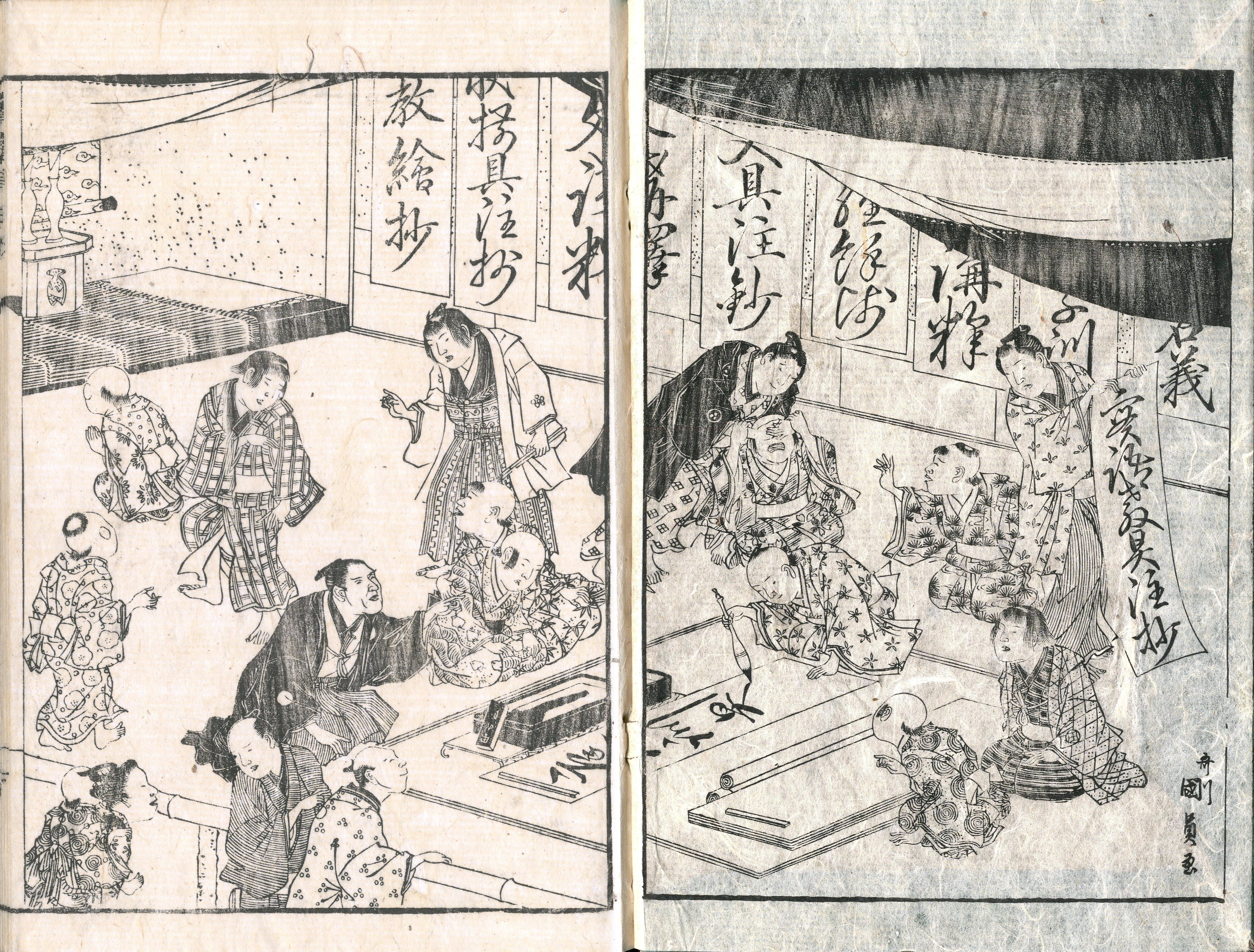 【備考】分類「往来物」。巻頭に刊行年代を示す書体を掲げ、後半に同板別本を抄録した。『〈首書読法〉実語教童子教具註鈔』は、口絵に「席書図」を載せるほか、頭書に多数の挿絵を施した簡易な注釈書。天保14年刊『実語教童子教具註抄』(山崎美成注)の海賊版ともいうべき嘉永3年刊『実語教童子教精注鈔』の頭書に若干の挿絵を加えただけの改編版(ただし異板)。『精注鈔』の嘉永3年序文に代えて狭川半水の序文を掲げ、口絵に寺子屋の席書風景を描く。また、頭書挿絵に異国の貿易商人を描くのは時代を反映していて興味深い。本文の数句毎に『具註抄』『精注鈔』と全く同じ割注を付す。なお、刊記に刊年を明記しないが、書袋に「慶応乙丑夏新刻」と記す。