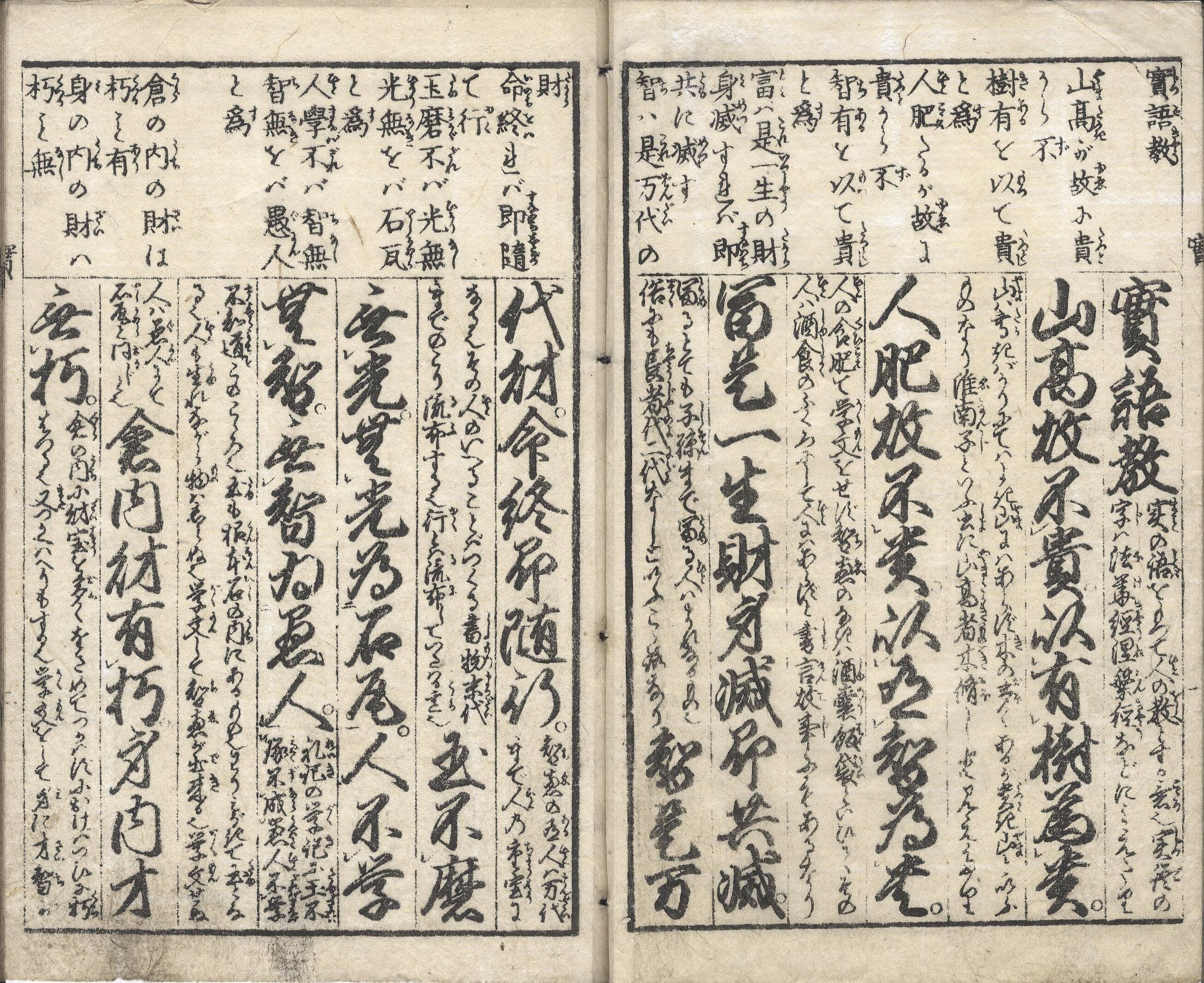 【備考】分類「往来物」。寛文4年刊『〈新板頭書〉実語教・童子教』や天明5年刊『〈註釈絵入〉実語教童子訓』を参照して編んだと思われる注釈書。二教本文を1句ないし5句ずつ掲げ(大字・7行・無訓)、比較的簡単な割注を施したうえ、頭書に同本文の読方(書き下し文)を付す。口絵に弘法大師の図と二教の由来を載せる。
