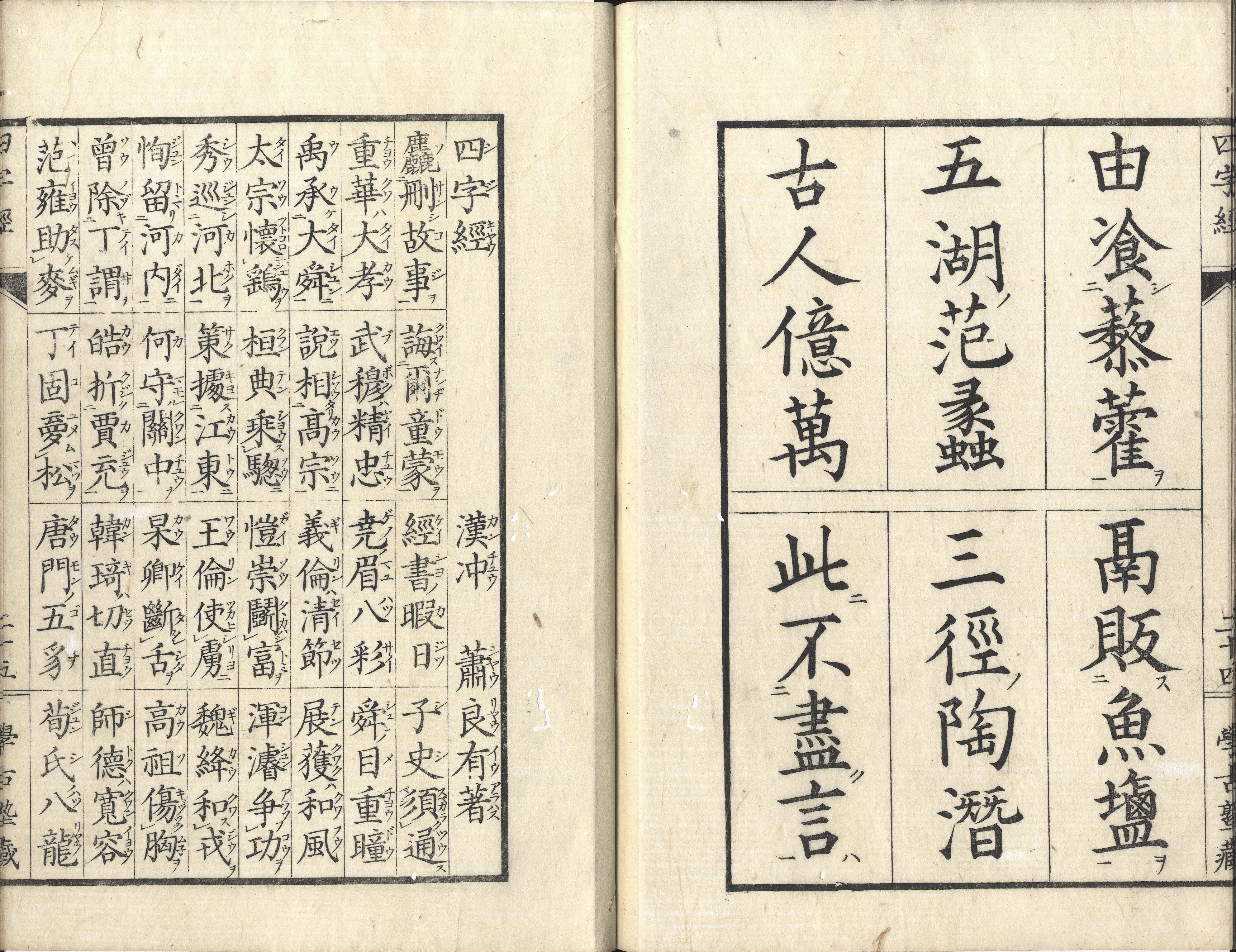 【備考】分類「往来物」。漢字四字一句の形で中国文化の発展に貢献した前賢の名・姓・字・号などを列記した教科書で、日本でも往来物として広く用いられた。本書は『四字経』本文を楷書・大字・三行・無訓で記し、巻末に小字・九行・付訓の本文読方を付したもの。