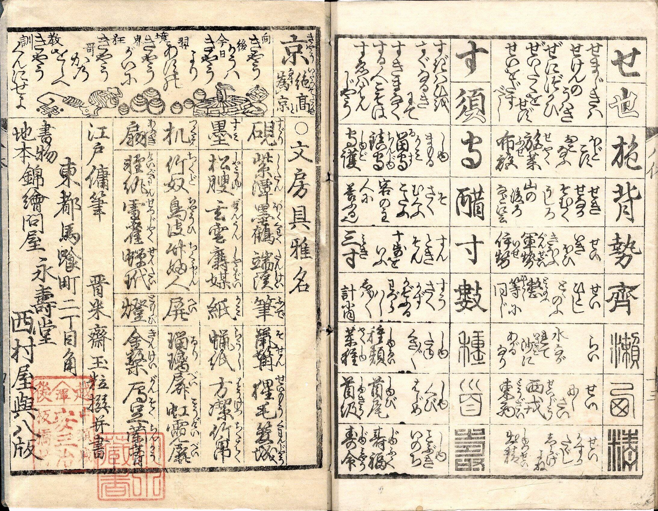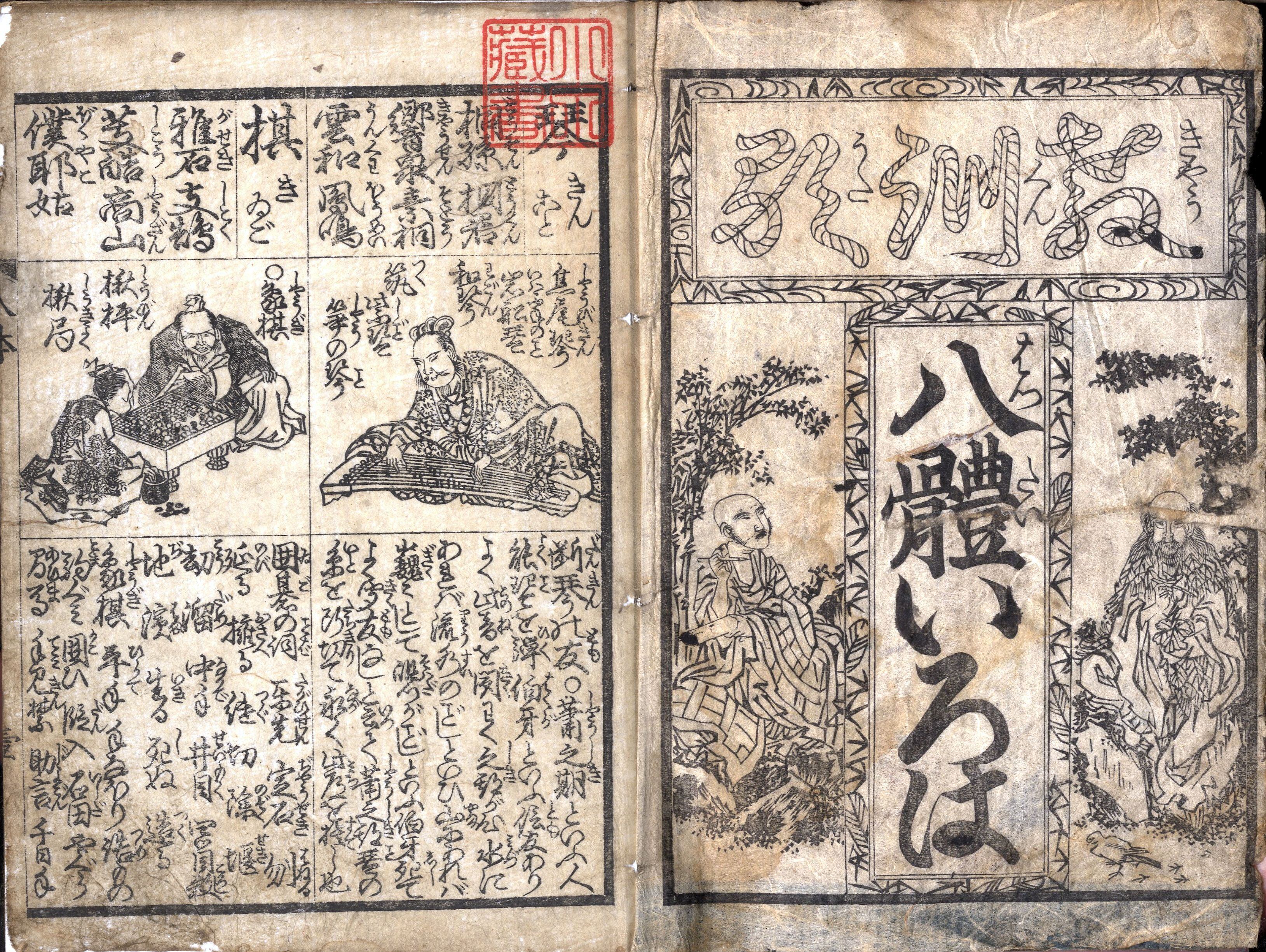 【備考】分類「往来物」。初印本と後印本の2種を全冊収録した。五・七・五・七・七の各句の冒頭が同音になるイロハ教訓歌と、イロハ毎に同音の漢字など八種八体を列挙した往来。半丁を左右半分に分け、さらに上下八段に界線を設け、一行目に平仮名と片仮名(片仮名の字母となった漢字を掲げ、そのうち片仮名の部分を白抜き字で示す)、続いて漢字七種、例えば「い」の項は、「以・夷・畏・委・意・異・謂」を上から順に草書・行書・楷書・隷書・篆書(小篆)・篆書(大篆)・角字の七体で示す。また二行目に「いましめの、いちとすべきは、いろとよく、いたづらごとや、いつはりをすな」のような教訓歌(弘法大師作と仮託する)と、先の漢字七体毎の音訓やその漢字を含む熟語を載せる。巻頭に「琴・棋・書・画」の異名と類語を紹介するほか、巻末に「文房具雅名」を掲げる。