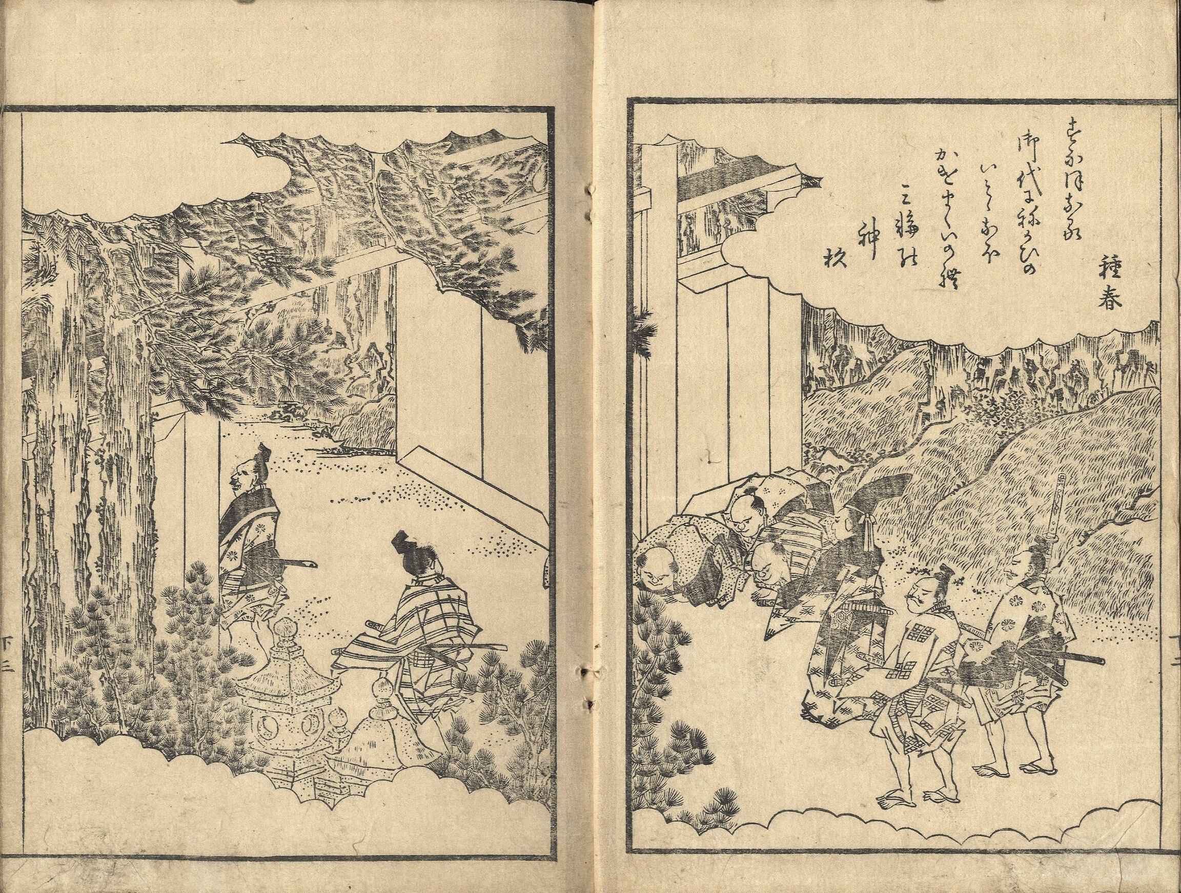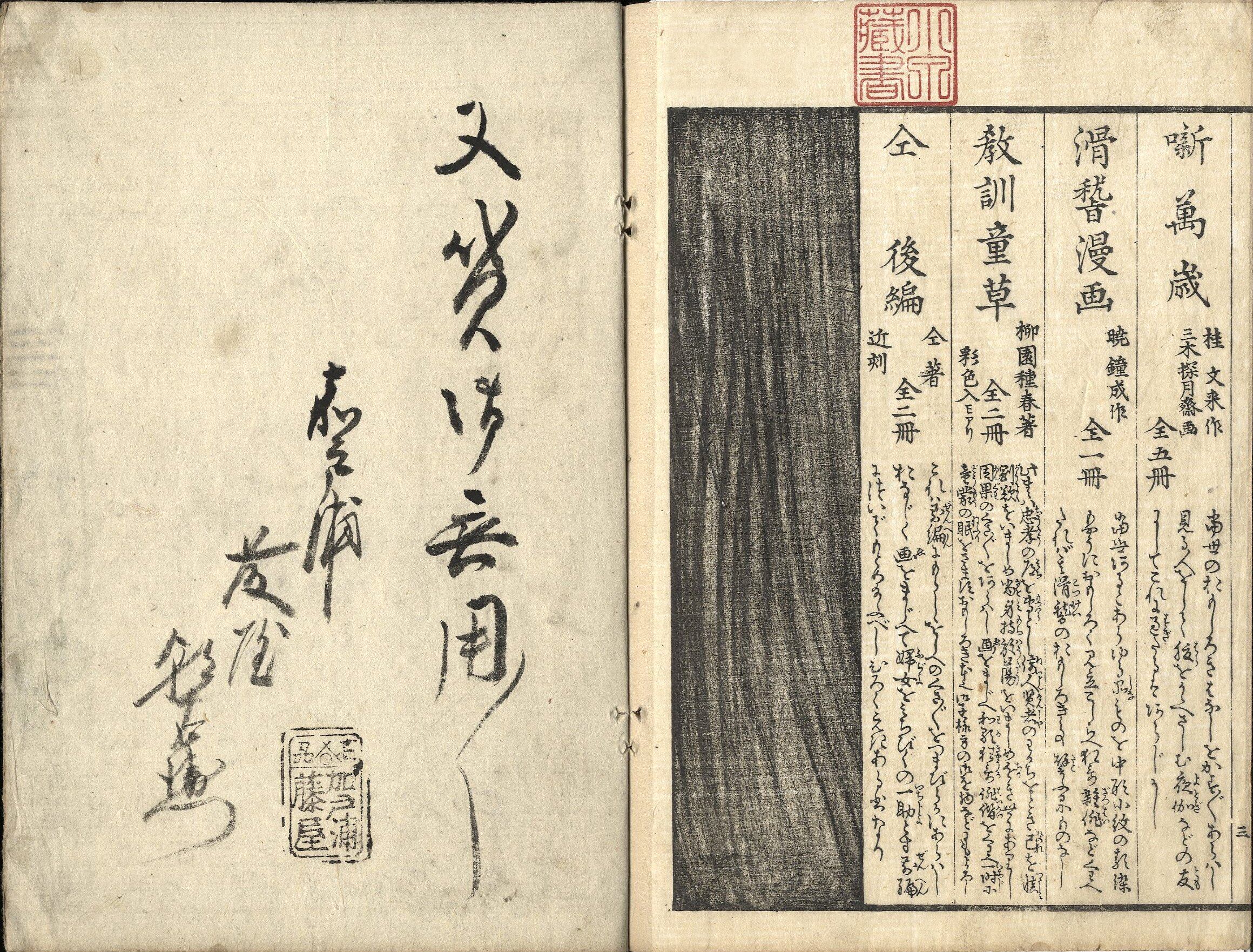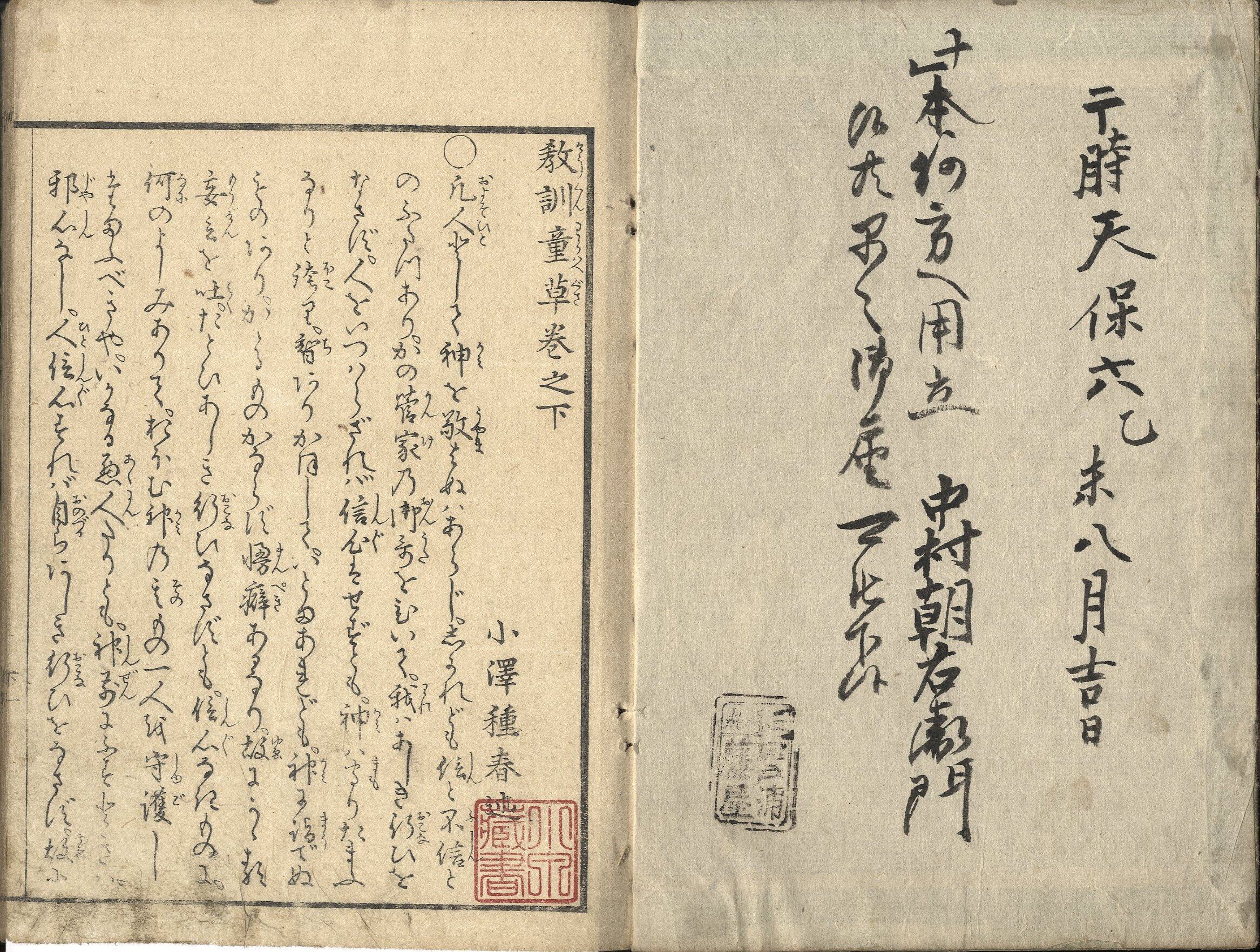 【判型】半紙本2巻2冊。縦225粍。【作者】小沢種春(柳園種春・簾屋豊蔵・子敬・東陽)作。暁鐘成ほか画。旭小蓬莱序。【年代等】文政10年1月刊記。同年3月序・刊。[大阪]土佐屋喜兵衛ほか板。【備考】分類「往来物」。故事・略伝・逸話など作者が見聞した話を集め、随所に図解や教訓歌等を添えた教訓書。上・下巻で約50話を載せる。上巻は国恩、軍書講釈、先祖の艱難辛苦、不足銭(賃金ピンはね)、約束厳守、借用品の返却、勤勉、孝行、親の高恩、色欲、夫婦和順、悪妻、商人の風流と礼儀等についての訓話、下巻は信心、信仰、智者と侫人、偽言、明徳の人(貝原益軒)、楠公の清忠明智、報恩、勇気、学問出精、主従の心得、北条泰時、遁世、和歌の道などの諸説から成る。巻末広告に「此書は忠孝の道を専とし、侫人・賢者のわかちをとき、己を慎、剛欲をいましめ、尚、身持放蕩をいましめ、近き世にありし因果のくさぐさをあらはし、画をまじへ、和歌・狂歌・誹諧をくわへ、一時に童蒙の眠をさます、おもしろき本也。御子様方の御進物などにもよろし」とあり、特別仕立ての彩色本も宣伝している。