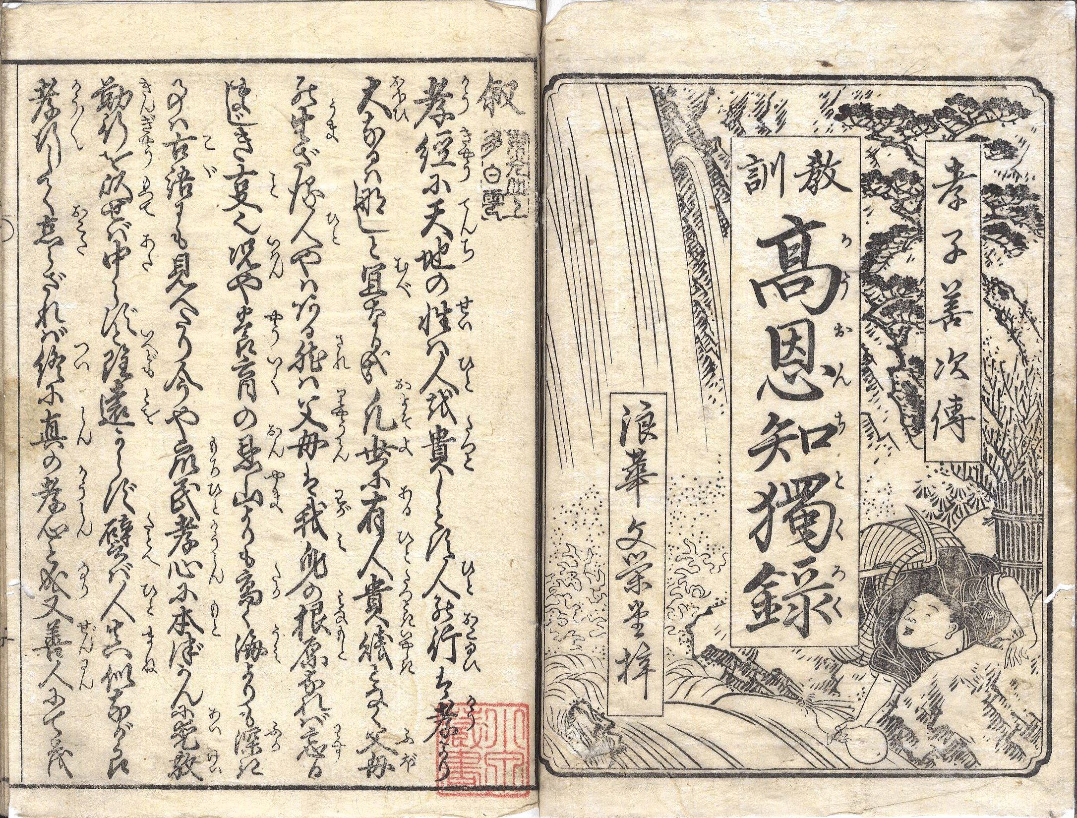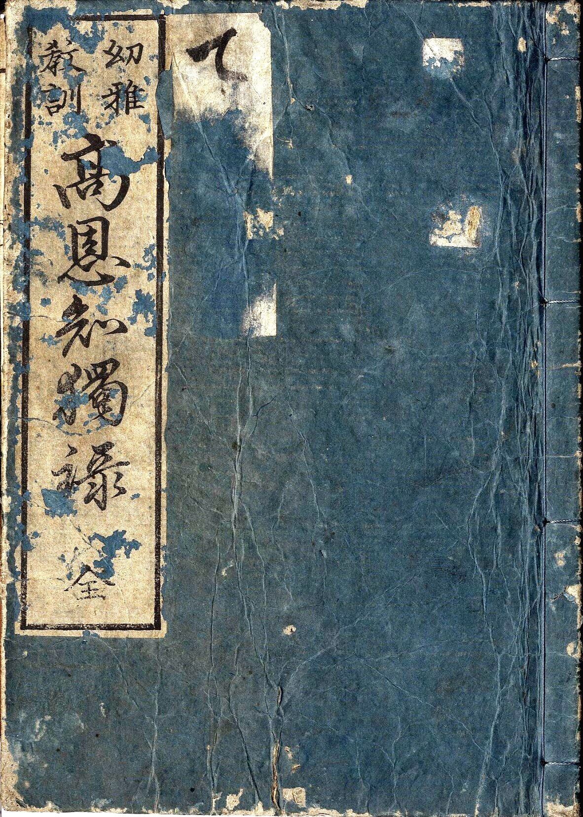 【備考】分類「往来物」。『〈幼稚教訓〉高恩知独録』は、生涯にわたる父母の高恩を述べ、その恩に報いるための孝のあり方を一孝子の事跡を通して述べた教訓書。前半では、懐胎十月から手習い学問・諸芸の教育、そのほか諸般にわたる両親の大恩について切々と説き、それに対する報恩としての孝行が実行し難いことを自己の反省も含めて述べる。続く後半では、日野鍛冶町の孝子・善次の行状や寛政10年に領主から襃賞されるまでの経緯を縷々紹介する。なお、本書の挿絵を担当した止斎は善次の同郷人という。