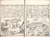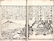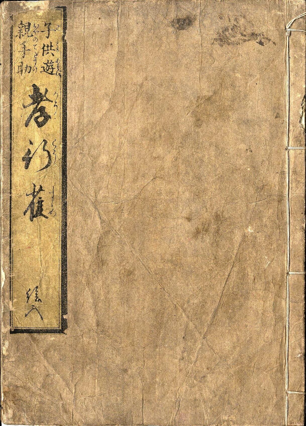 【備考】分類「往来物」。『〈子供遊・親手助〉孝行雀[孝行すゞめ]』は、孝子伝や教訓歌などを集めた絵入り教訓書。①近江国木村朝治・楠木正成・源為朝などの孝子小伝・忠臣伝・武勇伝、また、②『観音経和談抄図会』から抜粋した建仁寺・東鋭大和尚伝、さらに、③『実語教』より「父母如天地」「師君如日月」「神明致再拝」「見善者速行」「人者死留名」の五句を抽出して解説した「実語教五訓」や、④その他教訓歌・古歌などを収録する。上段に解説文を小字・16行・付訓で記し、下段を見開きの挿絵とする。本書は同じ頃に堺屋仁兵衛から刊行された、天保9年刊『〈道歌教訓・童蒙早合点〉一休狂歌雀』や同10年刊『〈道歌教訓・童蒙早合点〉狂歌雀後篇』と酷似した体裁で、これら一連の往来物を辻本基定が手掛けたものであろう。
