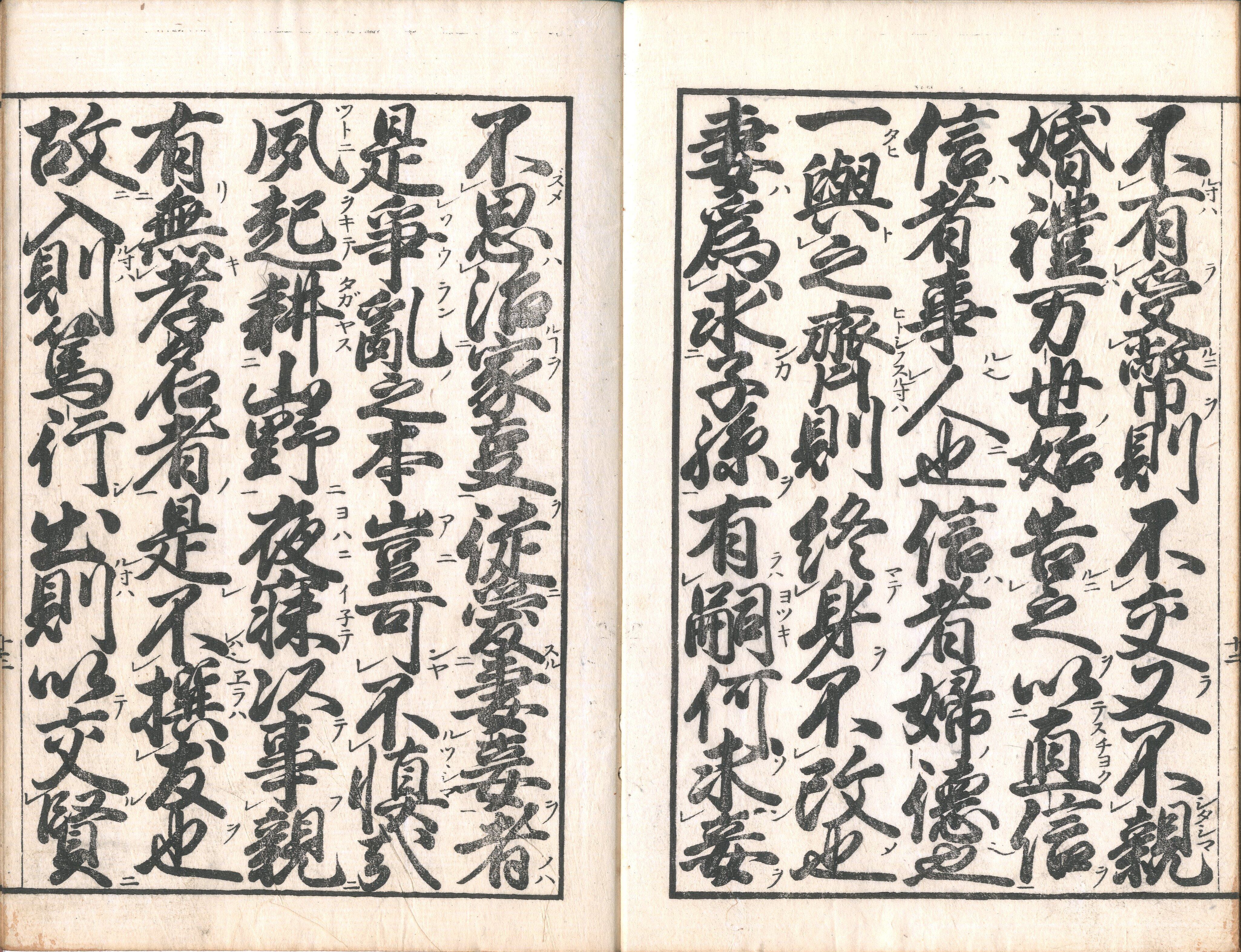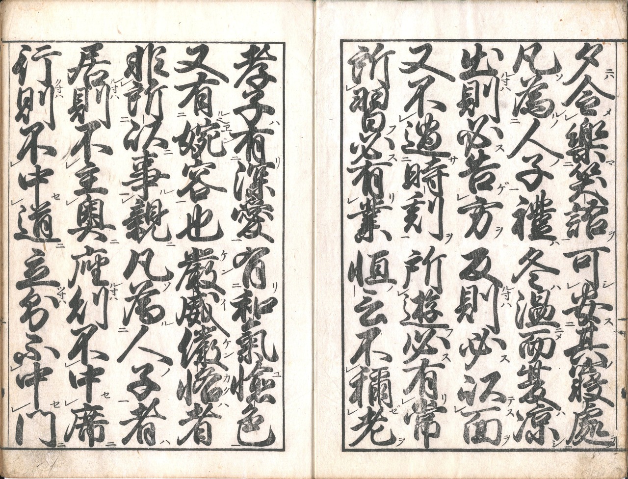 【備考】分類「往来物」。異板を含む3種を収録。『孝子教』は、漢字5字1句を基本とする『実語教』形式で、儒教経典によりながら「孝」のあらましを説いた往来物。「夫、孝百行源、又万善長也、忠者自孝出、孝至徳要道…」で始まる594句から成る。まず、一日の生活やあらゆる状況下での孝行のありようを縷々述べ、「惰其四肢而」「博奕好飲酒」「好財私妻子」によって父母の孝養に努めないなど五つの不孝や、三千の罪の中で不孝が最大の罪であること、あらゆる悪行・悪徳が不孝になることなどを諭し、孝子・君子と不孝者・小人を対照させながら抽象的な教訓を展開する。なお、本書の注釈書に天保7年作・明治14年刊『孝子教鈔解』(高井蘭山注)がある。本文を大字・5行・稀に付訓で記す。