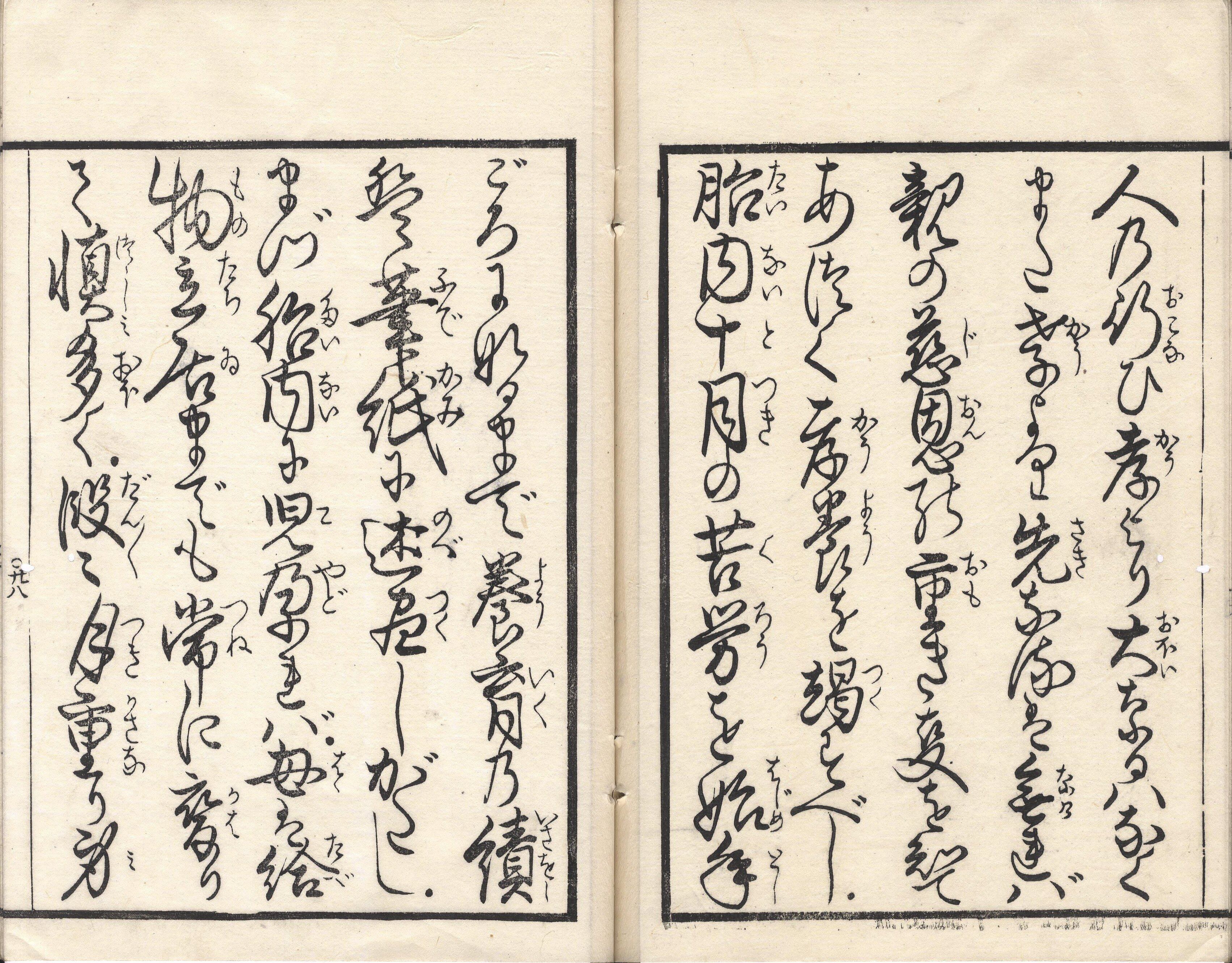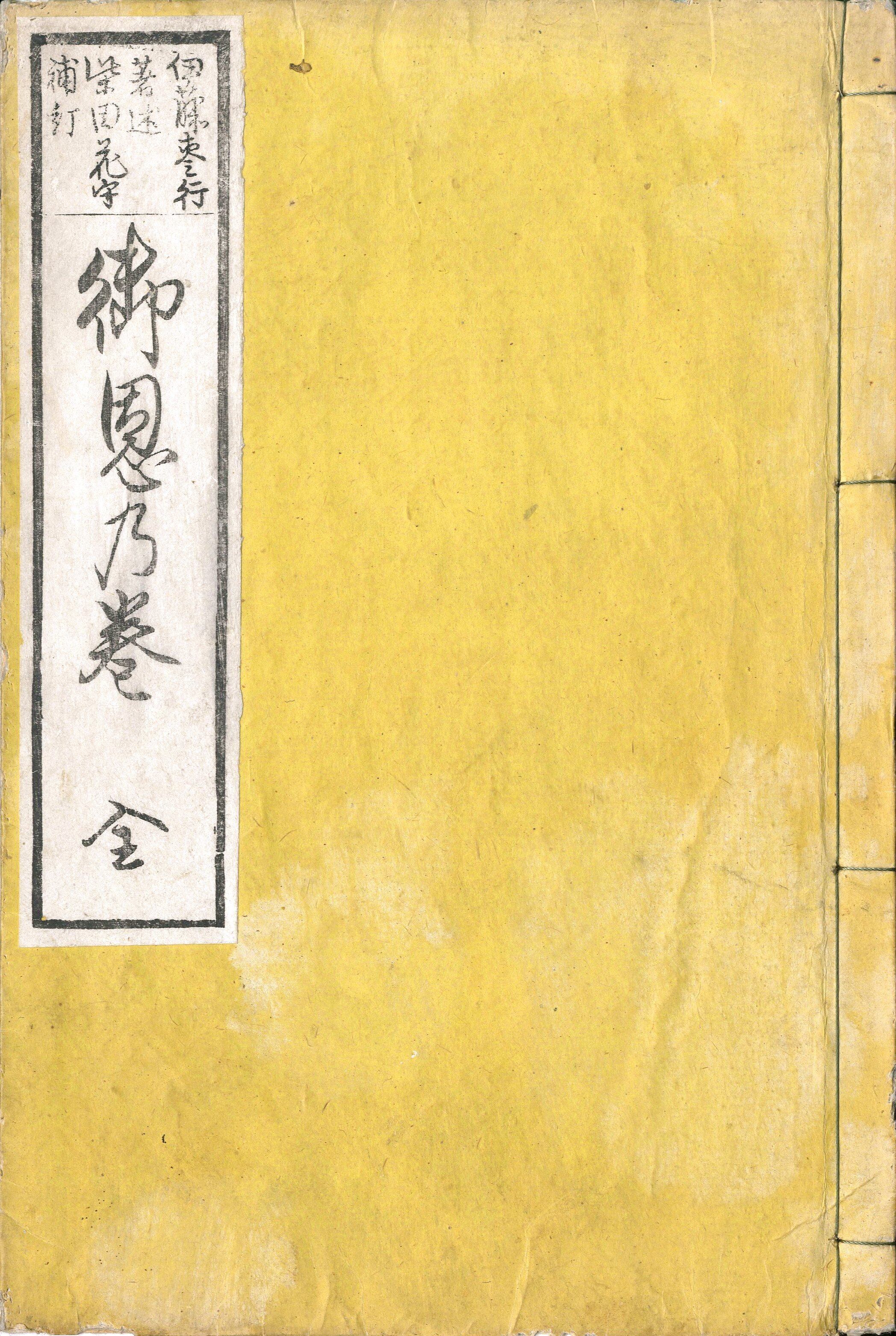 【備考】分類「往来物・神道」。題簽違い本など3種を収録。『〈小学必読〉御恩乃巻』は、「父母の、御恩の深きお恵み、ねてもさめてもわするなよ、まづあさおきてみをきよめ、もとのちゝはゝをがみつゝ…」で始まる七五調の文章で、「日夜身に蒙る所の種々の恩頼を酬奉る事を懇に諭し示し」た教訓書。大父母(もとのちちはは)の御恩・日輪の御恩・泰平の御恩・主人の御恩・師匠の御恩・親の御恩の6章に分けて、それぞれの高恩と報恩のための具体的目標を示す。本文を大字・5行・付訓で記す。巻末に上記の教訓を敷衍した「子傅謡(こもりうた)」を掲げる。『四民教諭』と同様に、文化年間に参行が著した遺稿を明治期に上梓したもの。