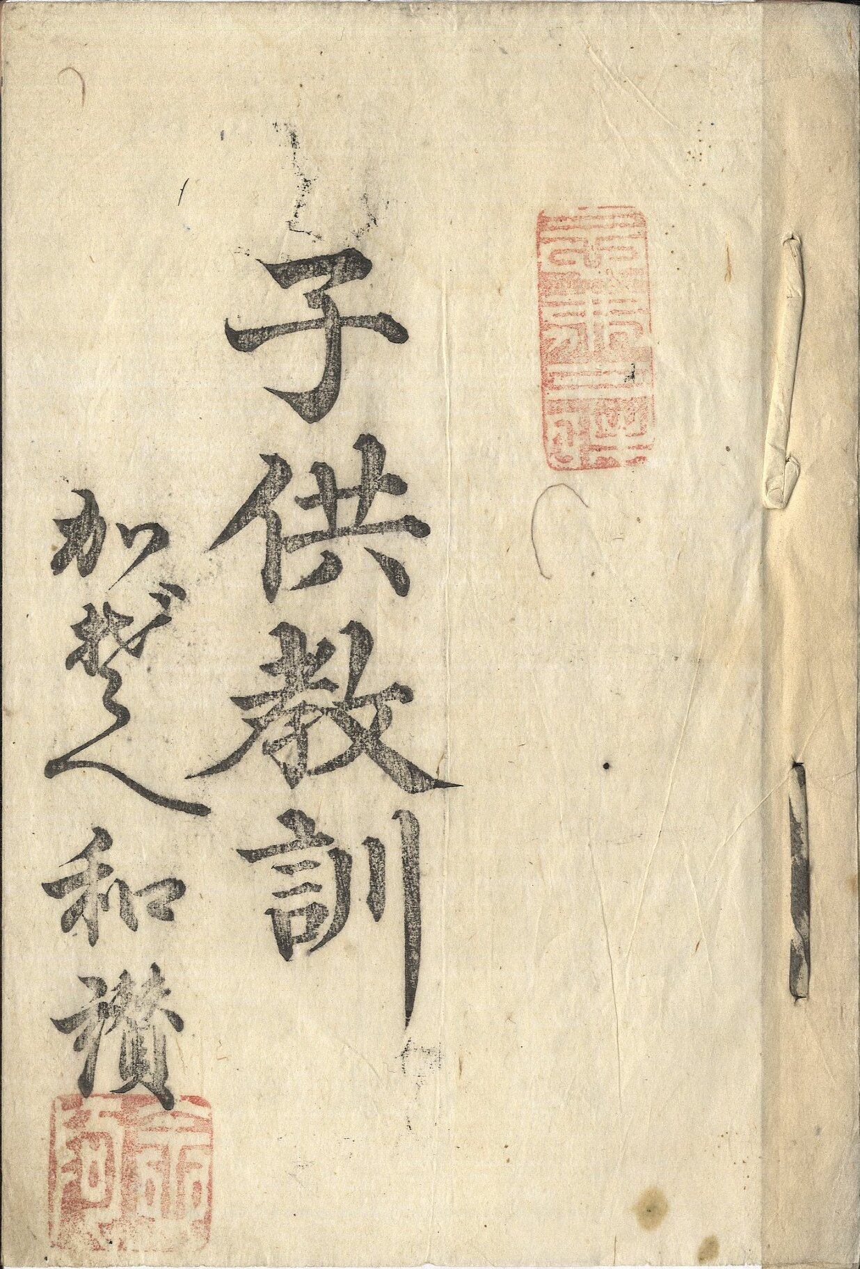【備考】分類「往来物・教訓」。「子供教訓〈いろは和讃〉」と「子供教訓〈かぞへ和讃〉」は和讃形式と数え歌形式の教訓書。「子供教訓〈いろは和讃〉」は、「いのじとや、一生だいじのりんじうの、よふゐをせざるはふかくなり、南無阿弥陀仏あみだ仏」「ろのじとや、六方諸ぶつをすゝめます、うへなきくどくの念仏ぞ、南無阿弥陀仏あみだ仏」のように、各和讃の第一音がイロハ順になるように配列した浄土宗系の童蒙教訓書。勧善懲悪、善根功徳を始め、公儀遵守、知足、分限、質素倹約等の世俗的道徳も説く。いずれも数え歌風の和讃で、半丁(1頁)を4分割して4首ずつ、合計48首を収録。本文共紙に刷り表紙の簡易な製本(仮綴じ本)である。また、「子供教訓〈かぞへ和讃〉」も数え歌形式の教訓で、同様のレイアウトで「一ッとや、一人しにゆくしでのたび、みちあんないはたれたのむ、南無阿弥陀仏あみだ仏」から、「四十八ヤ、八功徳ぢのこんれんに、ほどなくむまれん身ぞたのし、南無あみだ仏、あみだ仏」までの48番を収録する。