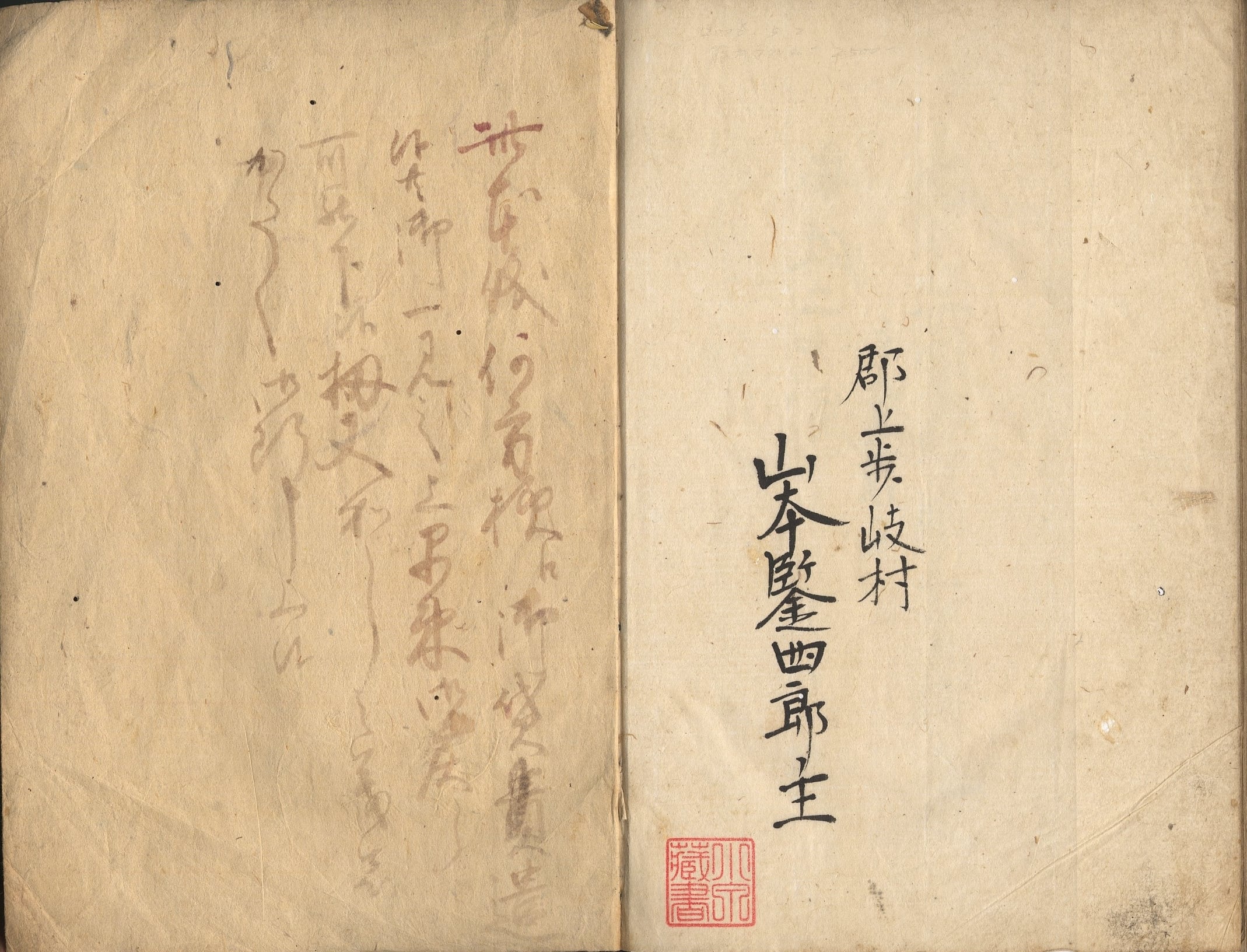 【判型】大本2巻合1冊。縦264粍。【作者】原三省(二間手村住人、手習師匠か)作。序。【年代等】安政2年1月書。【備考】分類「往来物」。二間手村(現・郡上市)に住む作者が地域の庶民子弟用に編んだ往来物。上巻は全10カ条、下巻は全編1カ条の教訓文から成る。上巻は、まず「一、春暖之時分に相成候節より蓑・荷縄・鎌を用意し、布半纏を着し蚕飼、杪を伐初候より、相続て小き簣を肩に懸け…」と書き始めて、家業の手伝いに出精すべきことや、往還の人々に対する心構えを説くほか、盗みの戒め、他家での食事マナー、火遊びや喫煙の戒め、他家訪問時や法話・参詣時の心得、刃物の扱いや用水路での悪戯、水遊び等の注意、人づきあいや病気見舞の心得などを説く。また、下巻では、飲食・飲酒・色欲に関する養生心得を詳述する。公衆道徳や社交マナー、また、養生心得に重点を置くのが特徴で、「童子及成人候に付者、祝儀・不祝儀之礼儀、其外、家業日々之用向に付而は、一者間に合、一に者事馴候様にと、為苗代可差遣候」と子供を一人前にする親の心得も諭す。末尾に山本鑒四郎(歩岐島村*現、郡上市)の記名、また、裏見返に「此本儀、何方様江御貸遣候共、御一見之上、早速御戻し可被下候。扨、又がし之義はかたく御断申上候」の朱筆がある。