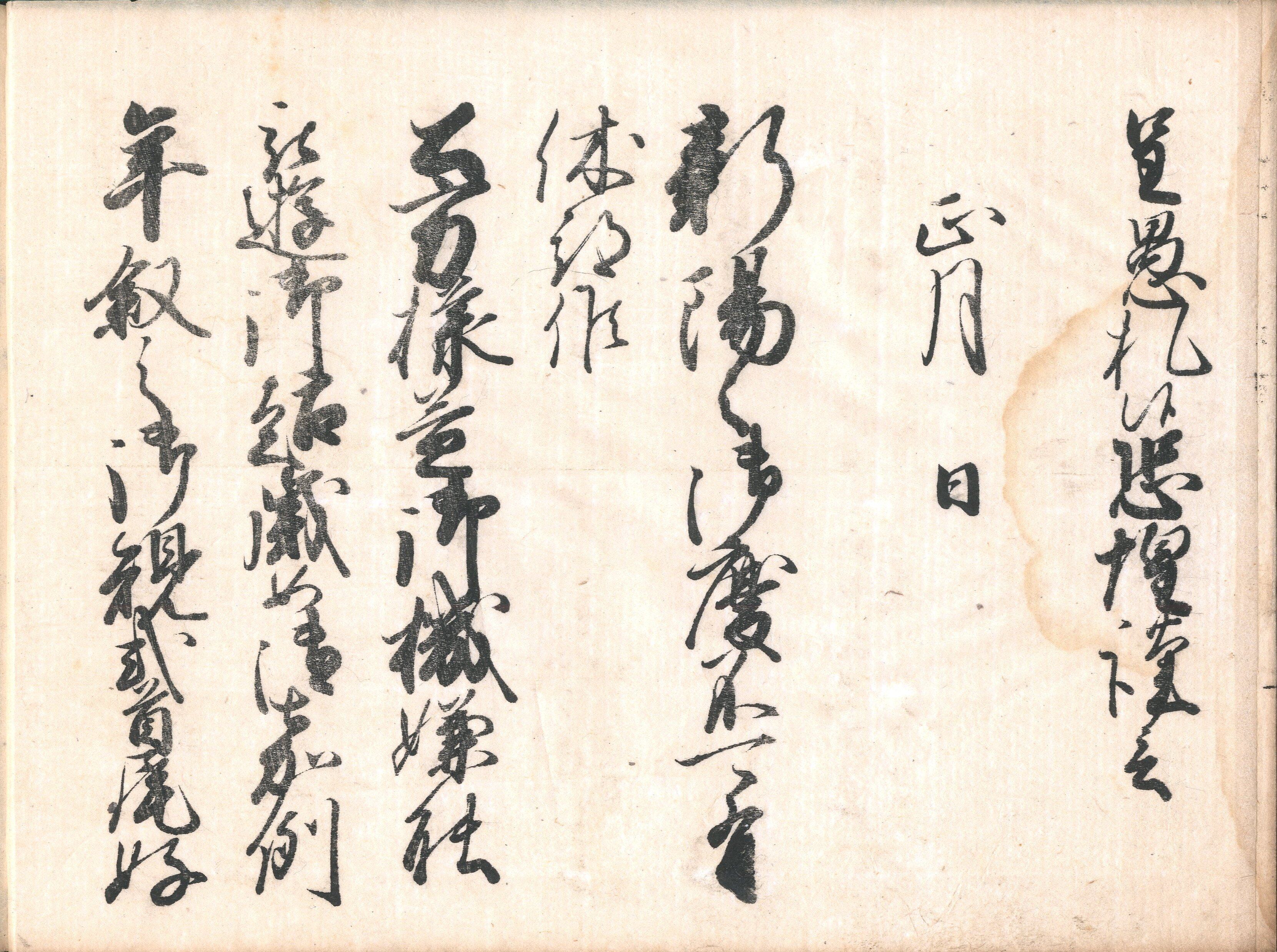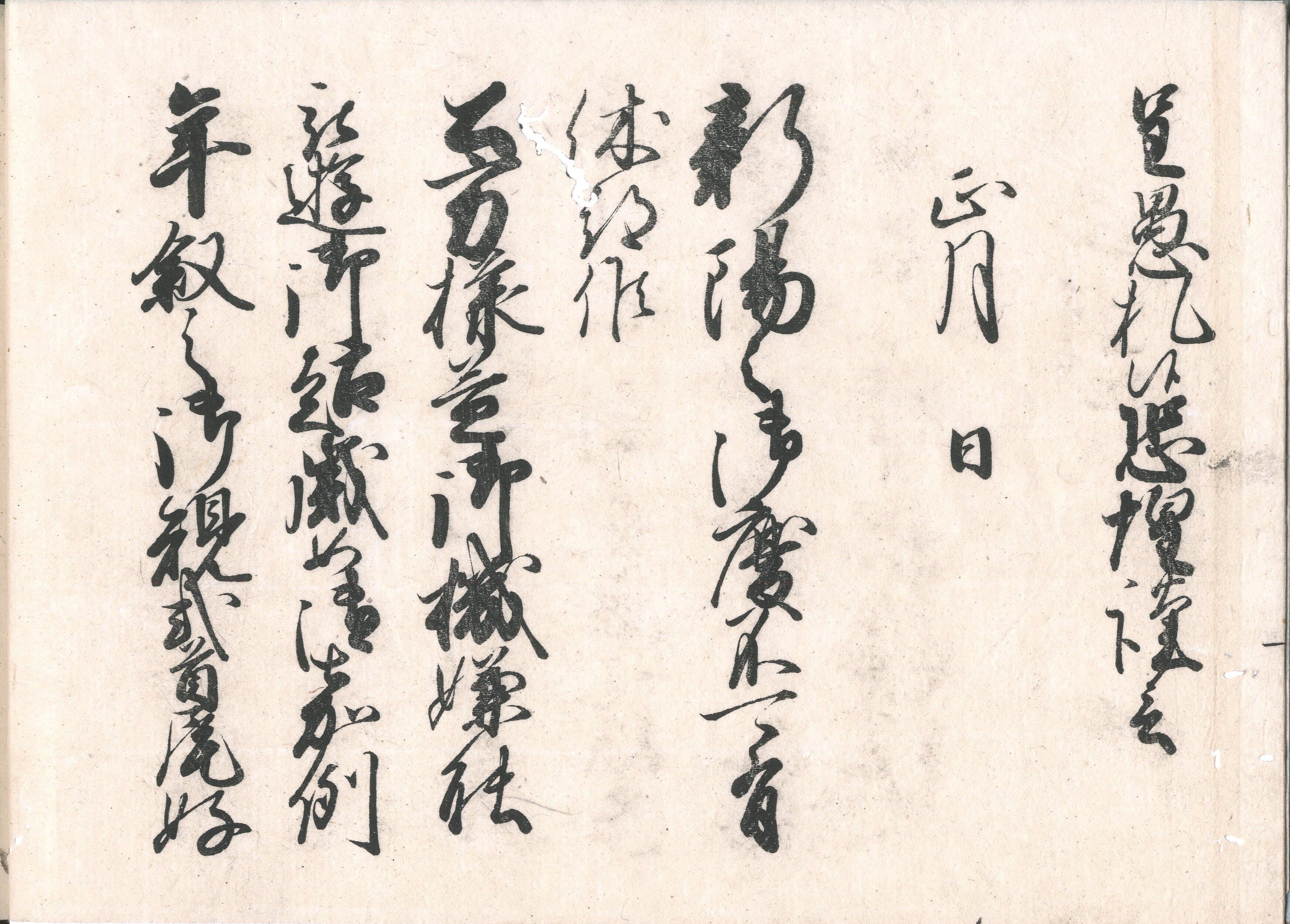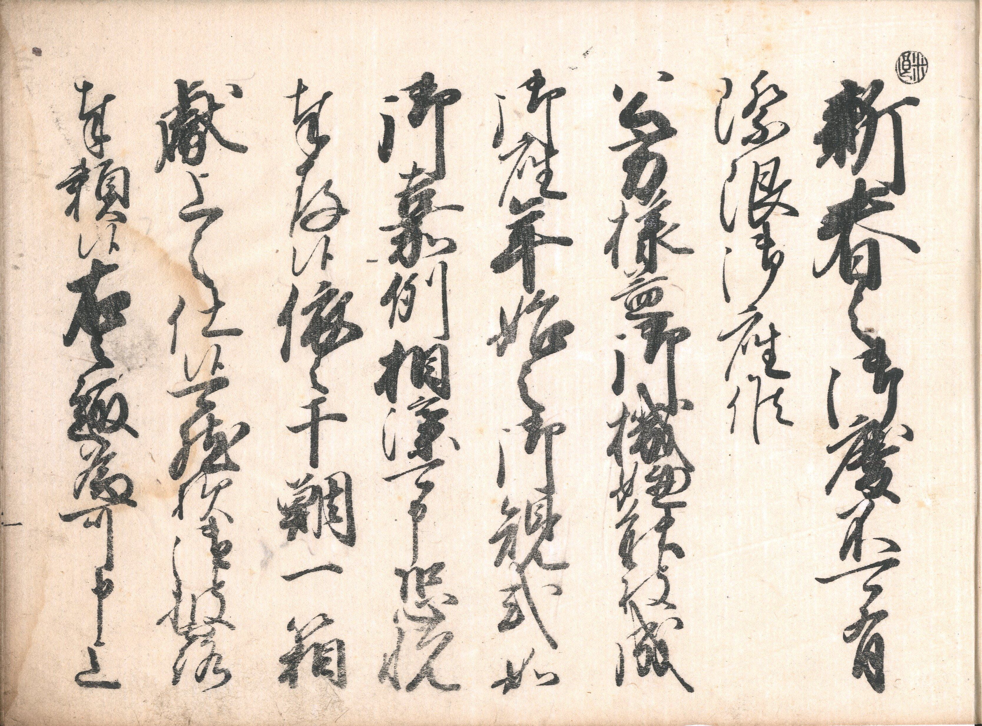 【備考】分類「往来物」。同板別本も抄録した。本書は「新春之御慶不可有際限御座候…」で始まる新年祝儀状(披露状)以下39通の消息(準漢文体・和文体)と詩歌8編を綴った手本。本文を大字・8行・無訓で記す(詩歌は5行程度)。冒頭に披露状など武家公用の最高位の例文数通を掲げ、続いて美酒嘉肴の礼状や湯治見舞状、その他四季消息文等の私用文、最後に並べ書き・散らし書きの仮名文数通を収録する。巻末に「青蓮院宮御門弟/芝泉堂先生書/泉栄堂蔵板目録」と題して、芝泉堂および門人筆の手本24本の書名を列挙する。