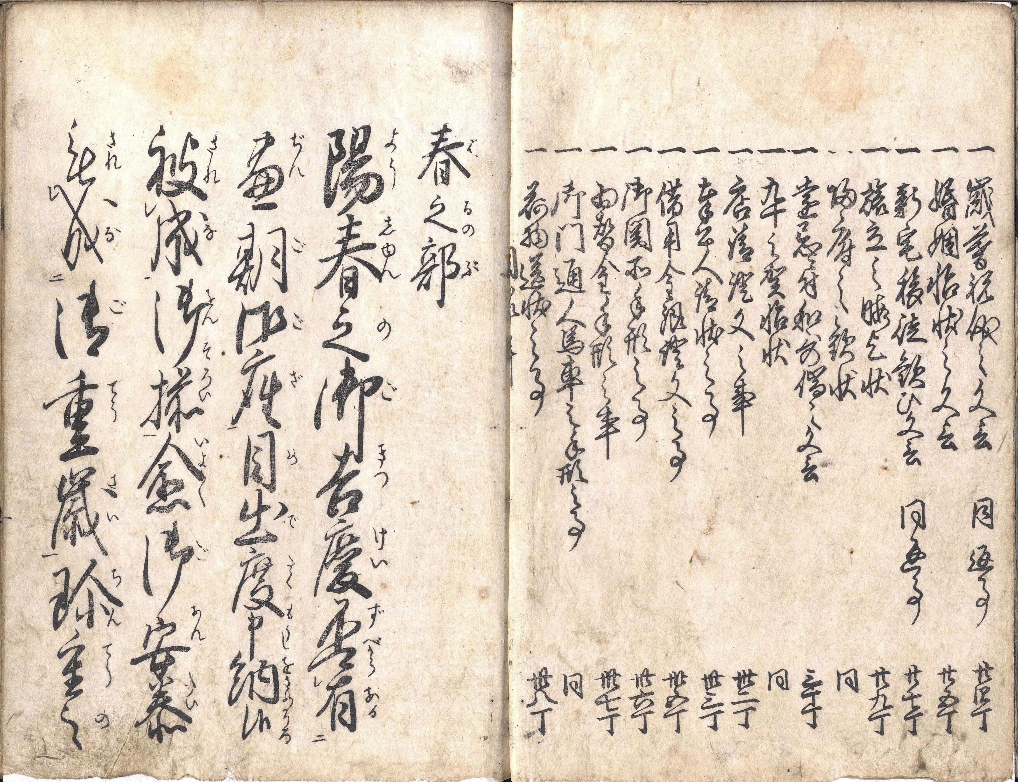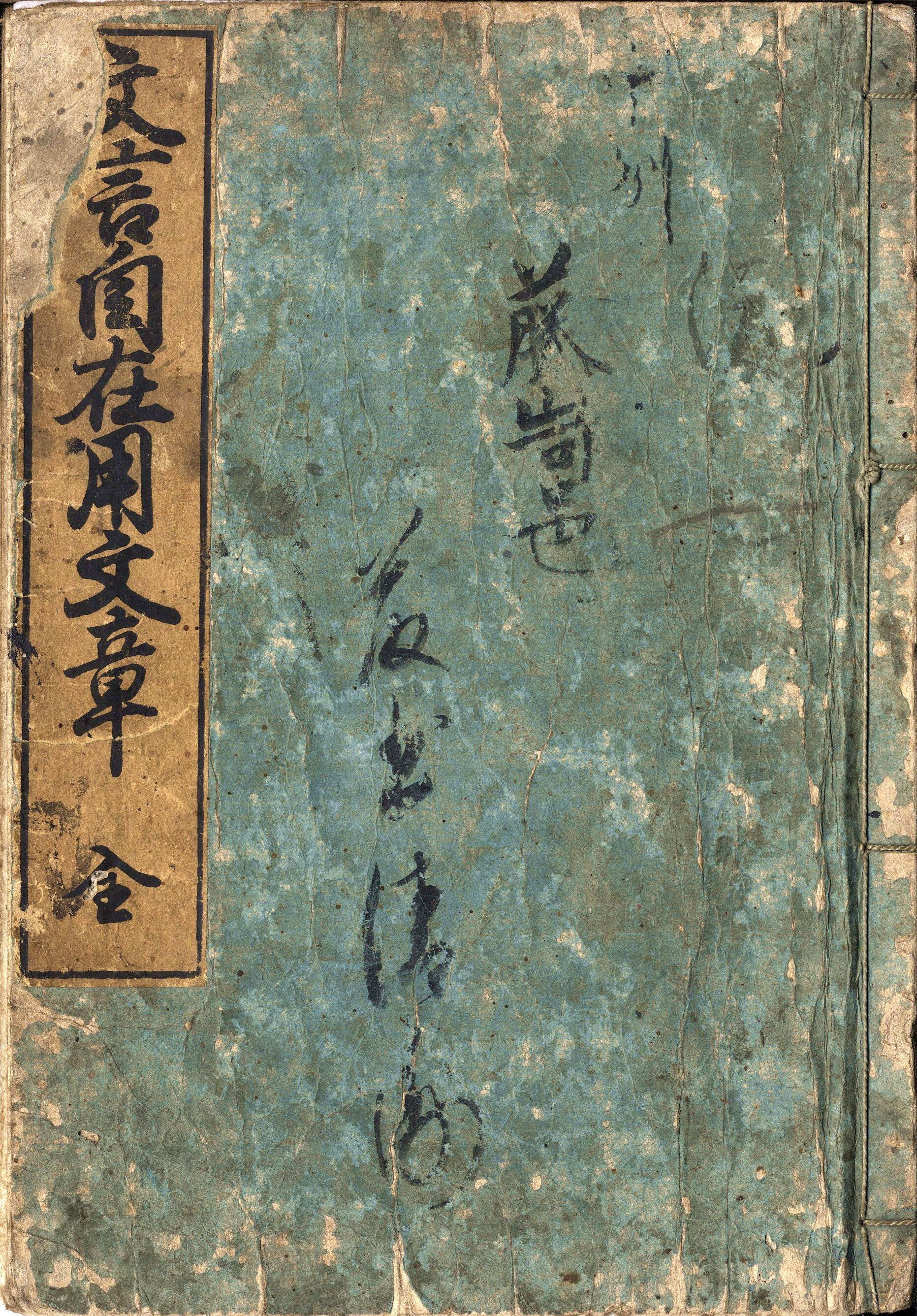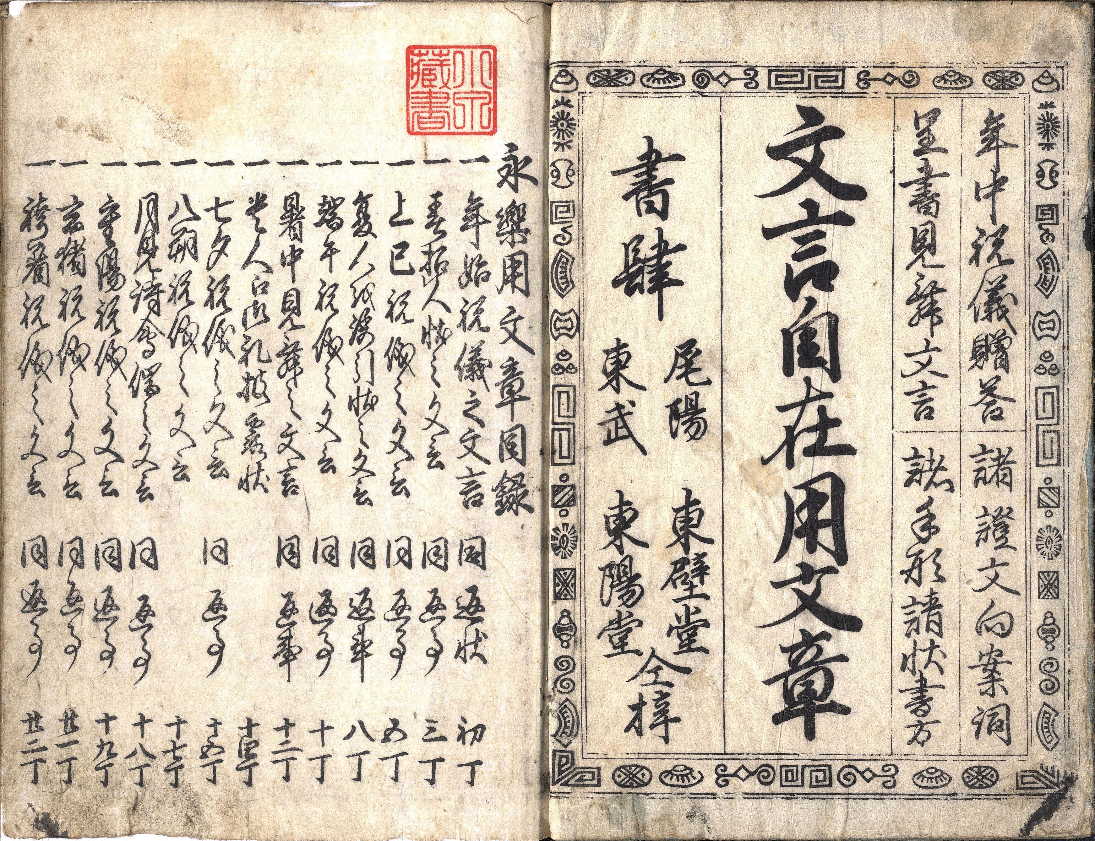 【備考】分類「往来物」。後印本の書袋と本文も抄録した。「年始祝儀状之文言」から「九十之賀怡状」までの消息文例33通と、「店請証文之事」から「荷物送状之事」までの7通の手形証文類文例を収録した用文章。春・夏・秋・冬・雑の五部に分けて配列するように、季節や年中行事に関する手紙が大半で、ほかに通過儀礼や種々用件に関する手紙若干を載せる。例文を大字・5行(証文類は8行)・付訓で記す。なお、目録題に『永楽用文章』と記すのは、本書の先行書を指すか。
