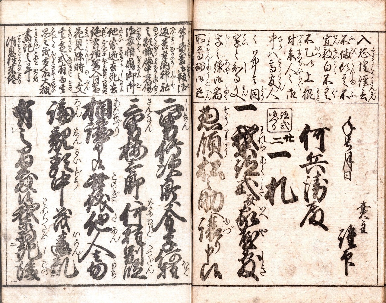 【備考】分類「往来物」。『万証文手形便覧』は、「金子借用証文」から「跡式譲り状」までの証文類文例22通を収録した手形証文文例集。本文を大字・5行・所々付訓で記す。頭書には「証文認之心得」「屋号尽」「苗字尽」「消息往来」「仏法宗名」を掲げ。巻末に「十干・十二支」「月異名」を載せる。なお、嘉永頃刊行の『商人書状鑑』の後半部に本書を合綴したものがある。