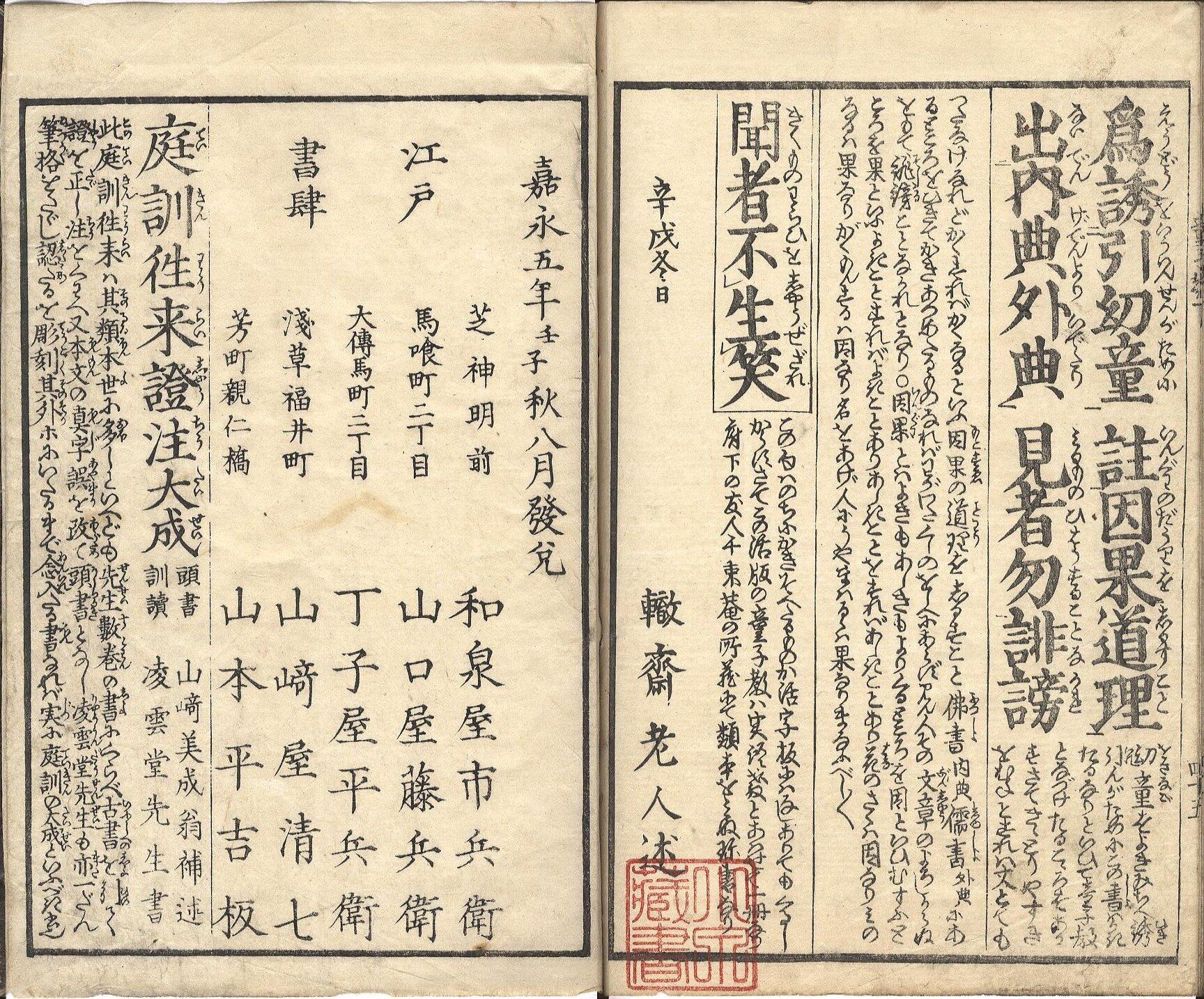 【備考】分類「往来物」。初印本。題簽傍書「心学近道/幼童手引」。下巻末尾に「辛戌」とある。嘉永3年庚戌の誤りであろう。