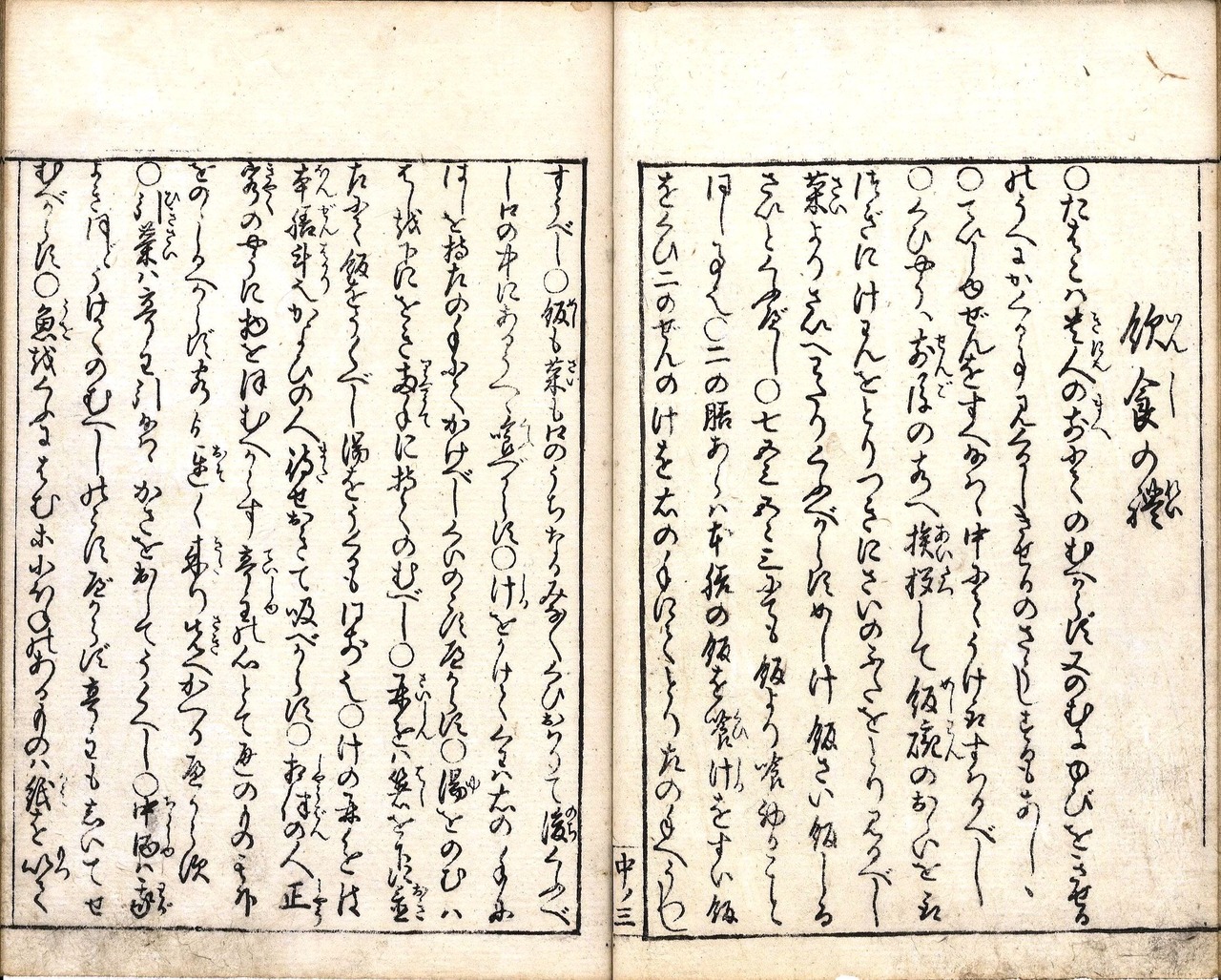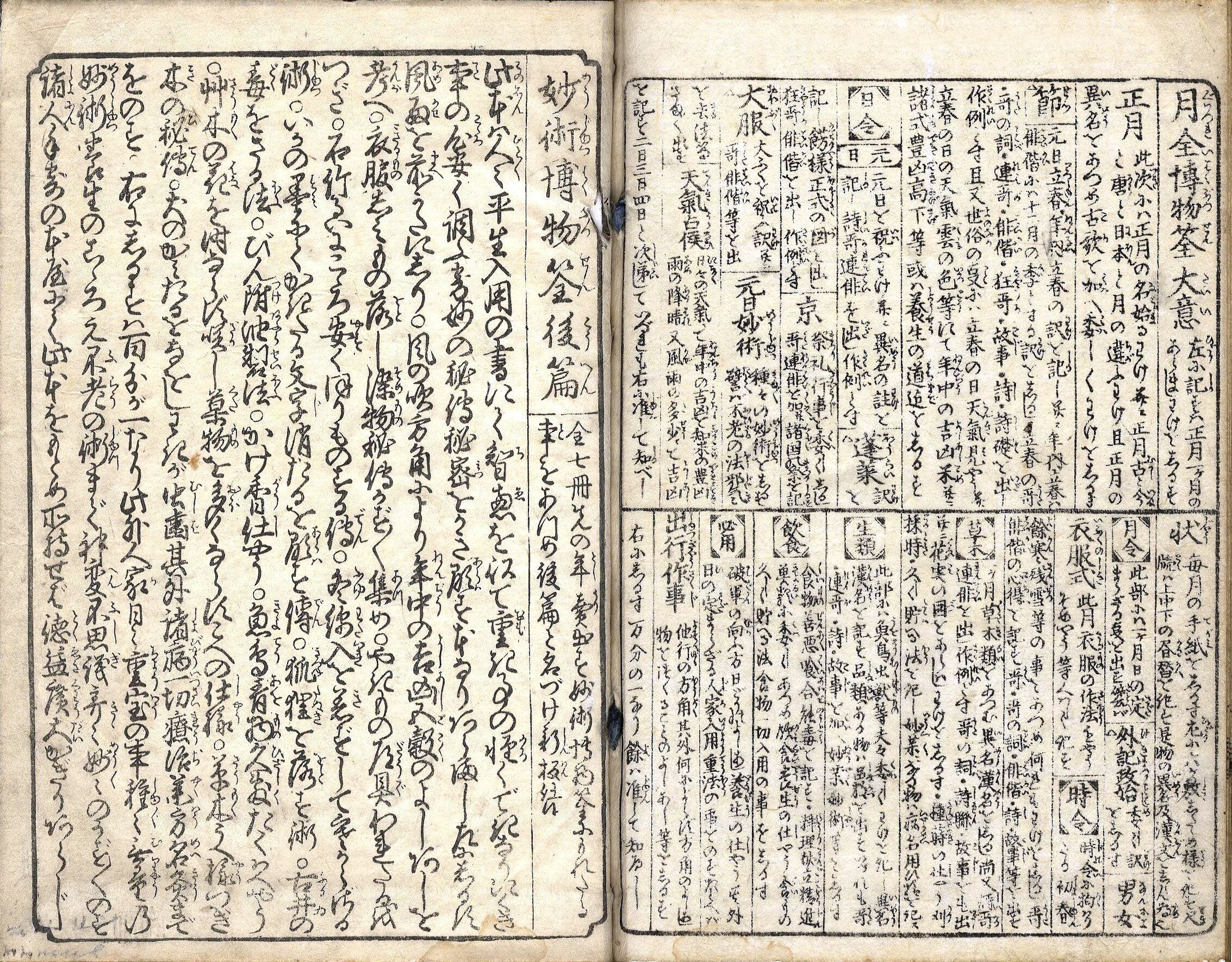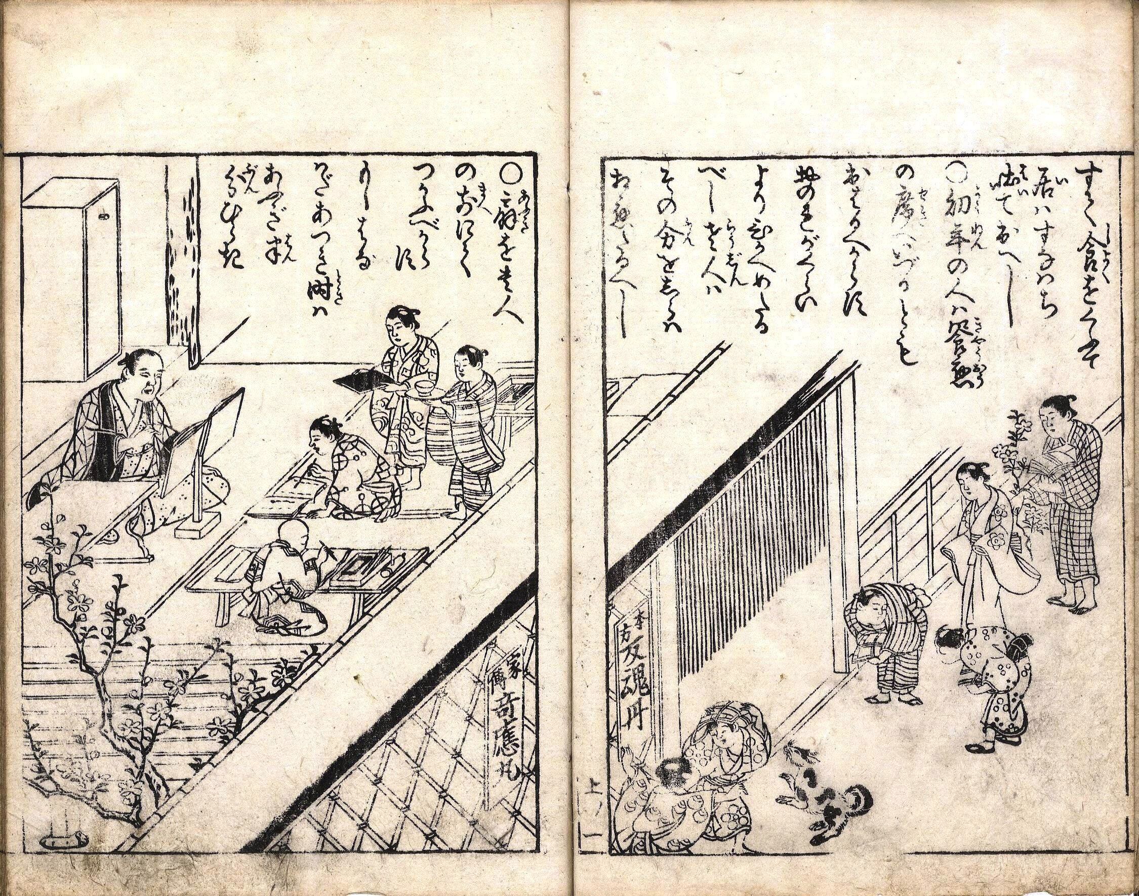 【備考】分類「往来物」。宝暦6年頃刊『絵本諸礼訓』(鳥飼酔雅編、月岡丹下(馬渕丹下)画)、明和8年刊『〈人間〉記憶秘法』(久保田雲亭編)、寛政8年刊『状文章』(書台閣編、鈴木忠侯書)の板木を集めて一冊とした教訓書。全5章から成り、第1章「諸礼の次第」と第2章「当流躾方」はもと『絵本諸礼訓』で、「路次(みち)・座敷贈答(おくりこたえ)の礼」「饗応亭主心得之事」「通(かよい)乃次第」「喫茶の礼(せんじちゃのむれい)」「飲食(いんしい)の礼」「盃乃礼之事」「元服乃礼」「当流躾方五十箇条」の諸礼を挿絵を交え簡潔に説く。第3章「物覚能成伝(ものおぼえよくなるでん)」はもと『〈人間〉記憶秘法』で、呉門先生相伝の暗記法である「記憶伝」「擬託法」「種子法」「種子図」「器物験証」「心法」「無形(むぎょう)・有形(うぎょう)」「繁文」「源氏験証」「限法」「惣論」「万象記認法(ものみしりのほう)」の12項について述べる。第4章「かな文章」と第5章「用文章」はいずれも『状文章』相当部分で、前者(頭書)の前半「かな文章」は各月毎の往復24通の消息文例、後半「ちらし書文章」は3段・5段・7段各様の散らし書き文例を収録する。一方後者は『状文章』の本文で、「年始之状」以下各月往復文24通と移徙・元服・安産・振舞・餞別の祝儀状5通の合計29通を収録する。以上のように総合的だが通俗的な礼法書である。なお、『絵本諸礼訓』に『絵本岩手山』『絵本言葉花』『素室小諷』を合わせて5冊本とした『諸礼教訓文庫』が明和4年頃、大阪書肆・吉文字屋市兵衛から刊行された。