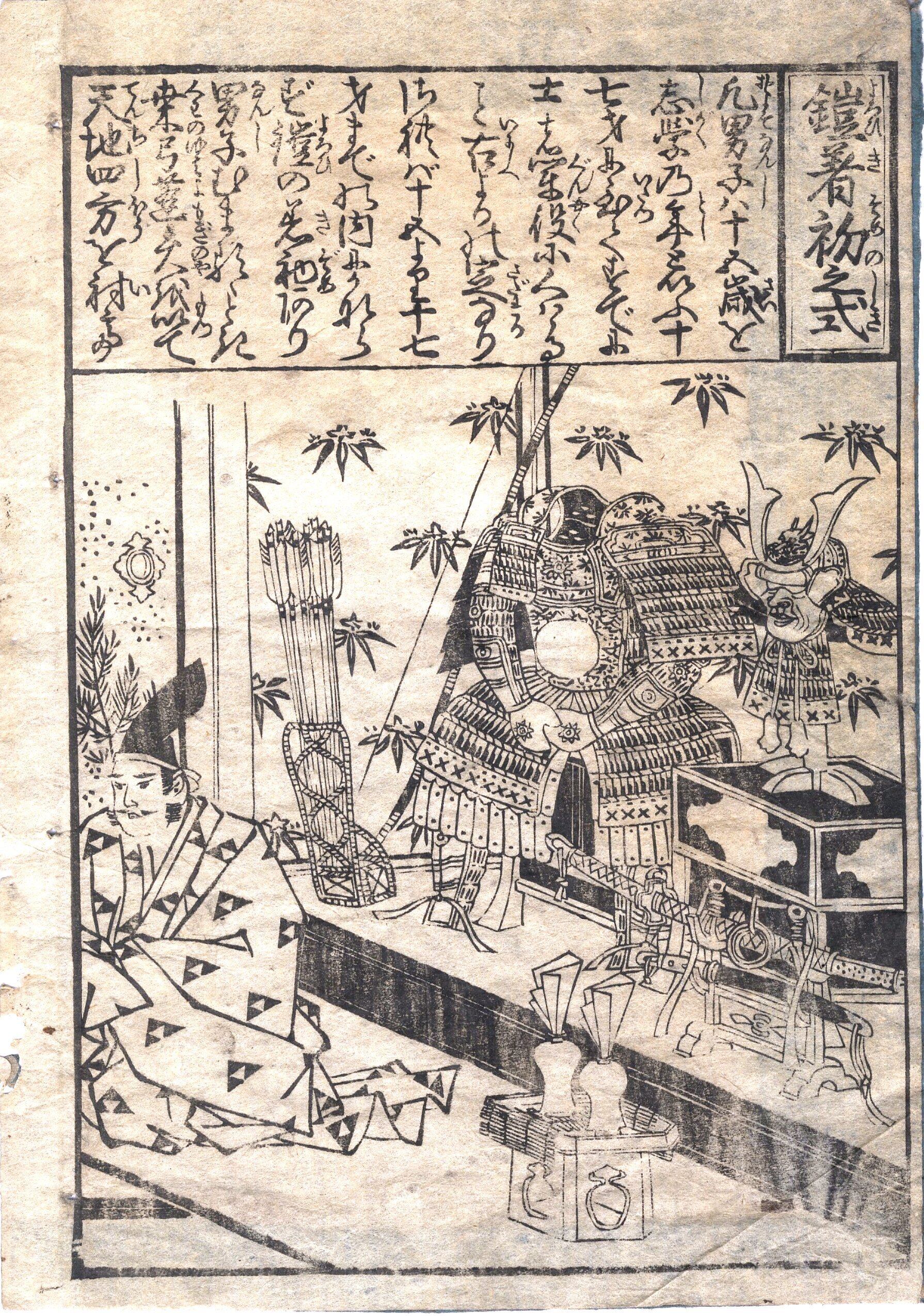 【備考】分類「往来物」。早印本と後印本の2種を全冊収録(後印本は袋綴じ展開収録)。『武具短歌文章[軍器歌訣文字鎖]』は、甲冑各部の名称や形状を始め、武具・馬具全般、甲冑その他戦闘服に関わる語句を列挙した往来。「抑、武器は多かりし、中にとりわけ第一に、冑は首の鐙にて、其名所も数多し。四天響に吹返し、鎬垂(しのだれ)・去死巻(こしまき)・冑の緒…」で始まる本文は、以下七五、七五と続く文章の冒頭と末尾の字音が前後で連なる「文字鎖」形式で、同本文を大字・5行・付訓で記す。巻頭に「鎧着初之式」に関する挿絵と説明を付す。また、巻末広告に玄竜作『〈図解〉軍器歌訣』(本書の図解という)を載せるが未詳。