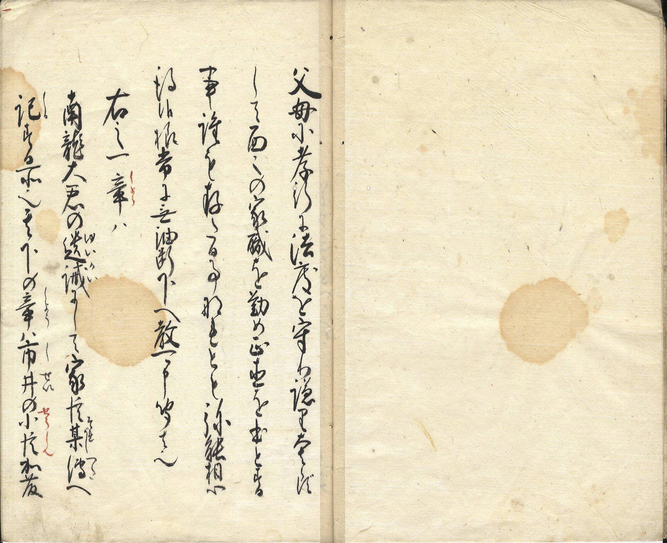 【備考】分類「往来物」紀州藩初代・徳川頼宣(南竜公)が万治3年に著した『父母状』の注釈書。加納大隅守政直家に伝わる『父母状(御教諭)』の伝本に、門人の沢辺九郎右衛門重矩の求めにより加藤重昌が施注した。「父母に孝行に法度を守り、謙り、奢らずして面々の家職を勤め、正直を本とする事、誰も存たる事なれども、弥能相心得候様、常に無油断、下へ教可申聞者也」という『父母状』の全文を冒頭に掲げ、まず、その由来に触れたうえで、8段に区切った本文に詳細な注を施す。例えば冒頭の「父母に孝行」の説明だけで約7丁を費やすように、一言一句の内容を丁寧かつ平易に敷衍するのが特徴。『父母状』は、父を殺した熊野のある男が獄中3年間に『孝経』の講義を聞いて改心し、初めて自らの罪を自覚したという事件から、政教の重要性を痛感した徳川頼宜が領民に示した教訓とされる(これを疑問視する説もある)。本文は父母への孝行・法度遵守・分限・倹約・家督出精・正直の6項を説いた短文だが、長く紀州藩の政教の根本とされ、高札で周知徹底が図られたほか、寺子屋の手習本として普及した。