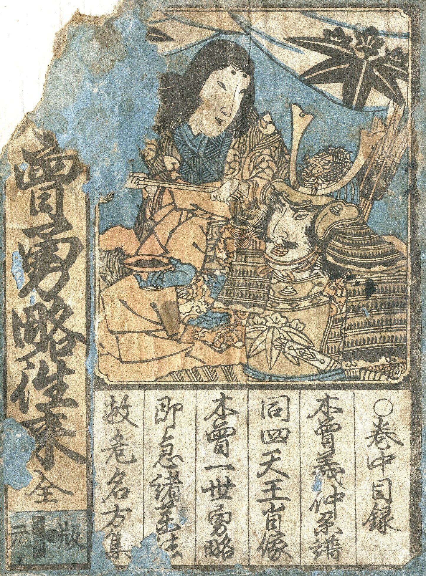 【備考】分類「往来物」。同板3種を収録。十返舎一九が著わし、江戸書肆・山口屋が出版した一連の伝記型往来の一つ。原装本と改装本の2種を全冊収録。冒頭に絵題簽を掲げた。『平家物語』『源平盛衰記』等で知られる木曽義仲の略伝を綴ったもので、義仲の出自や幼い頃父・義賢が滅ぼされた後、斉藤実盛によって保護されたこと、元服後は「木曽冠者義仲」と名乗り、やがて以仁王の令旨によって信州で挙兵し、倶利伽羅峠の戦いで平維盛の大軍を火牛の奇襲により打ち破ったこと、しかし入洛後の義仲の横行と略奪により源頼朝が義仲追討の兵を起こし、ついに粟津ヶ原で戦死したことなどを劇的に綴る。また同本文中で義仲を「希世被誉の英将」「勇謀智兼の良将」と賞賛する。本文を大字・5行・付訓で記し、文末を「恐々欽白」で終わる書翰形式とする。頭書等に、義仲一生の名場面の挿絵や、「即急諸薬法」「旅行する時用意の品大略」等の記事を掲げる。